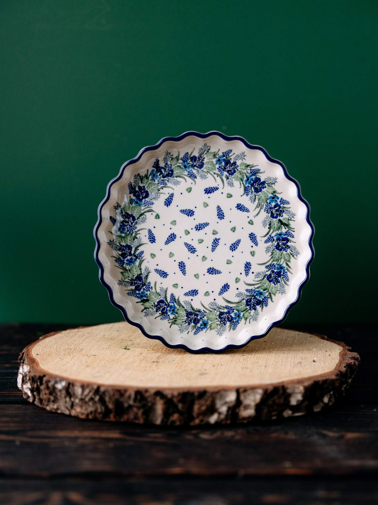 Okrągła forma do pieczenia tarty z falistym wykończeniem, ozdobiona kwiatowym, kobaltowo-zielonym wzorem wianka.