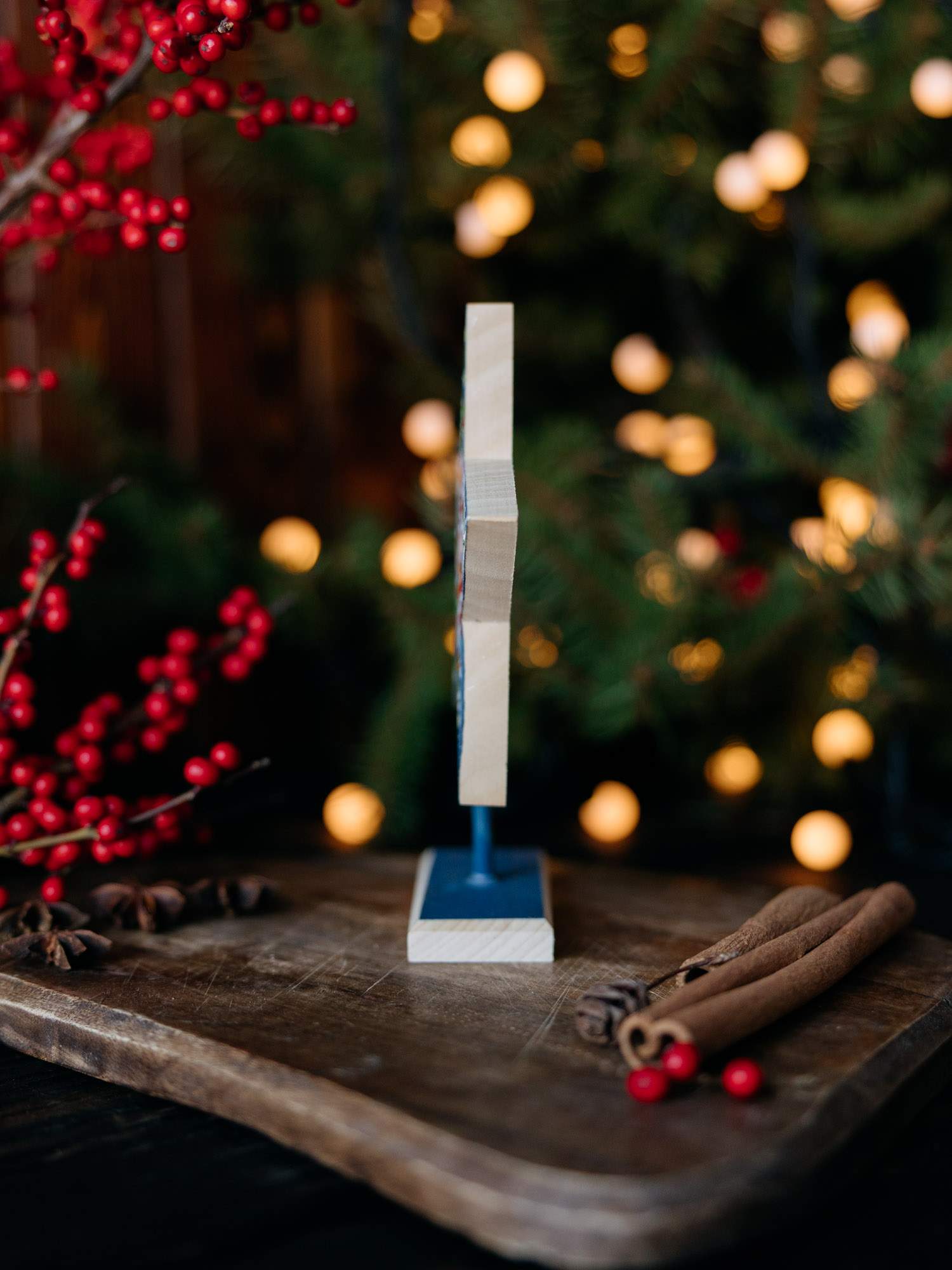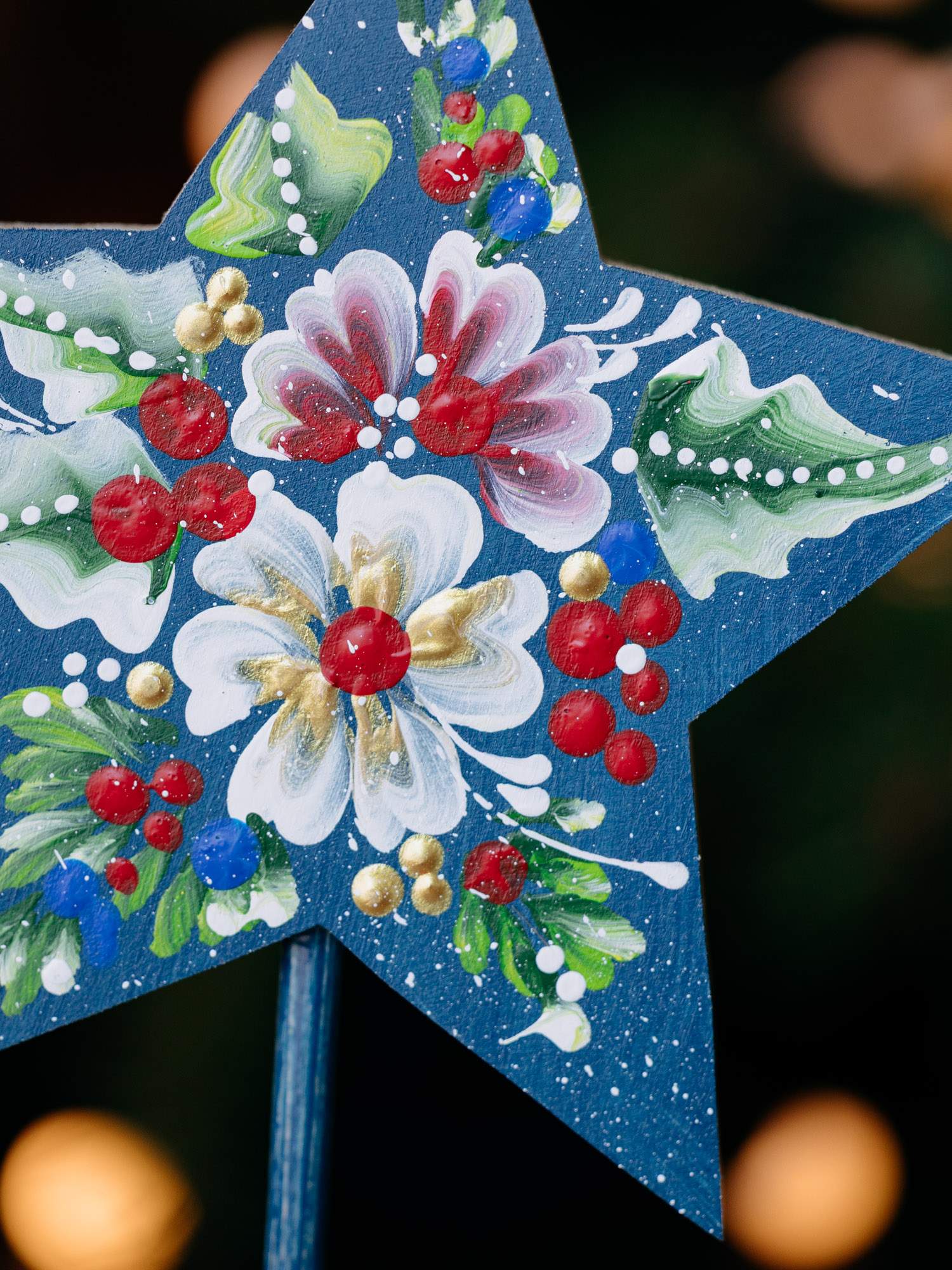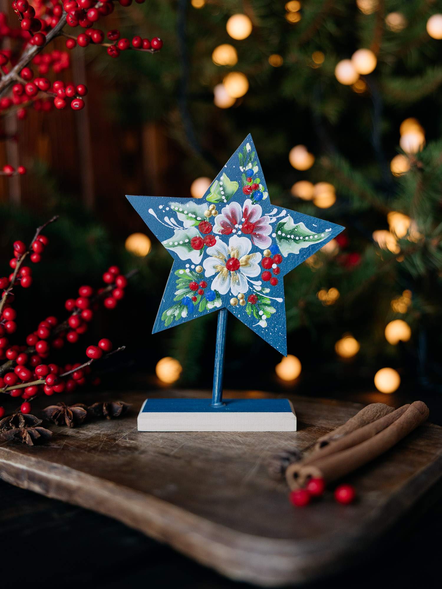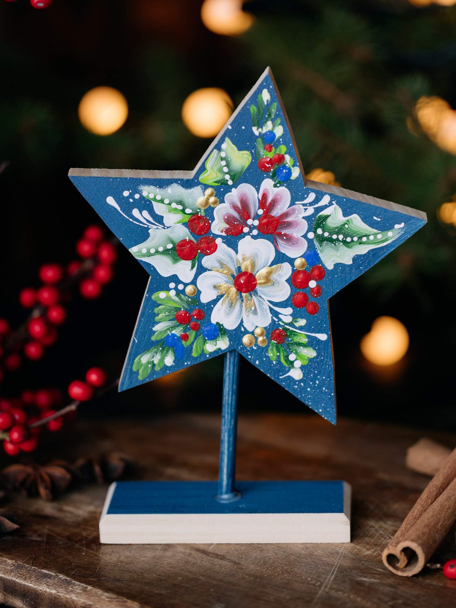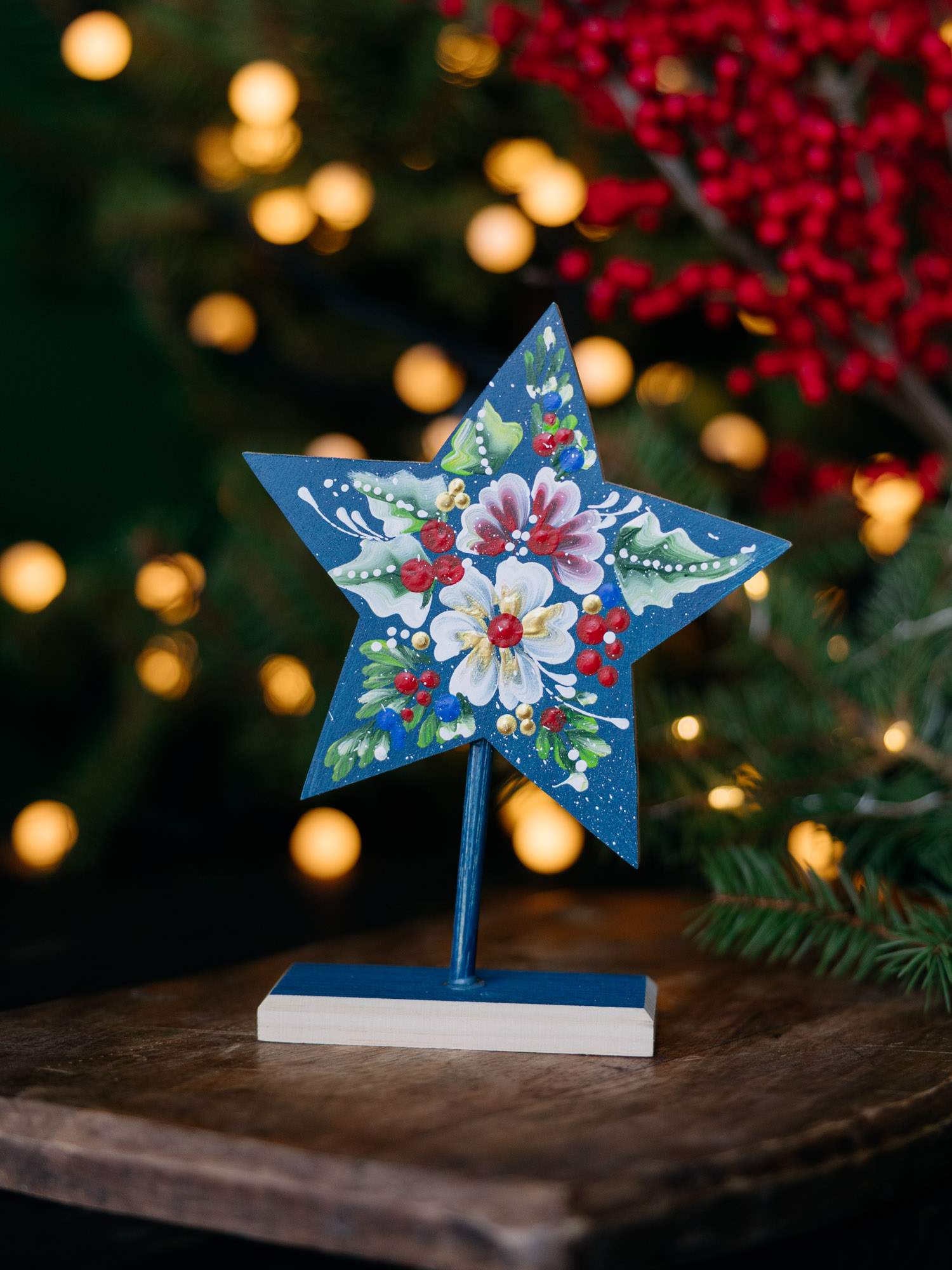 Wykonana ręcznie drewniana gwiazdka granatowa na nóżce, ozdobiona kolorowymi kwiatkami. Ustawiona na podstawce z drewna prezentuje się stabilnie i elegancko.
