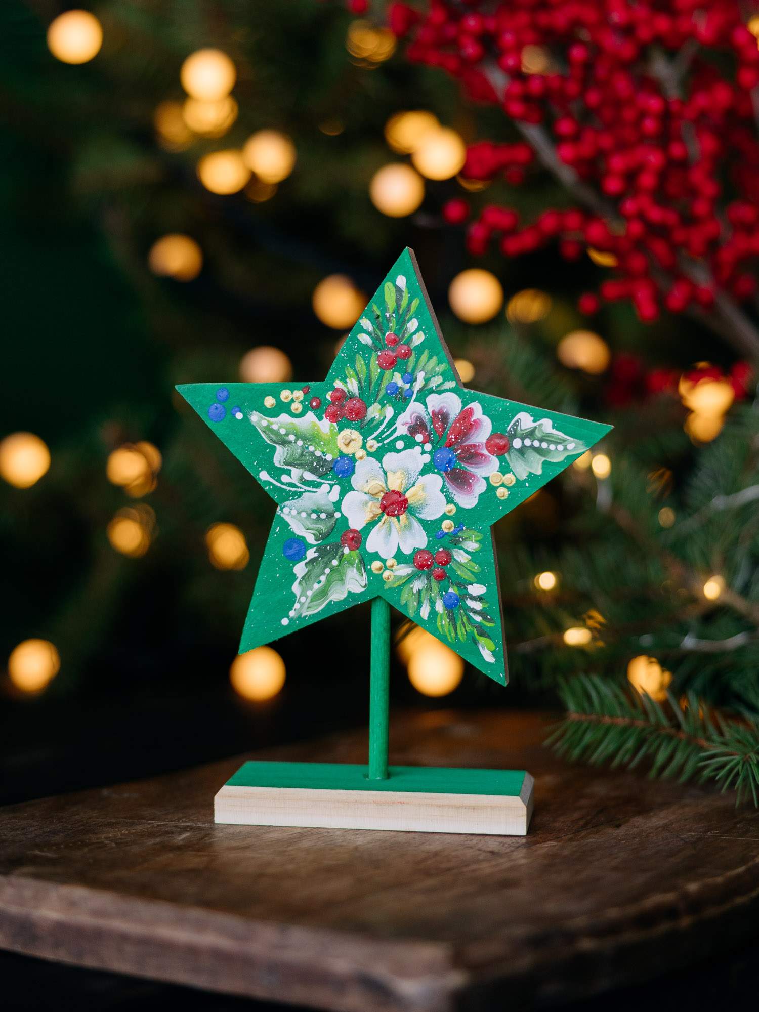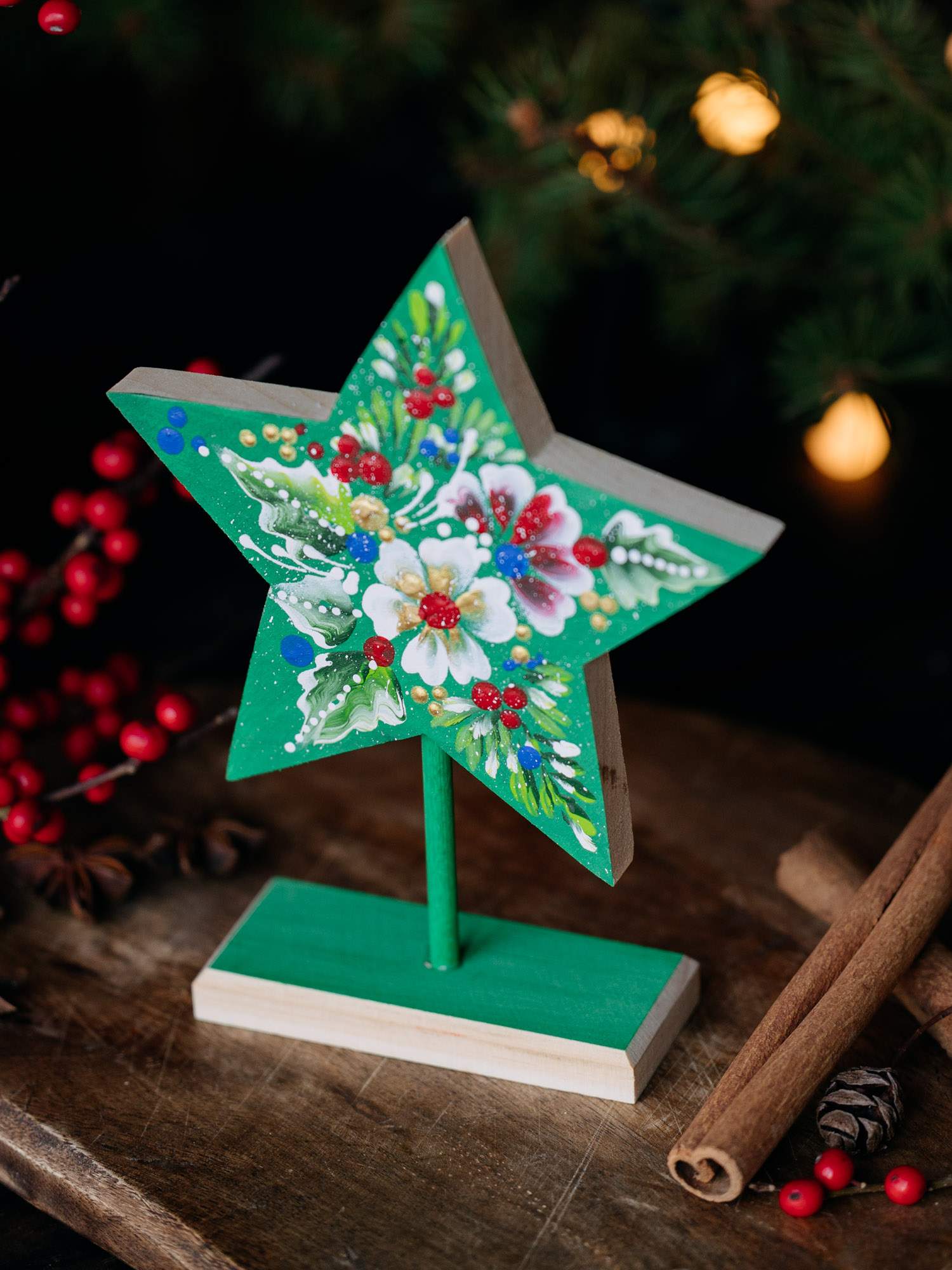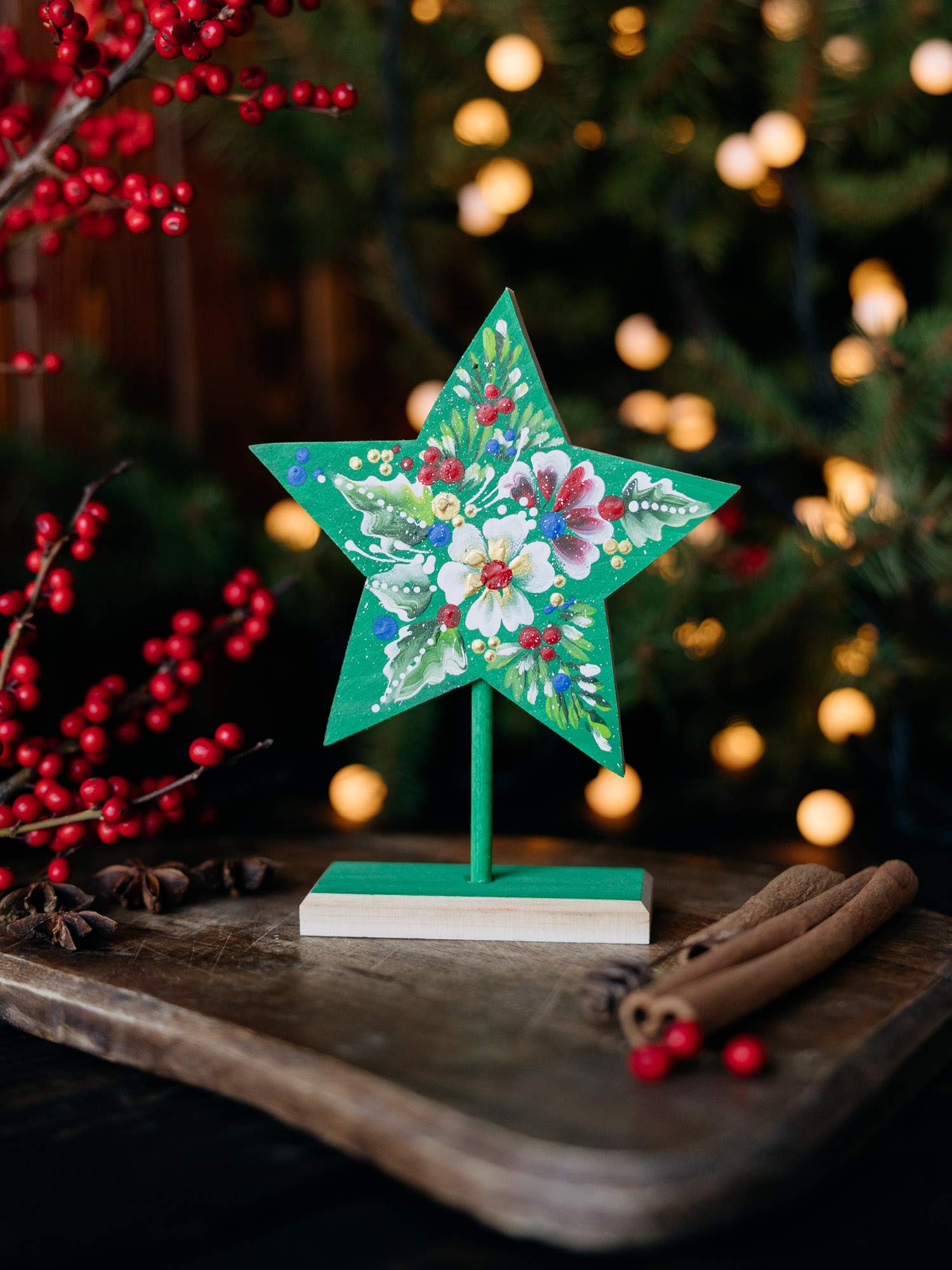 Drewniana gwiazdka na nóżce w kolorystyce zieleni, bogato zdobiona w motyw kwiatowy. Stabilna podstawka umożliwia ustawienie dekoracji na stole, komodzie, kominku czy parapecie.