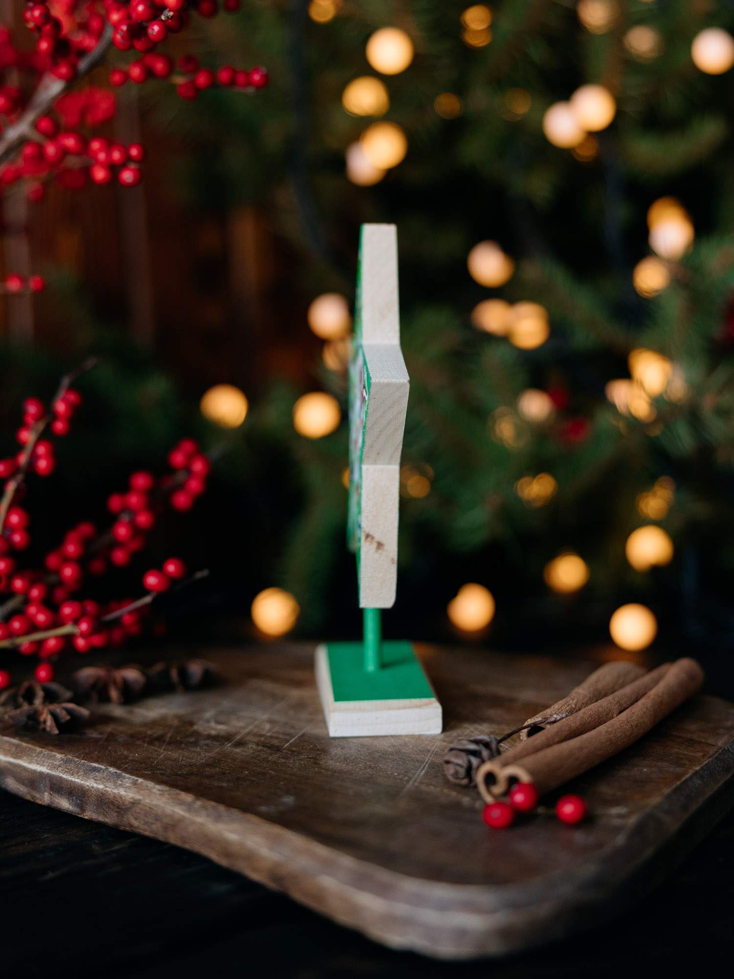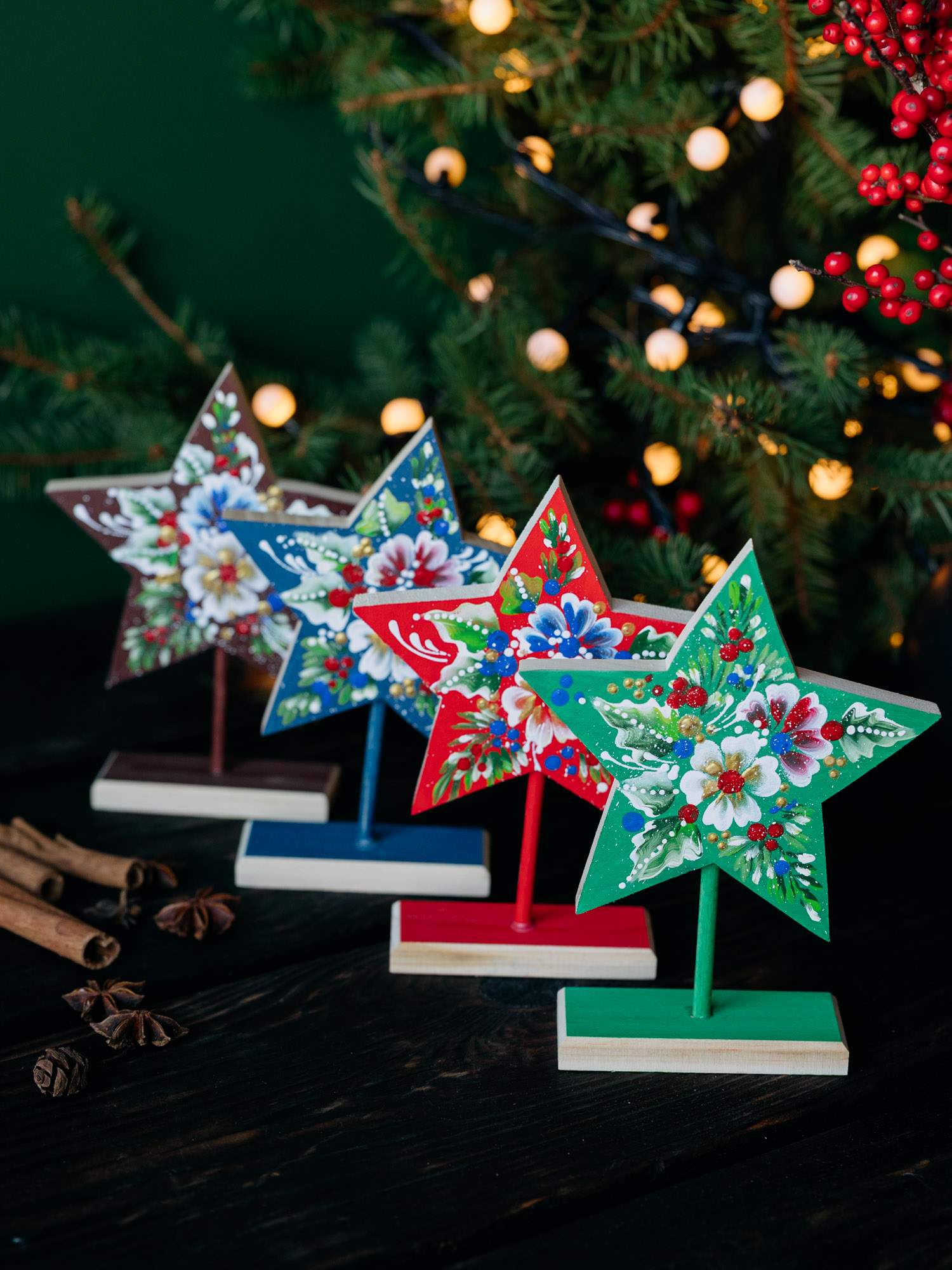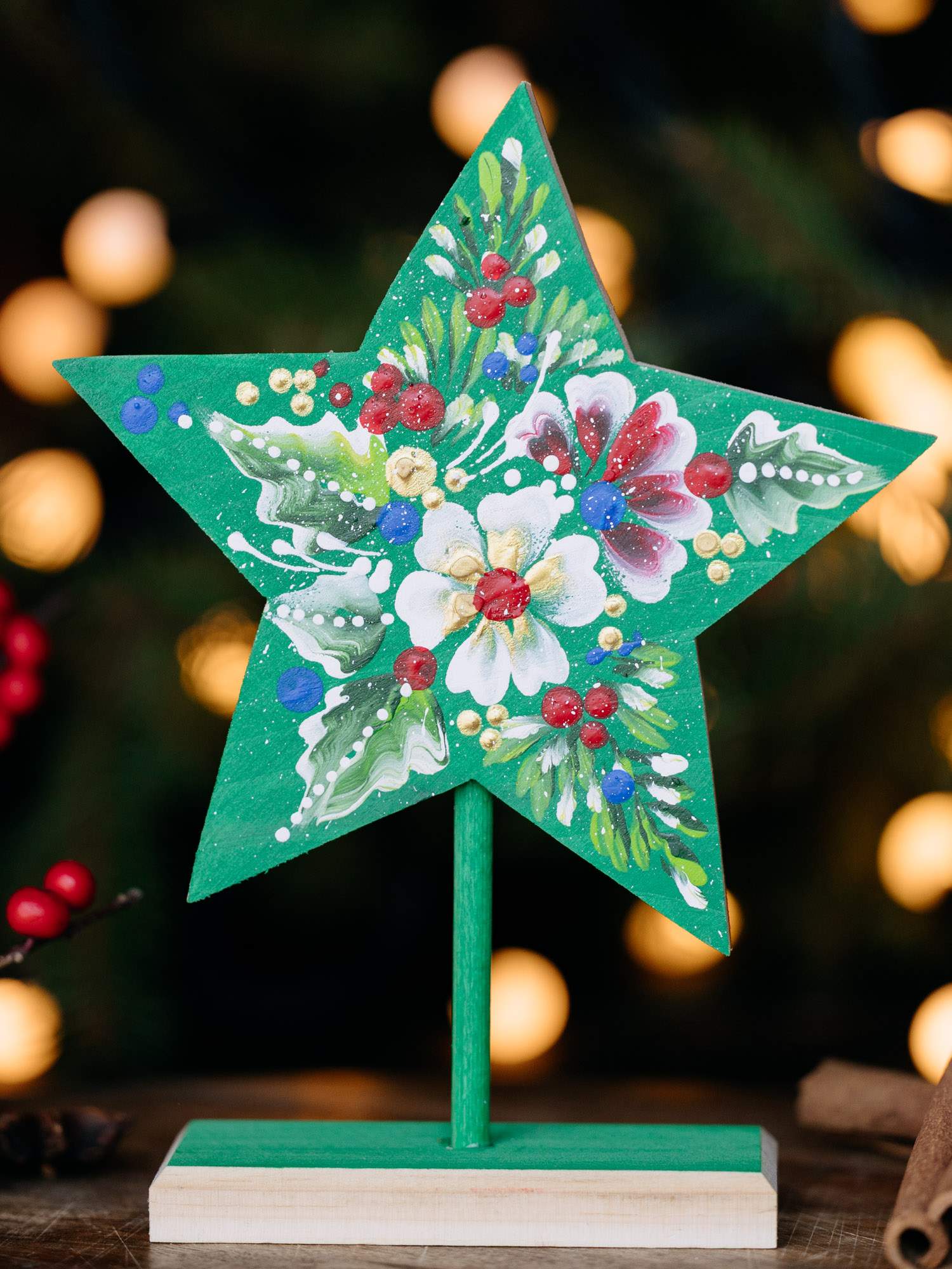 Drewniana gwiazdka na nóżce w kolorystyce zieleni, bogato zdobiona w motyw kwiatowy. Stabilna podstawka umożliwia ustawienie dekoracji na stole, komodzie, kominku czy parapecie.