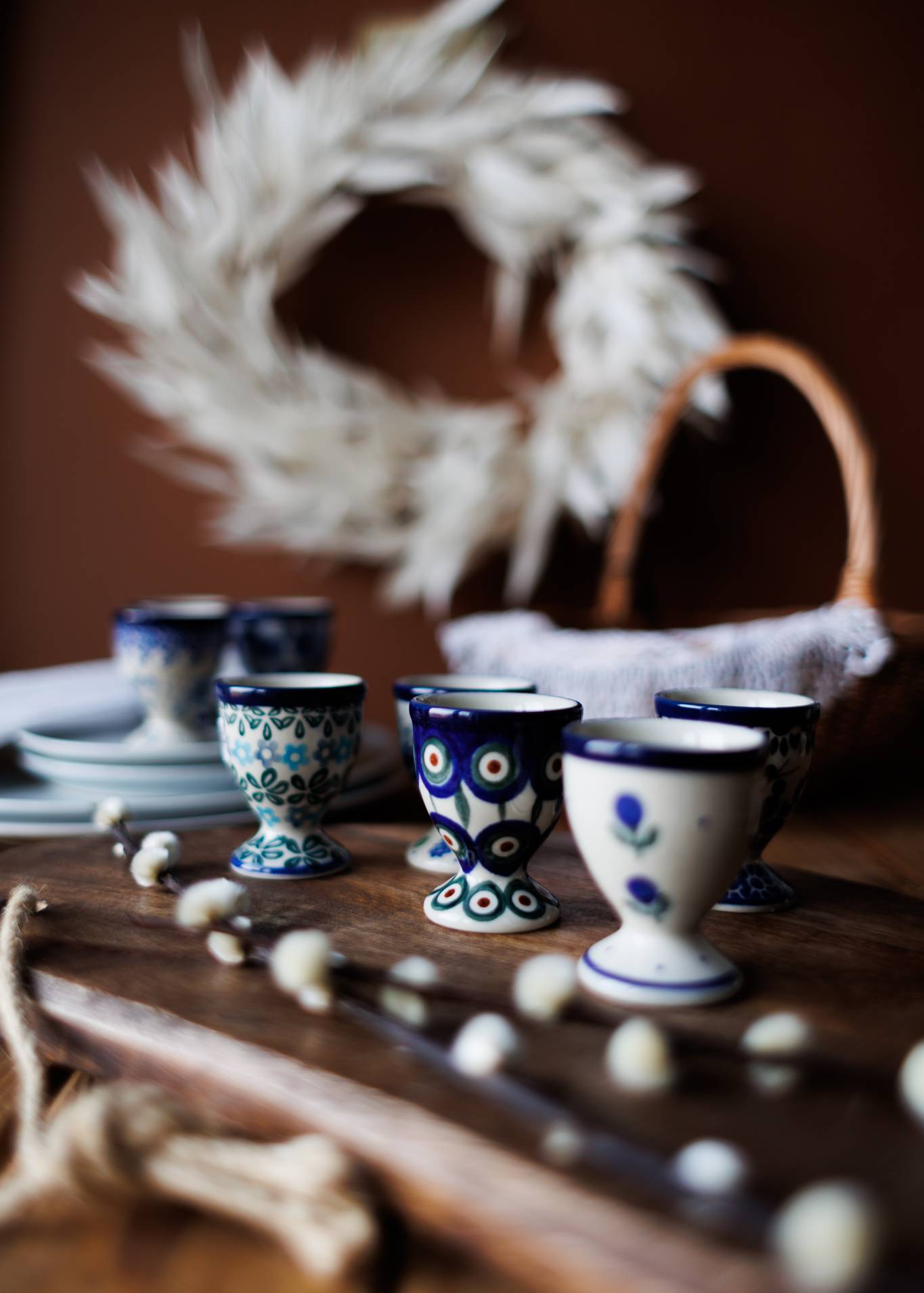 Rozszerzeniem tego wzoru są tak zwane pawie oczka. Stempelek w formie kobaltowego kółka uzupełniony jest mniejszym, zielonym okręgiem i brązowym punktem wewnątrz. Pawie oczka, na kremowym tle naczynia, często uzupełniane są jeszcze liniami w kolorze niebieskim. Ręcznie malowane wzory powodują, że każde naczynie jest unikalne i mogą między nimi występować minimalne różnice w zdobnictwie. Jednak bez precyzyjnych rąk i umiejętnych ruchów Twórcy Ludowego żadne naczynie samo nie powstanie.