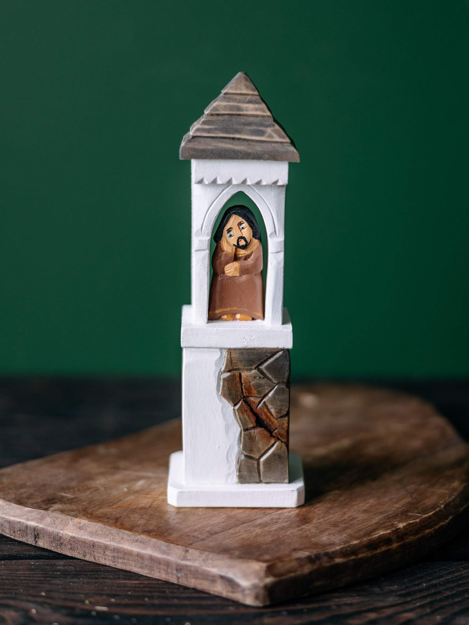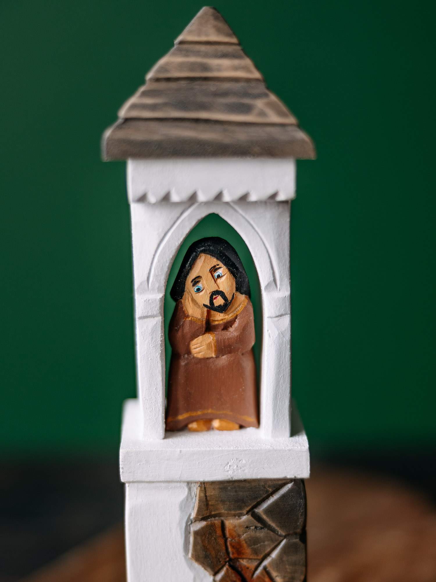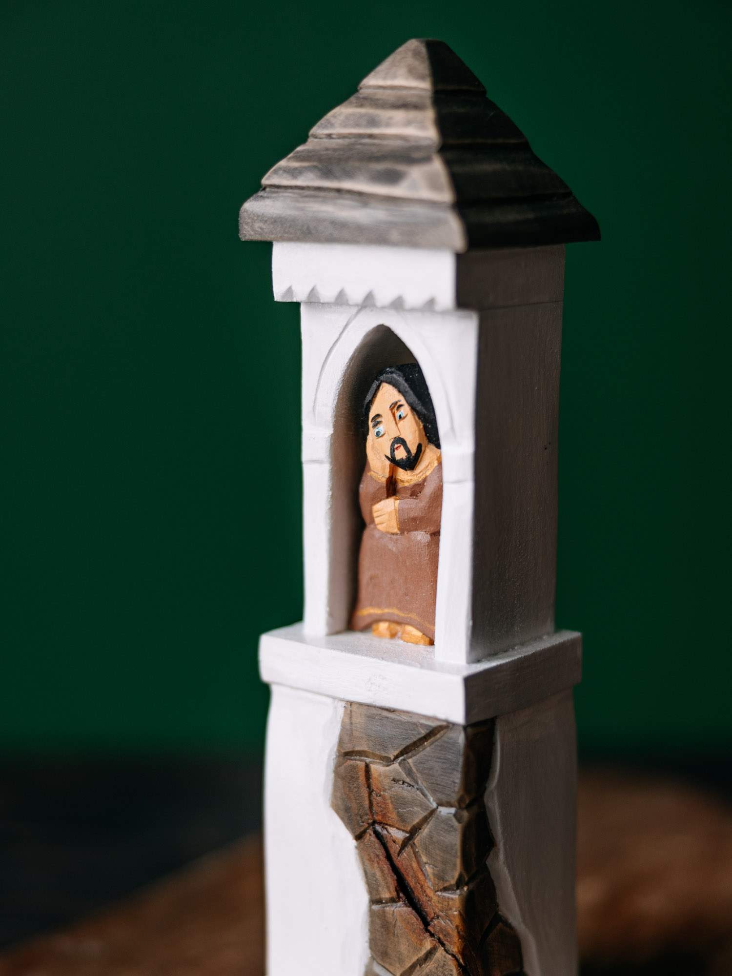 Ręcznie wykonana rzeźba sakralna przedstawiająca Jezuska w białej kapliczce z namalowanym kamieniem.