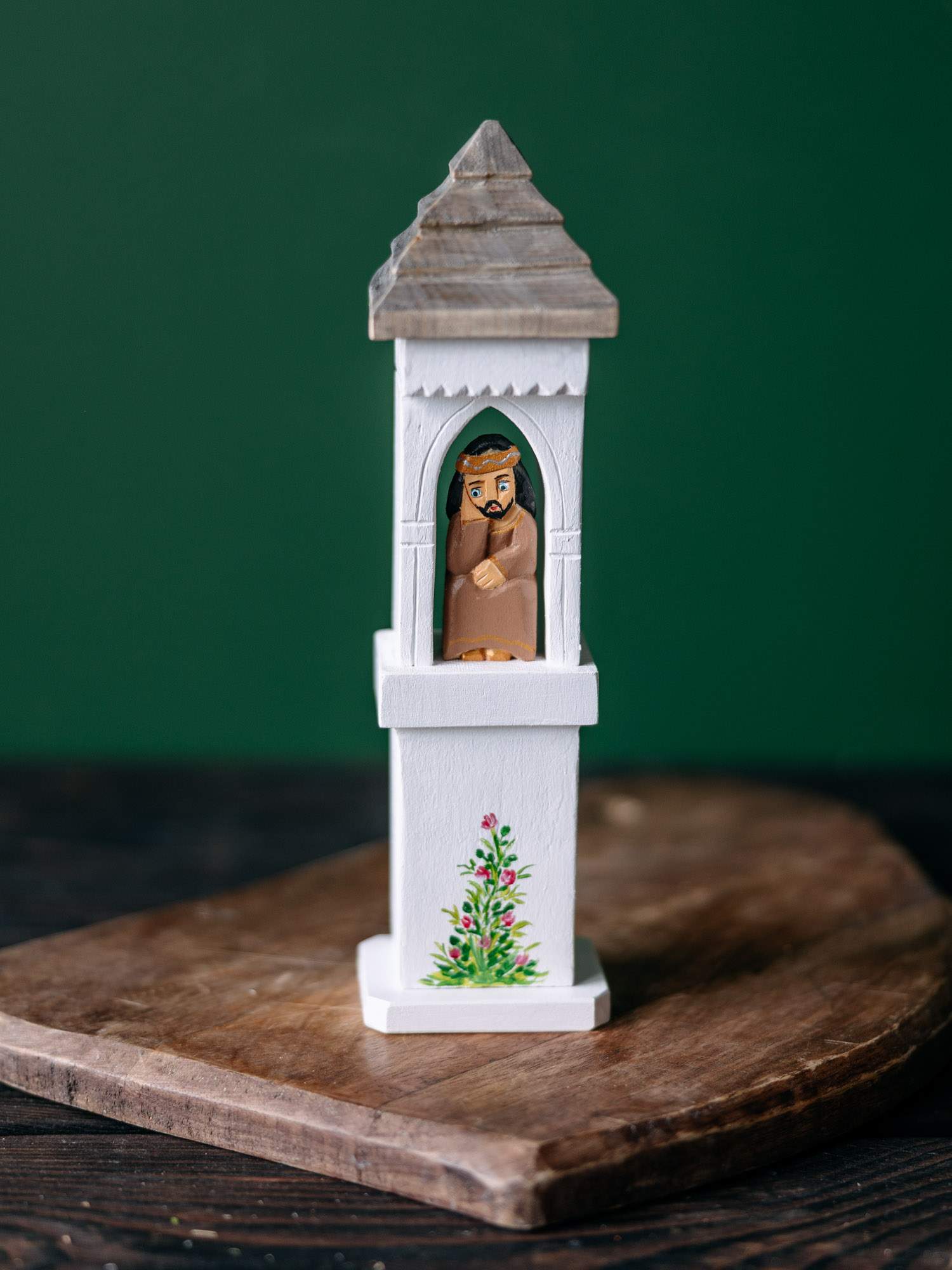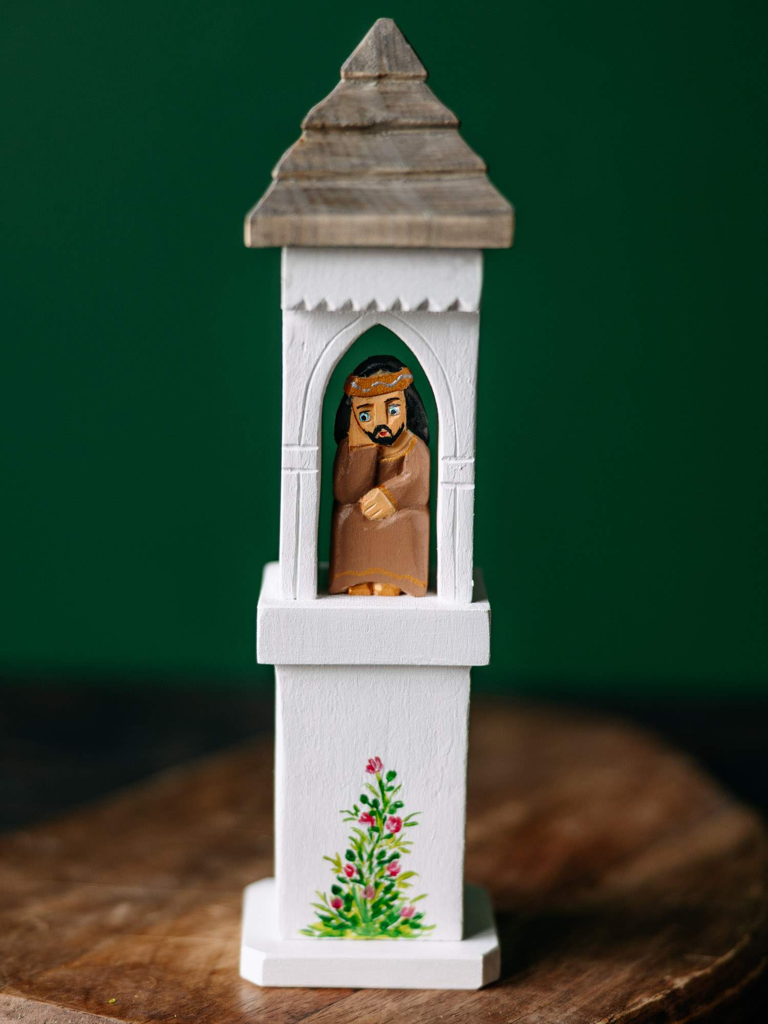Ręcznie wykonana rzeźba sakralna przedstawiająca postać Jezuska w białej kapliczce, ozdobionej różowymi kwiatami. Jezusek ubrany jest w brązową szatę, zdobioną złotymi elementami. Głowę ma opartą o rękę, a wzrok skierowany w dół. Całość została wykonana przez rzeźbiarkę z okolic Łowicza.