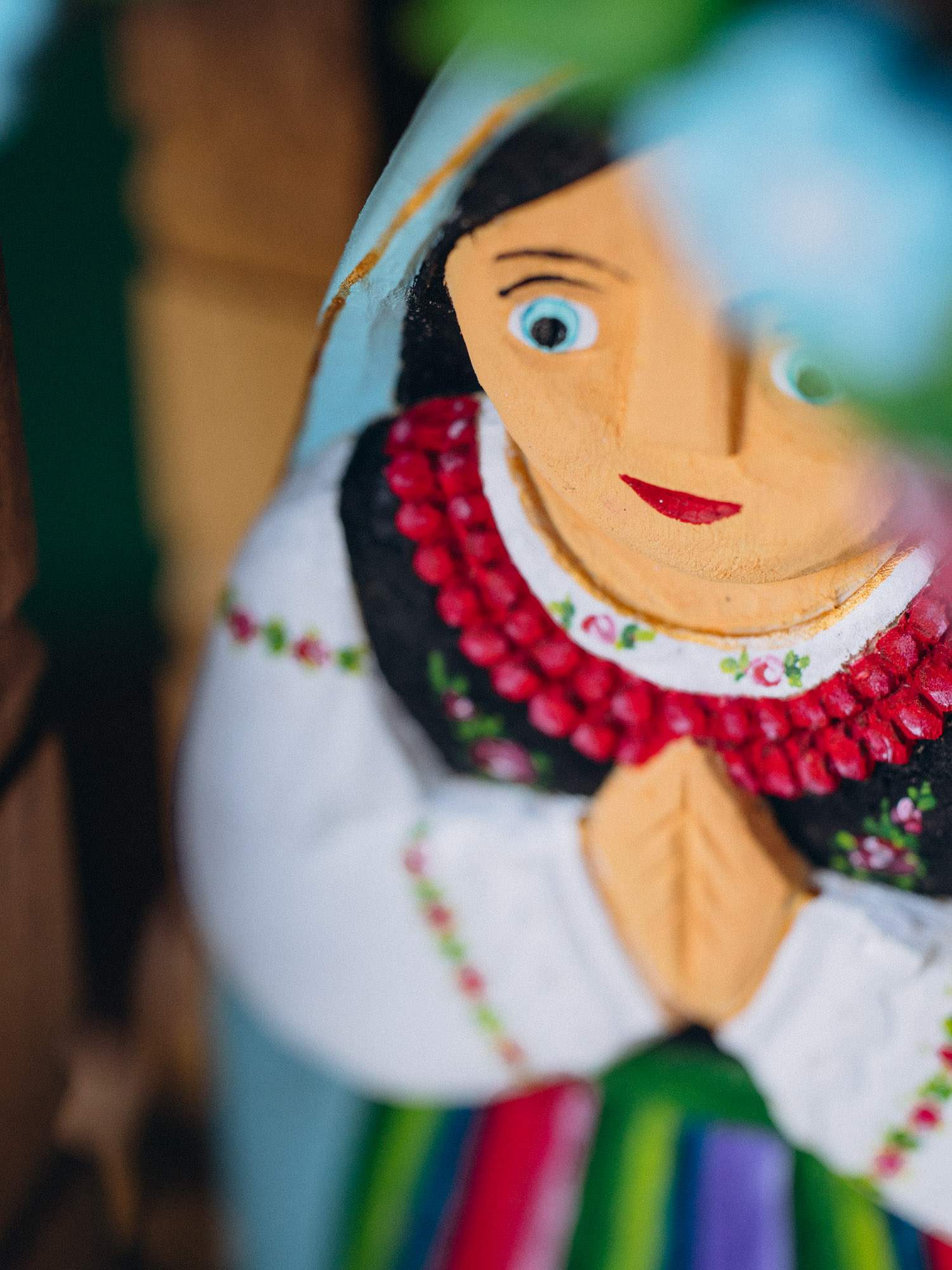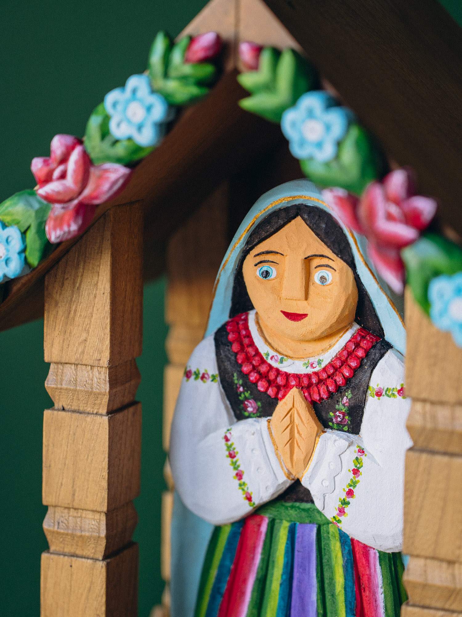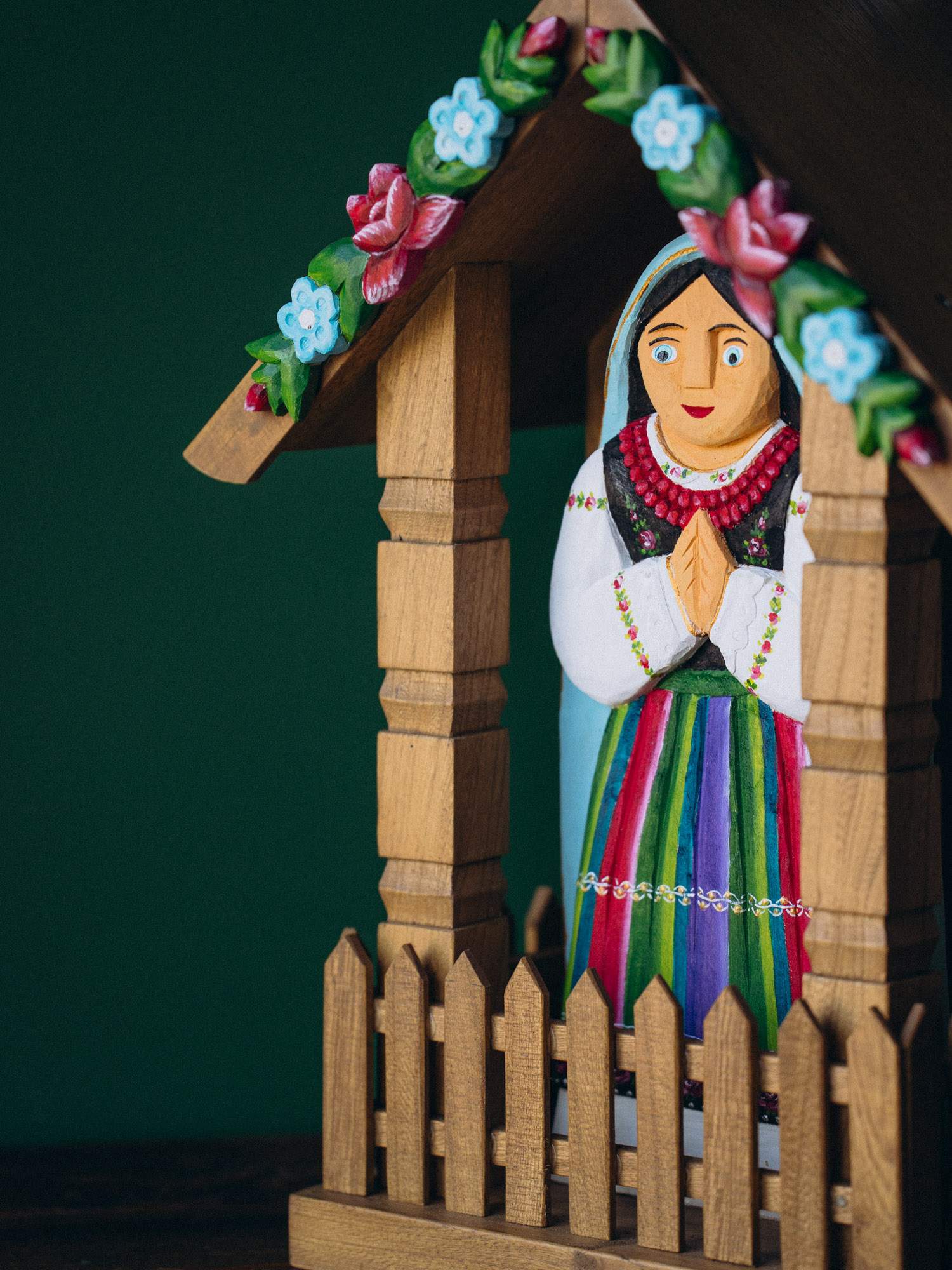 Ręcznie wykonana rzeźba sakralna przedstawiająca postać Maryi wewnątrz dużej kapliczki.