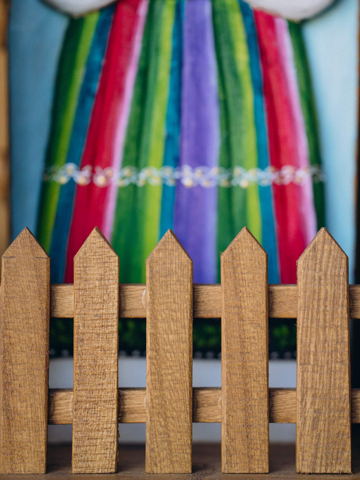 Drewniana rzeźba przedstawiająca Maryję w łowickim pasiaku, umieszczoną w kapliczce z płotkiem. Dach i górne elementy kapliczki ozdobione są malowanymi motywami roślinnymi. Rzeźba wykonana ręcznie, malowana farbami. Całość została wykonana przez rzeźbiarkę z okolic Łowicza.