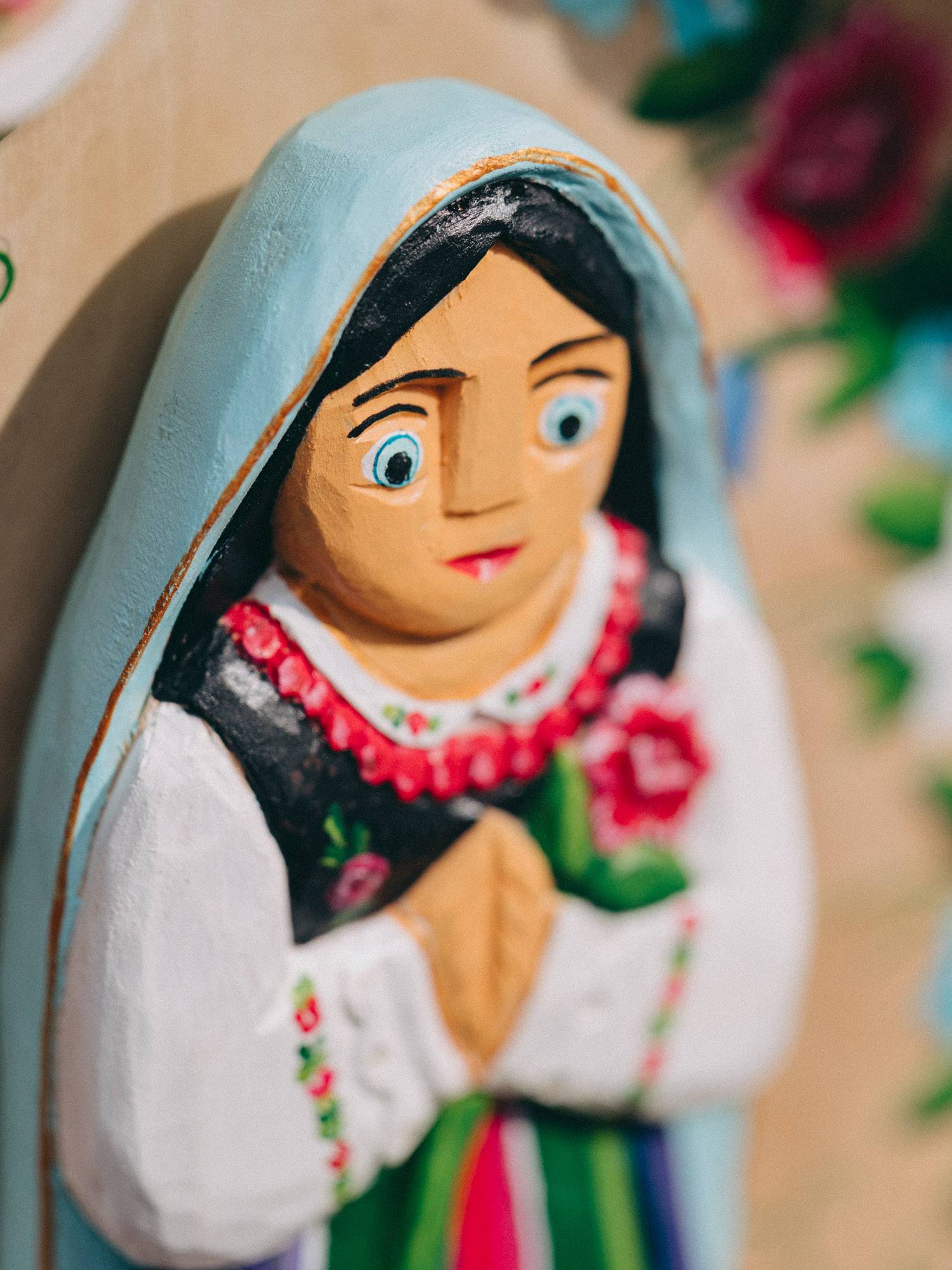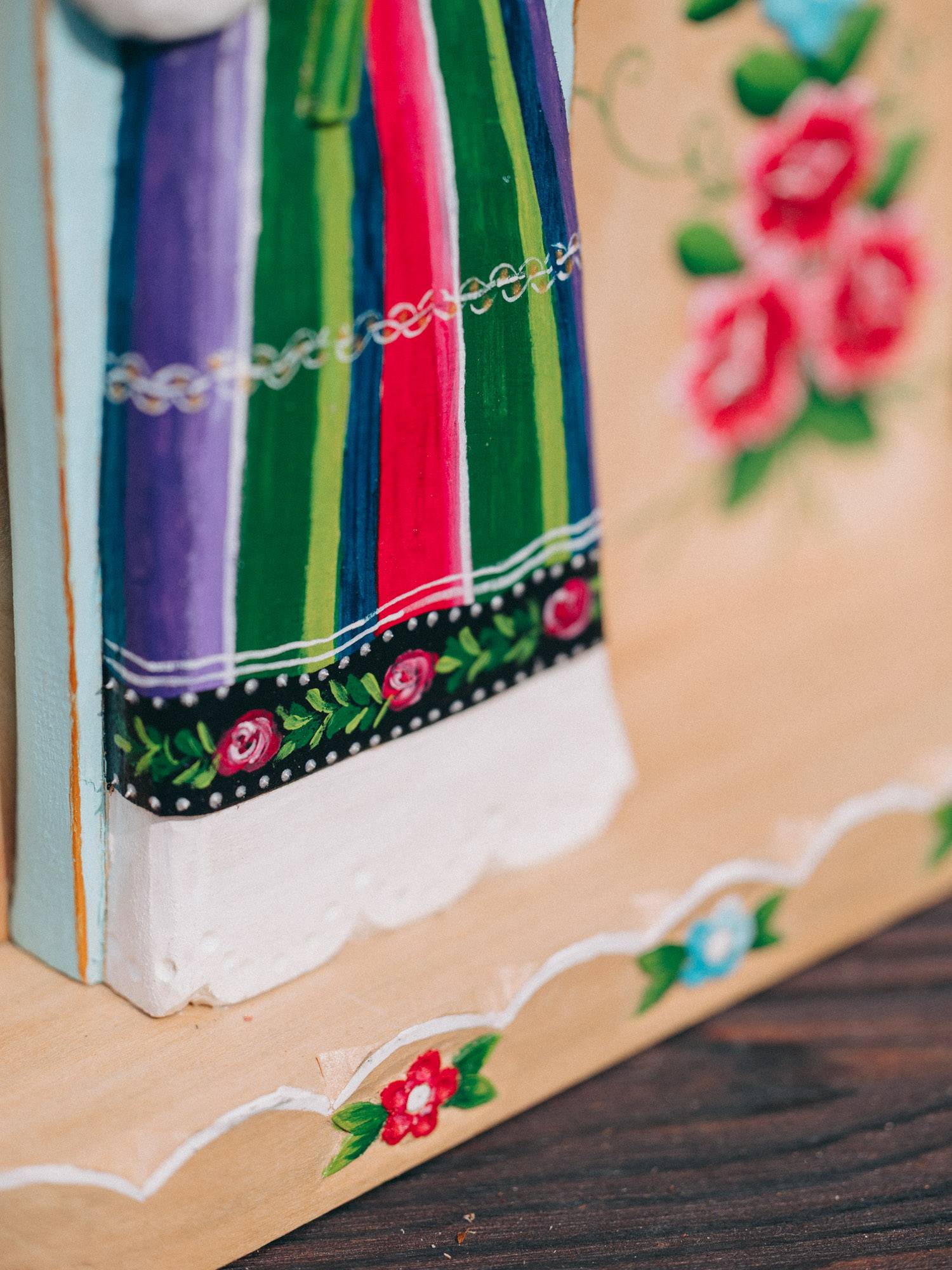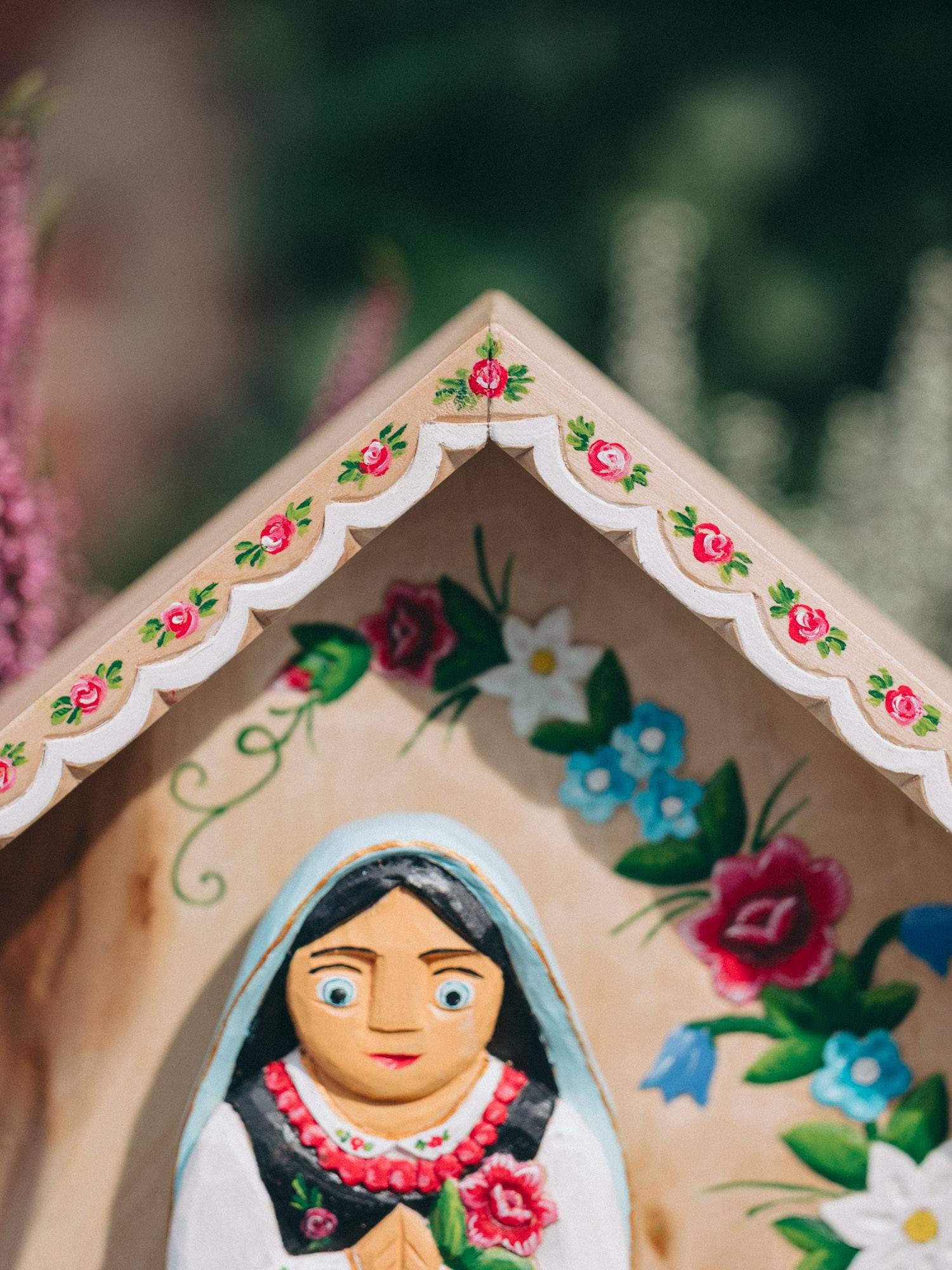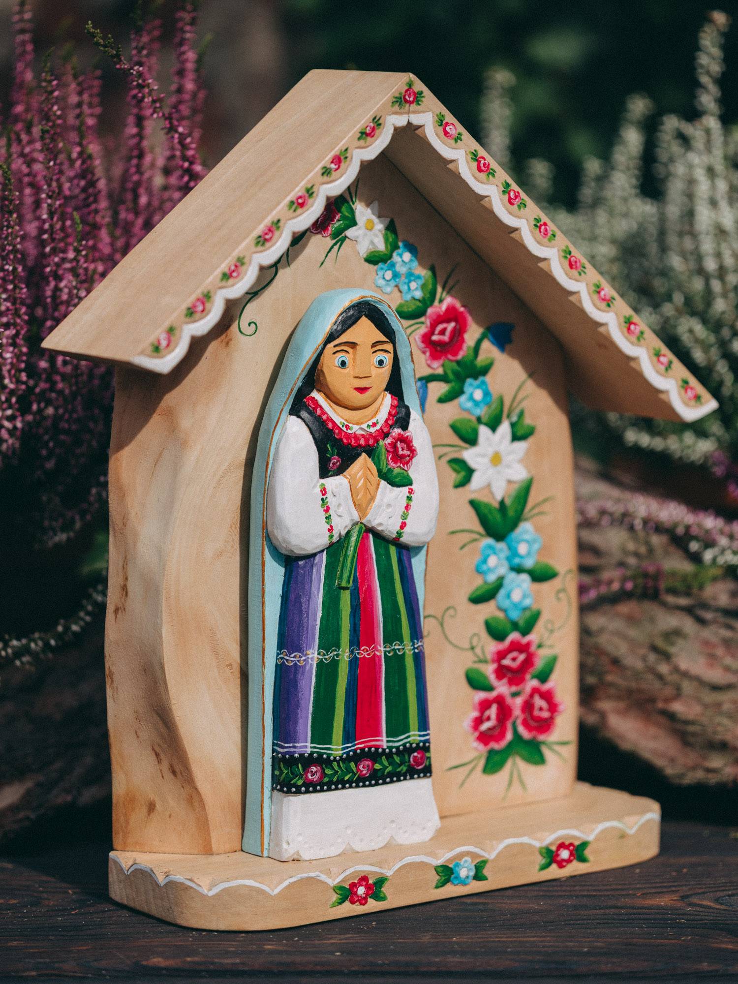 Ręcznie wykonana rzeźba sakralna przedstawiająca postać Maryi wewnątrz kapliczki ozdobionej kolorowymi kwiatami. Postać została uwieczniona ze złożonymi dłońmi, ubrana w strój łowicki. W ręku trzyma kwiatka, a na głowie ma niebieską chustę. Z tyłu kapliczki znajduje się haczyk, dzięki któremu rzeźbę można zawiesić na ścianie. Całość została wykonana przez rzeźbiarkę z okolic Łowicza.