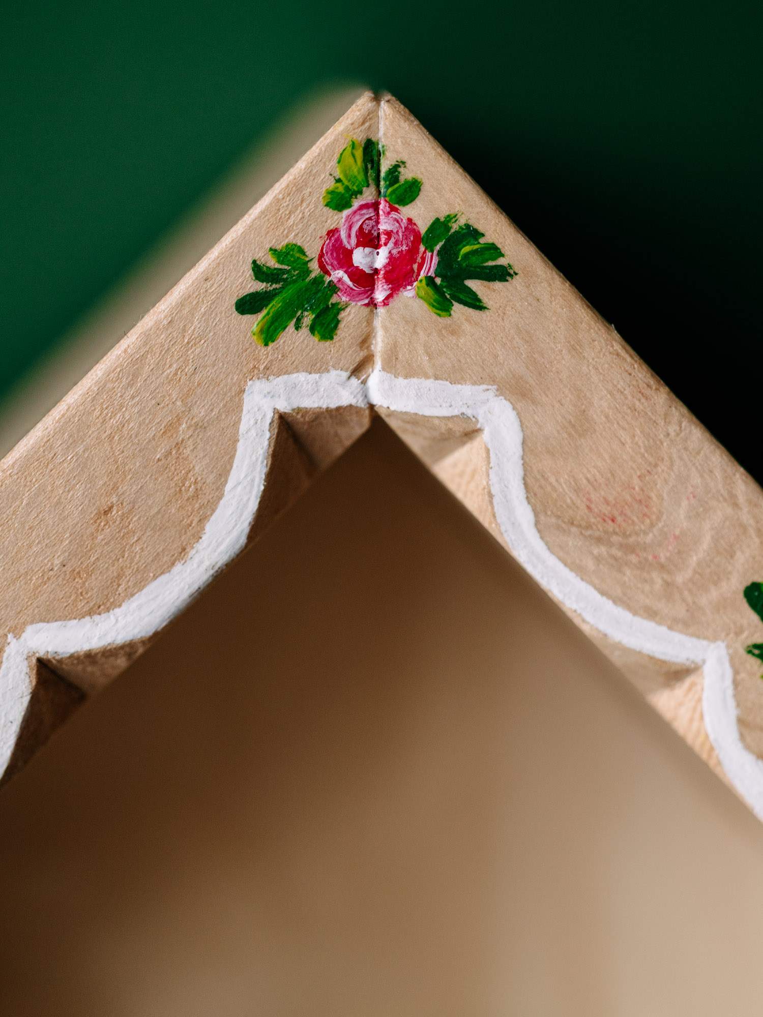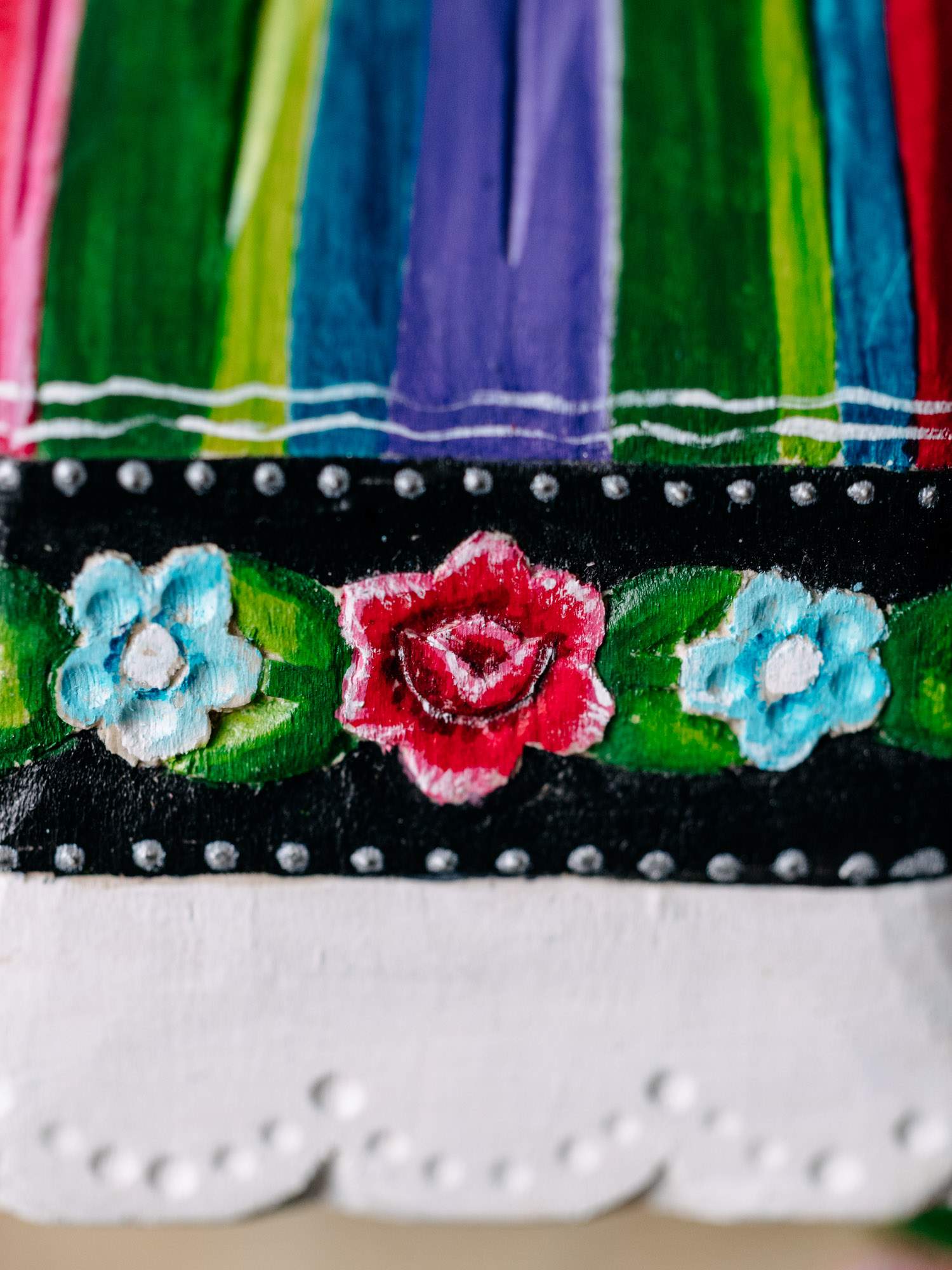 Wisząca kapliczka wykonana z jasnego drewna, zdobiona kolorowymi kwiatami. Przedstawia Maryję w stroju łowickim ze złożonymi dłońmi, z niebieską chustą na głowie. Z tyłu kapliczki znajduje się haczyk, dzięki któremu rzeźbę można zawiesić na ścianie. Całość została wykonana przez rzeźbiarkę z okolic Łowicza.