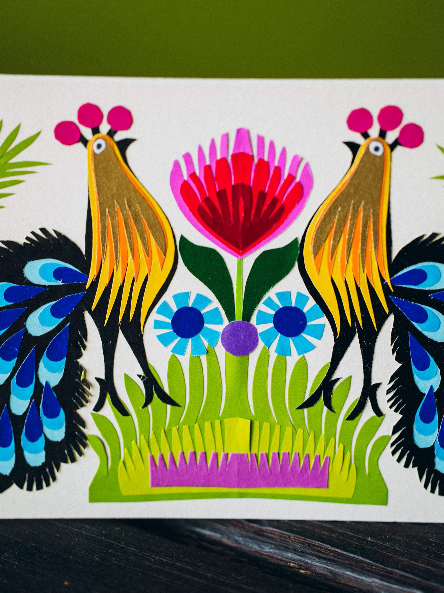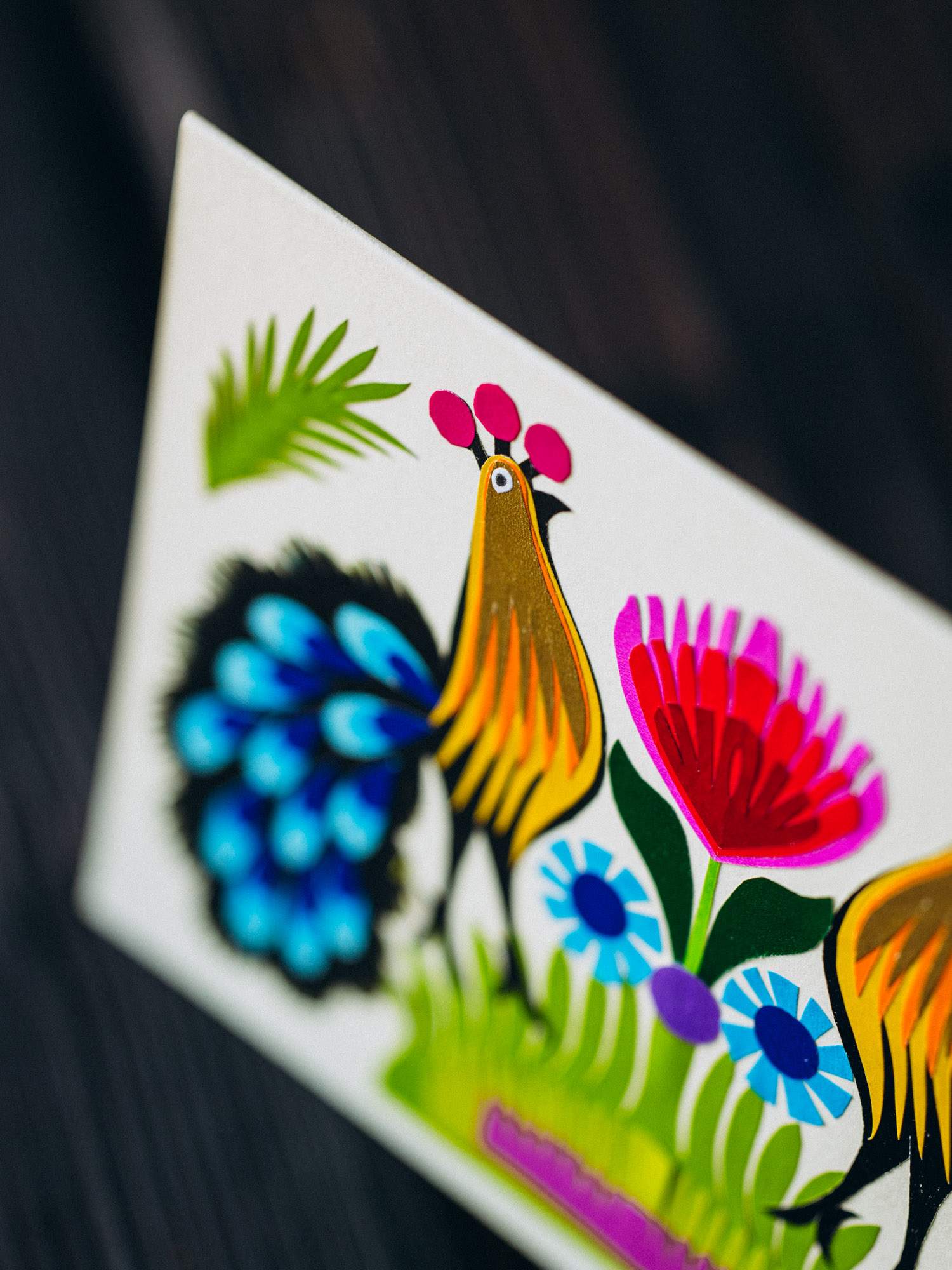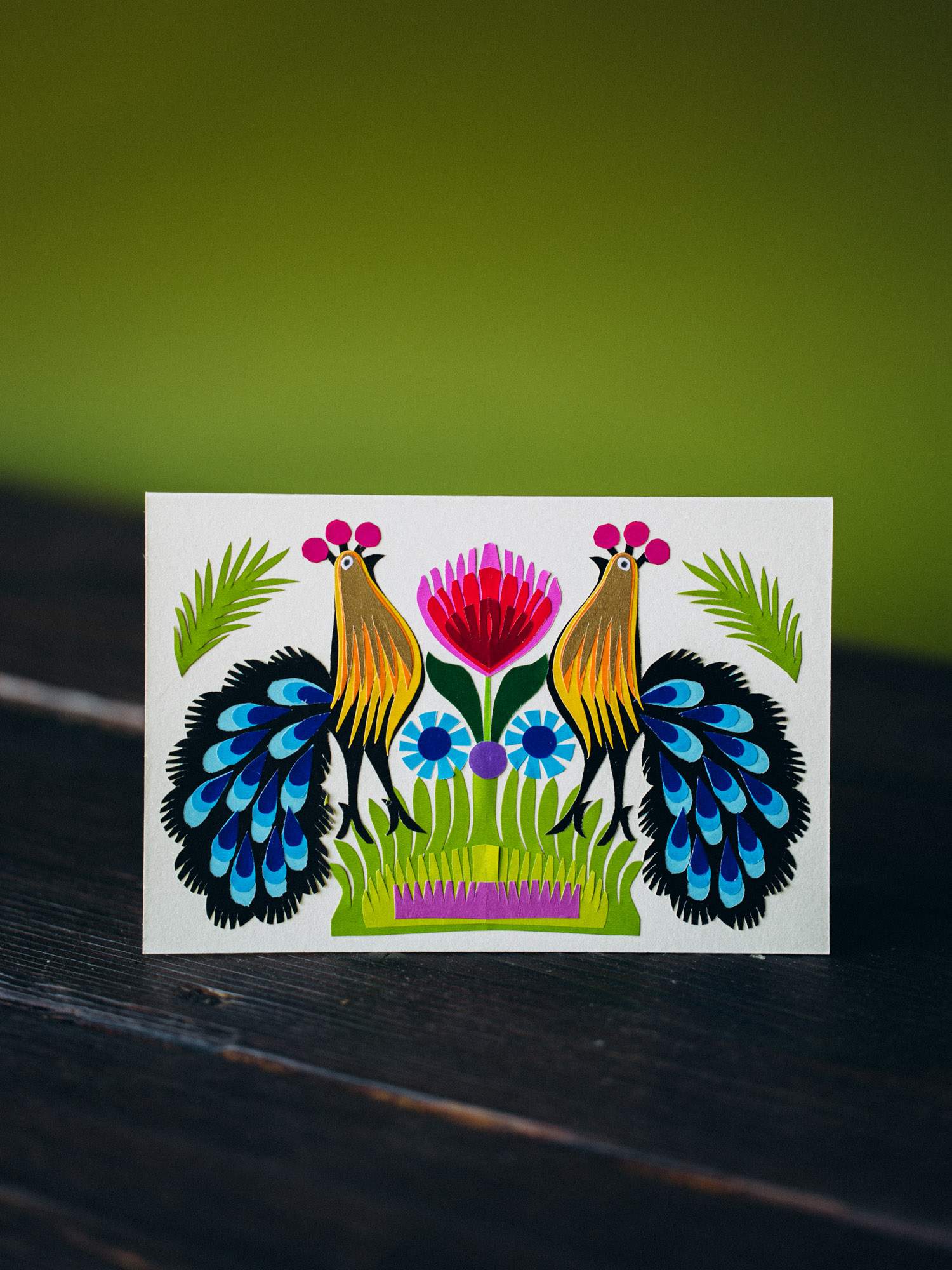 Ręcznie wykonana z niezwykłą precyzją, kartka sprawdzi się idelanie jako prezent. Starannie wykonany wzór dwóch pawi z niebieskimi ogonami uzupełniony różowym kwiatem dodaje jej wyjątkowego wyglądu. Umieszczona na papierze o specyficznej barwie, który przywołuje klimat lat 70.