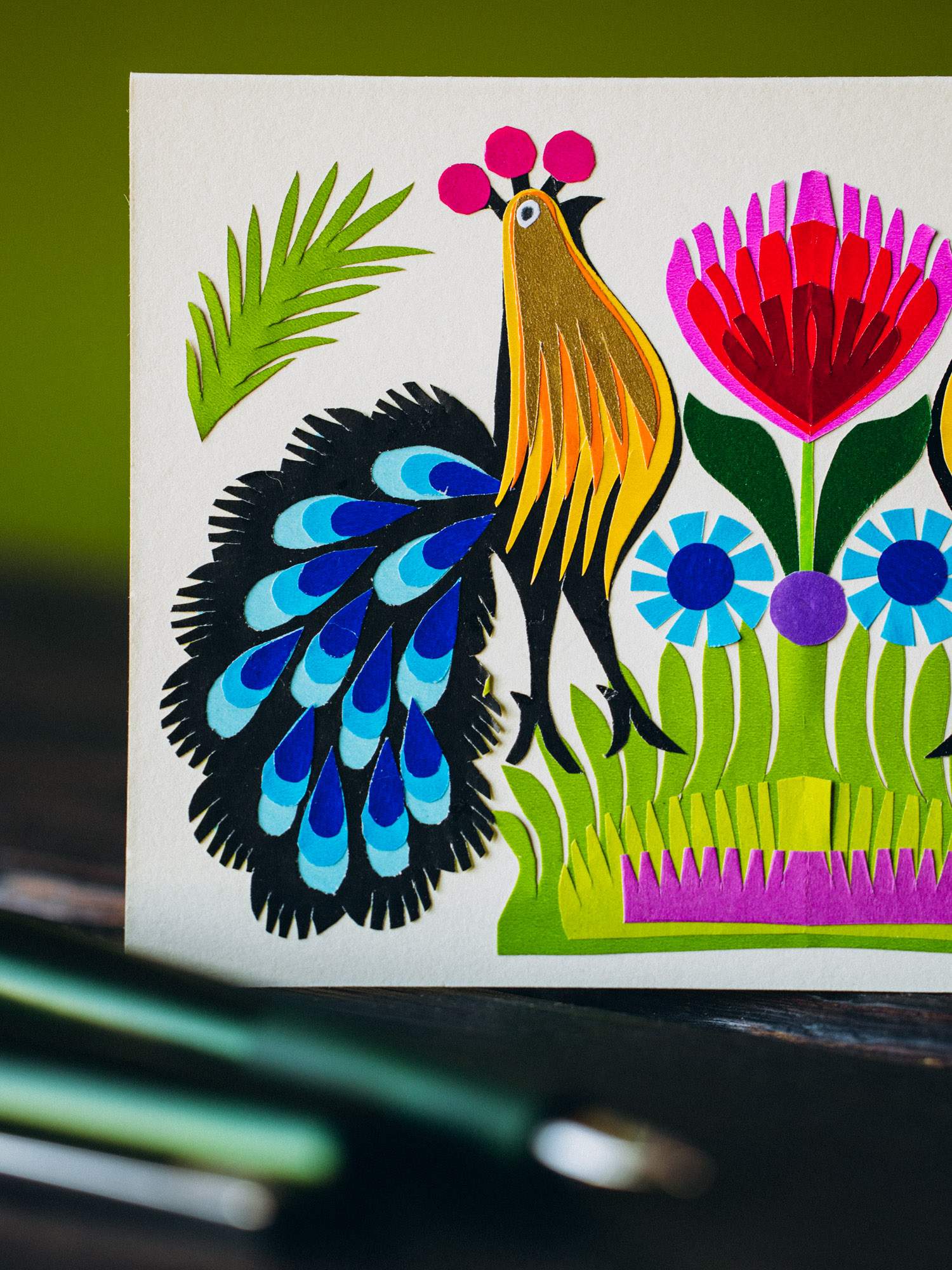 Ręcznie wykonana z precyzją kartka, przedstawiająca dwa pawie z niebieskimi ogonami.