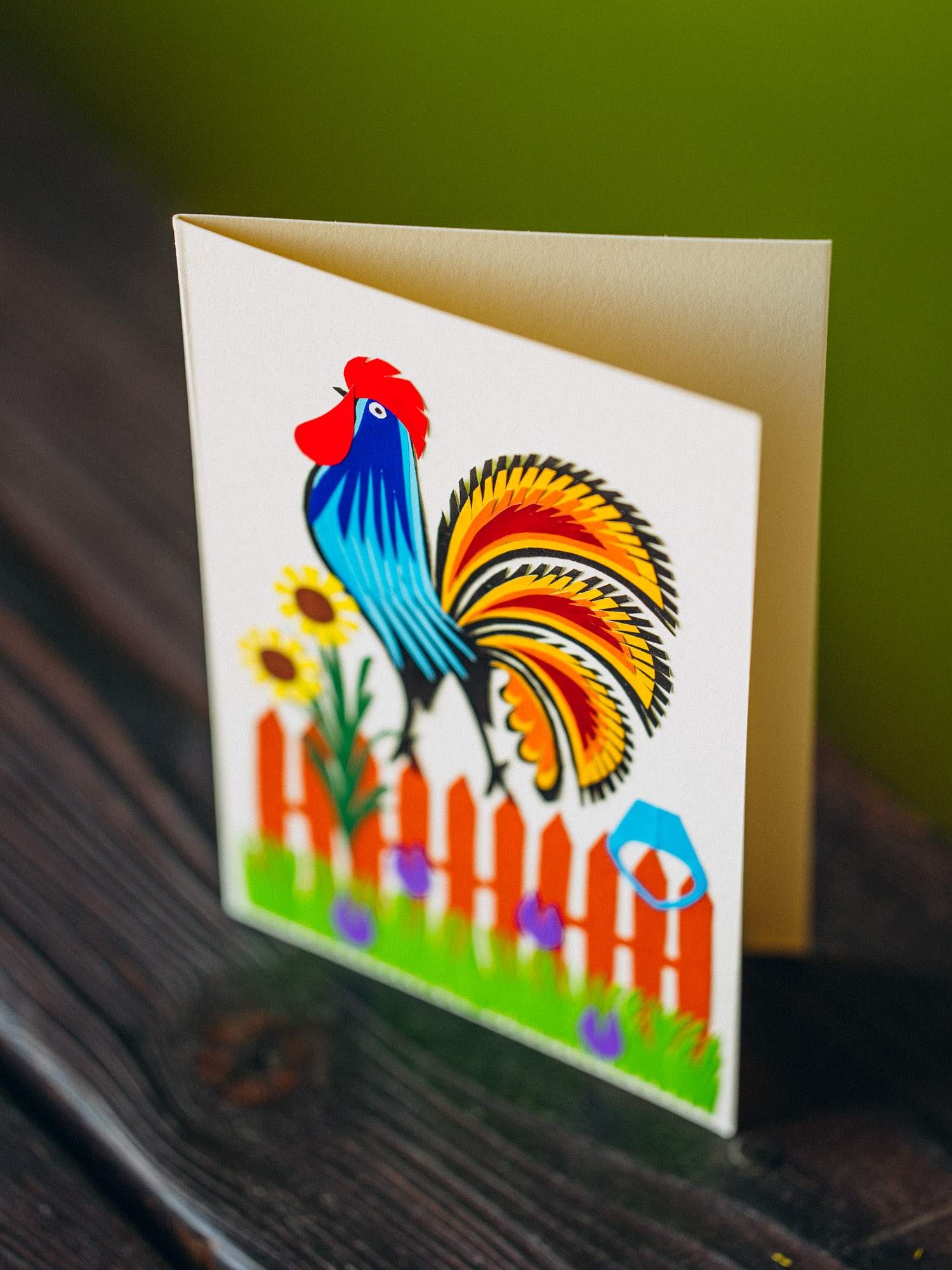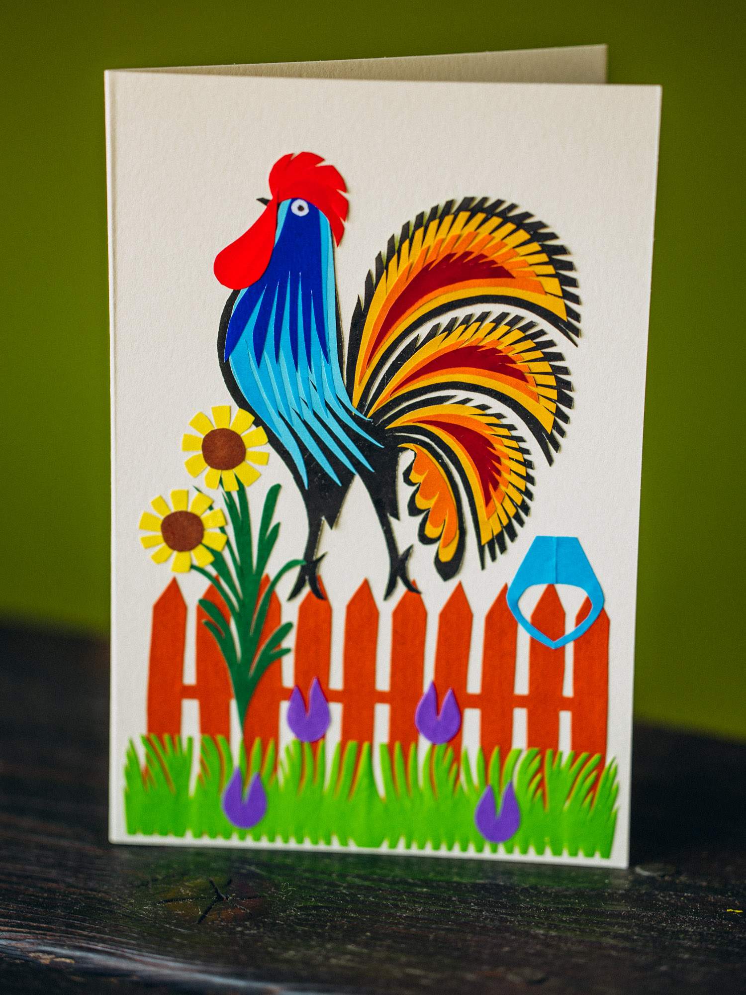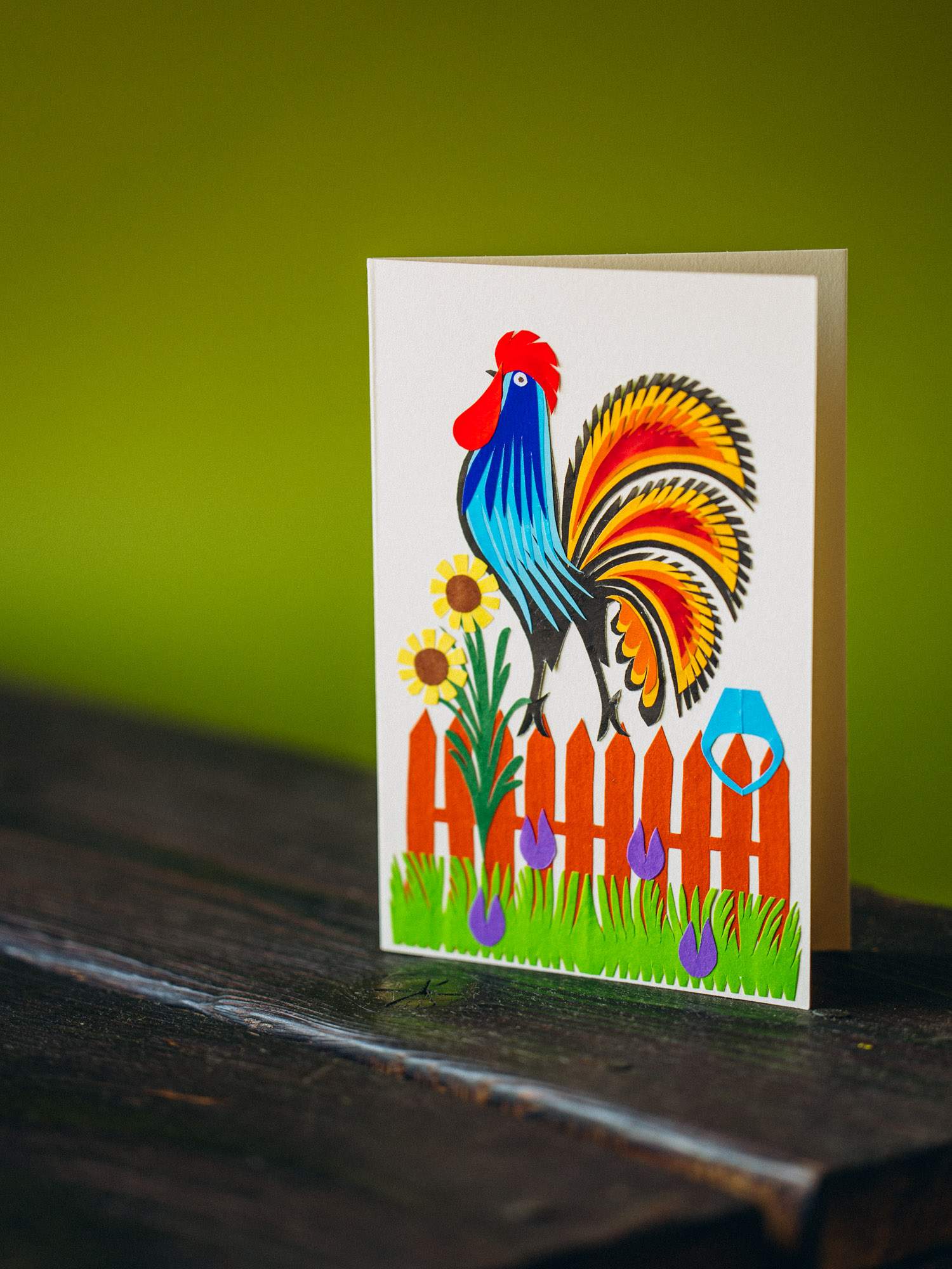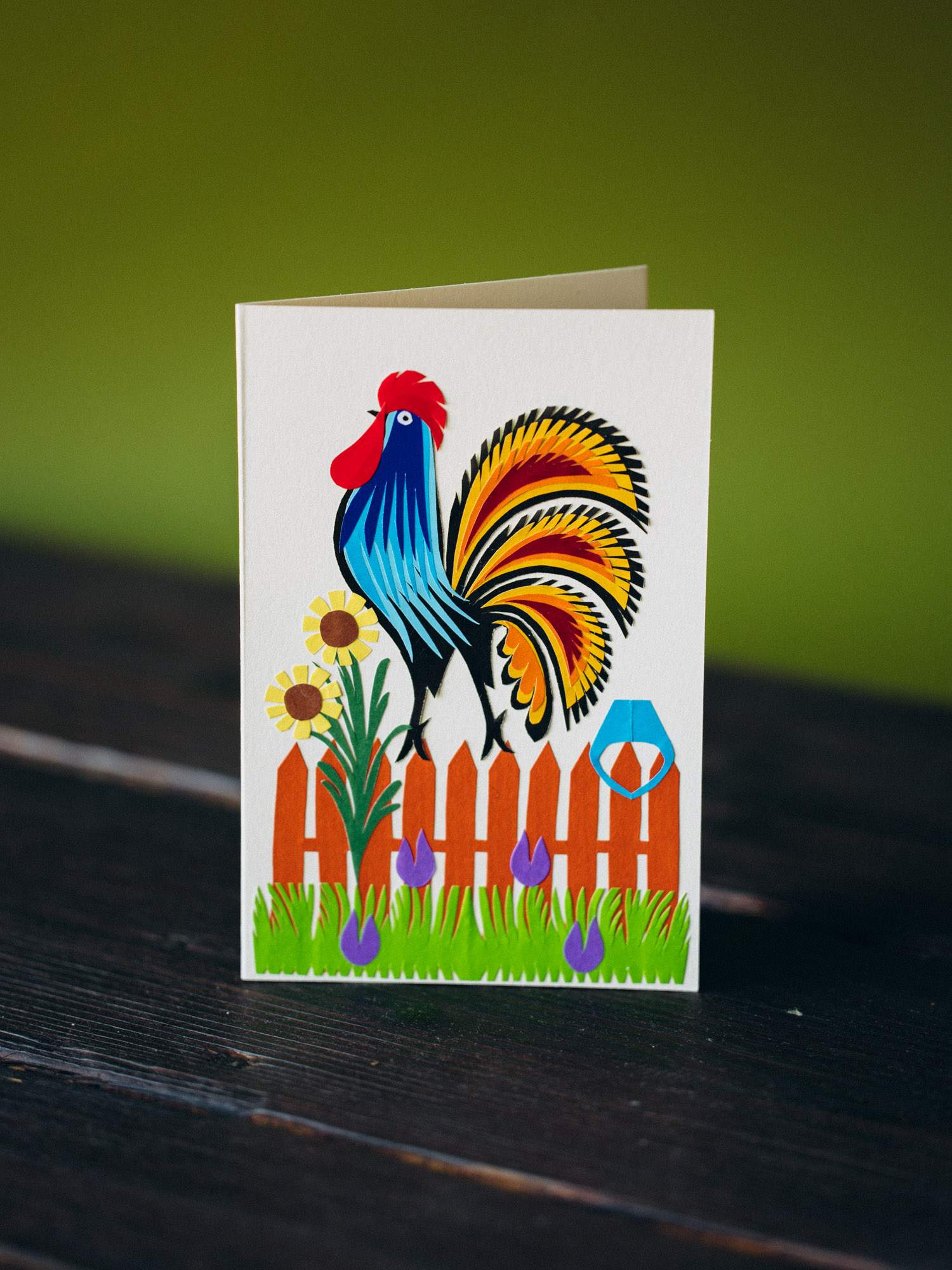 Kartka inspirowana tradycyjną łowicką wycinanką ludową, przedstawiająca barwnego koguta, stojącego na brązowym płocie oraz otoczonego kwiatami. Idealna jako unikalna kartka okolicznościowa lub ozodba wnętrza.