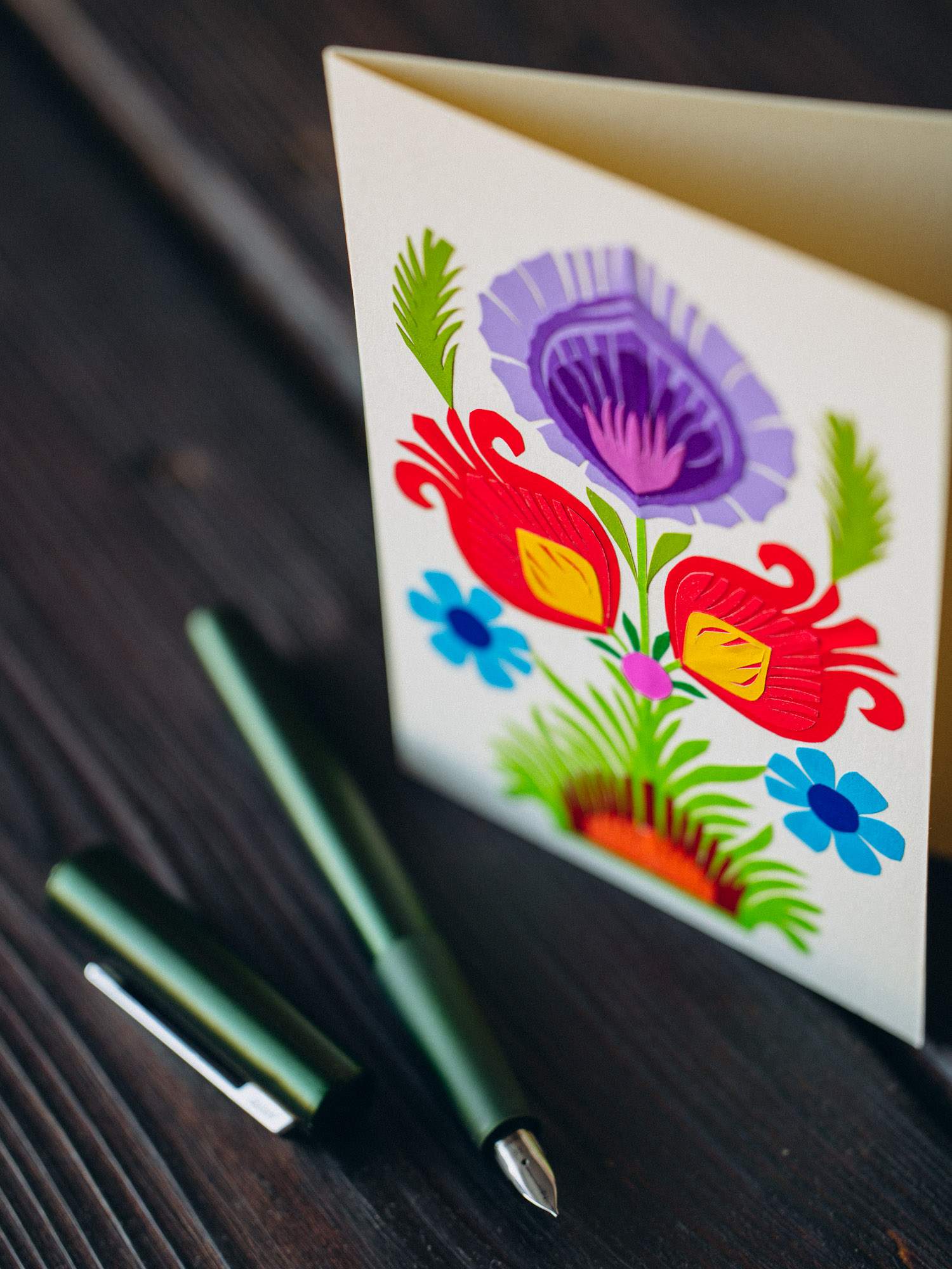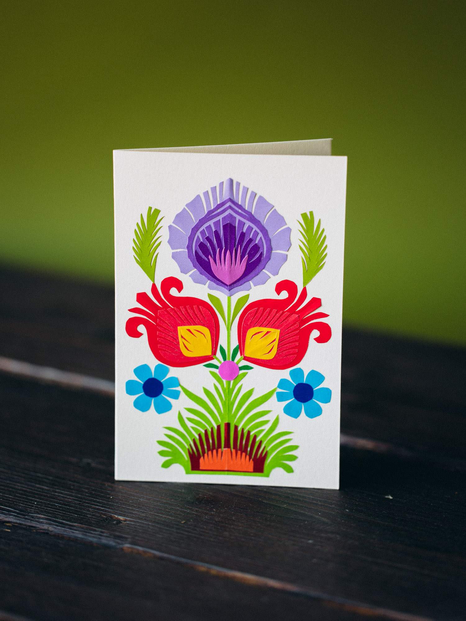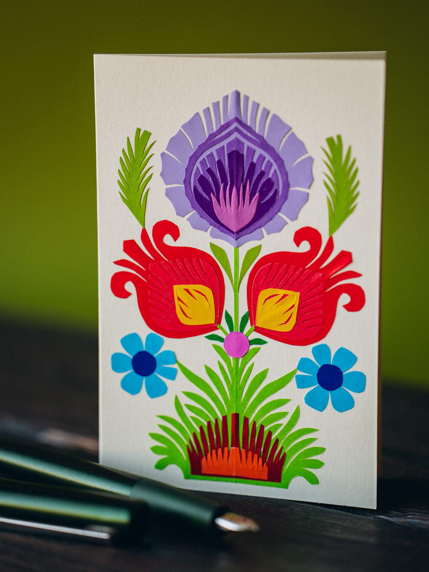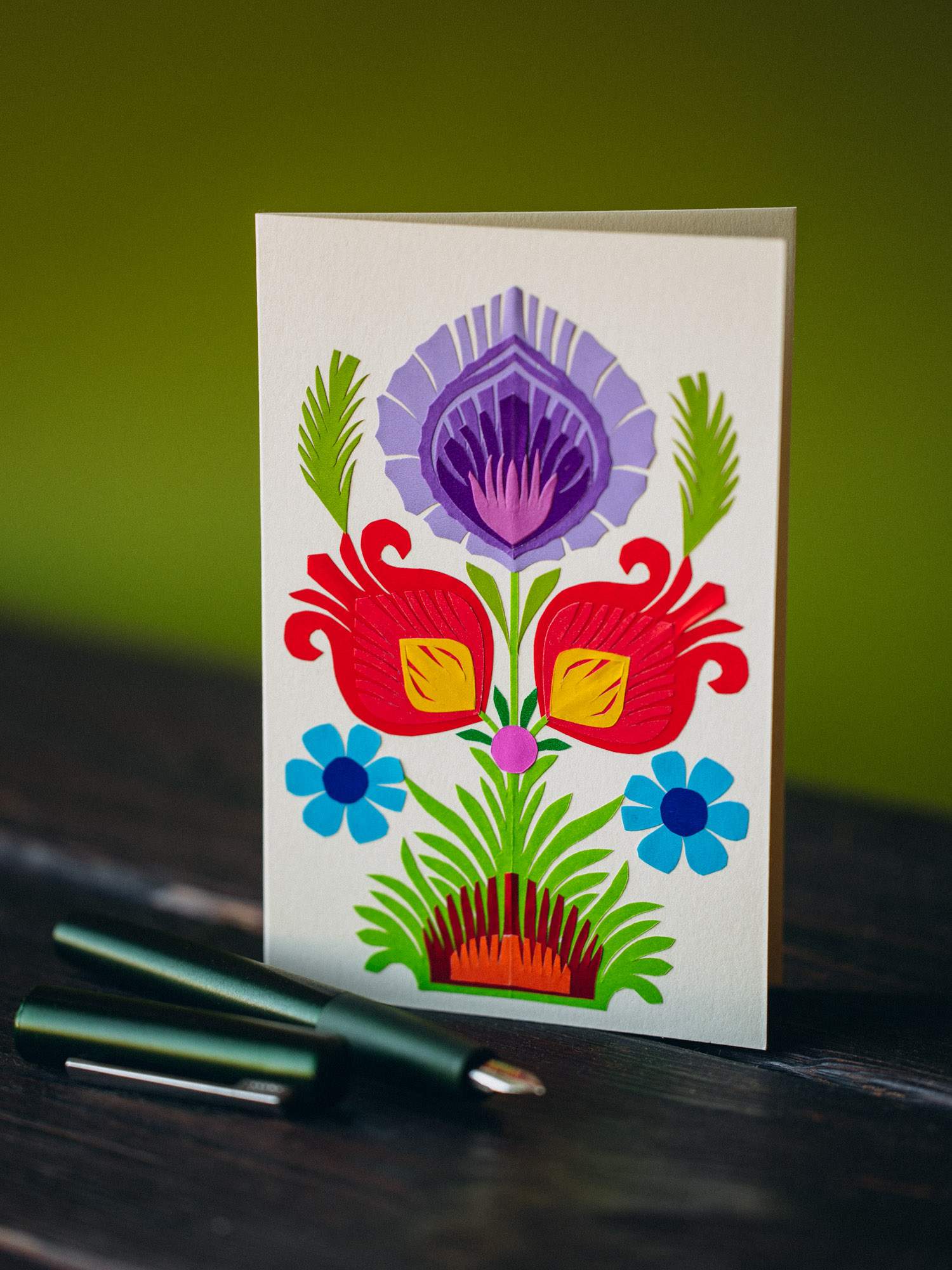 Kartka inspirowana łowicką wycinanką ludową. Barwne kwiaty w odcieniach czerwieni, fioletu i niebieskiego. Idealna na każdą okazję. Wykonana ręcznie przez Twórczynie Ludową z Łowicza.