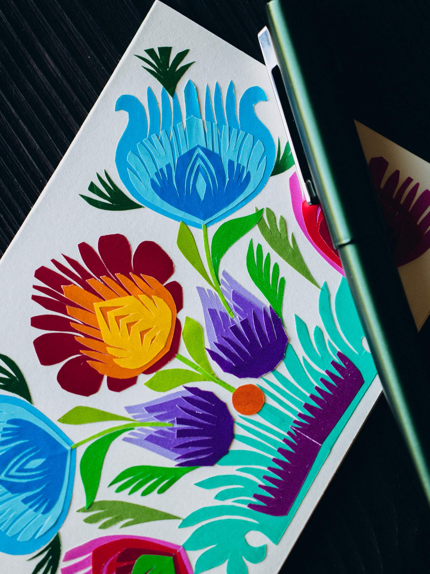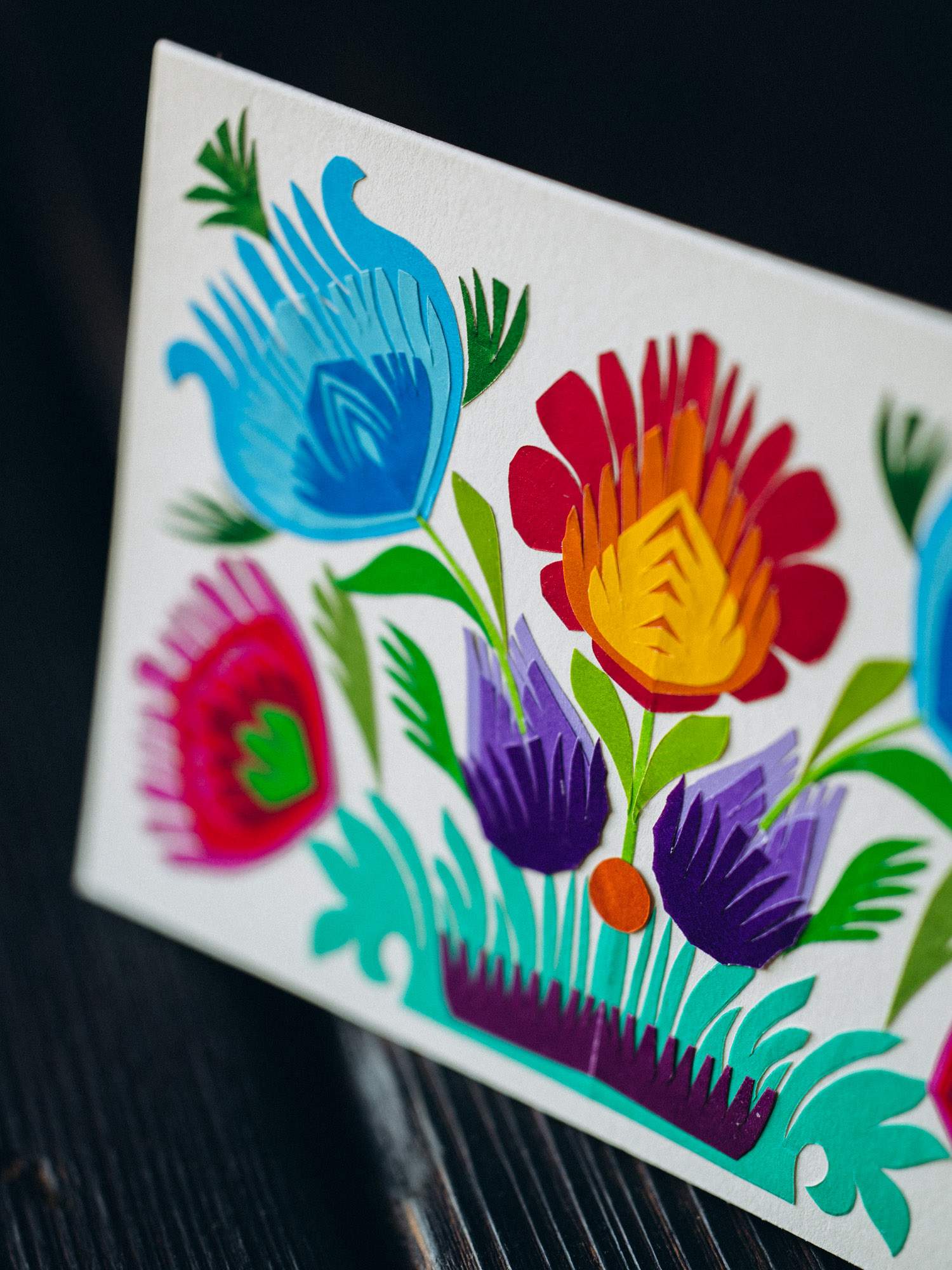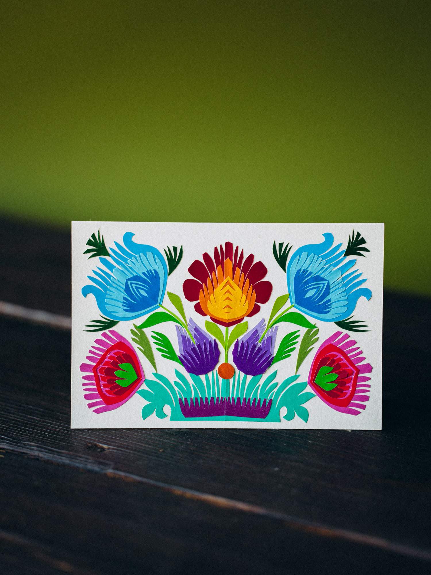 Kolorowa kompozycja kwiatowa inspirowana dawnymi wycinankami papierowymi. Wklejona na papier o charakterystycznej barwie, który swoim kolorem sprawia, że wycinanka wygląda na wiekową - jak z lat 70. Świetnie sprawdzi się jako kartka urodzinowa, imieninowa lub pamiątka z Polski.