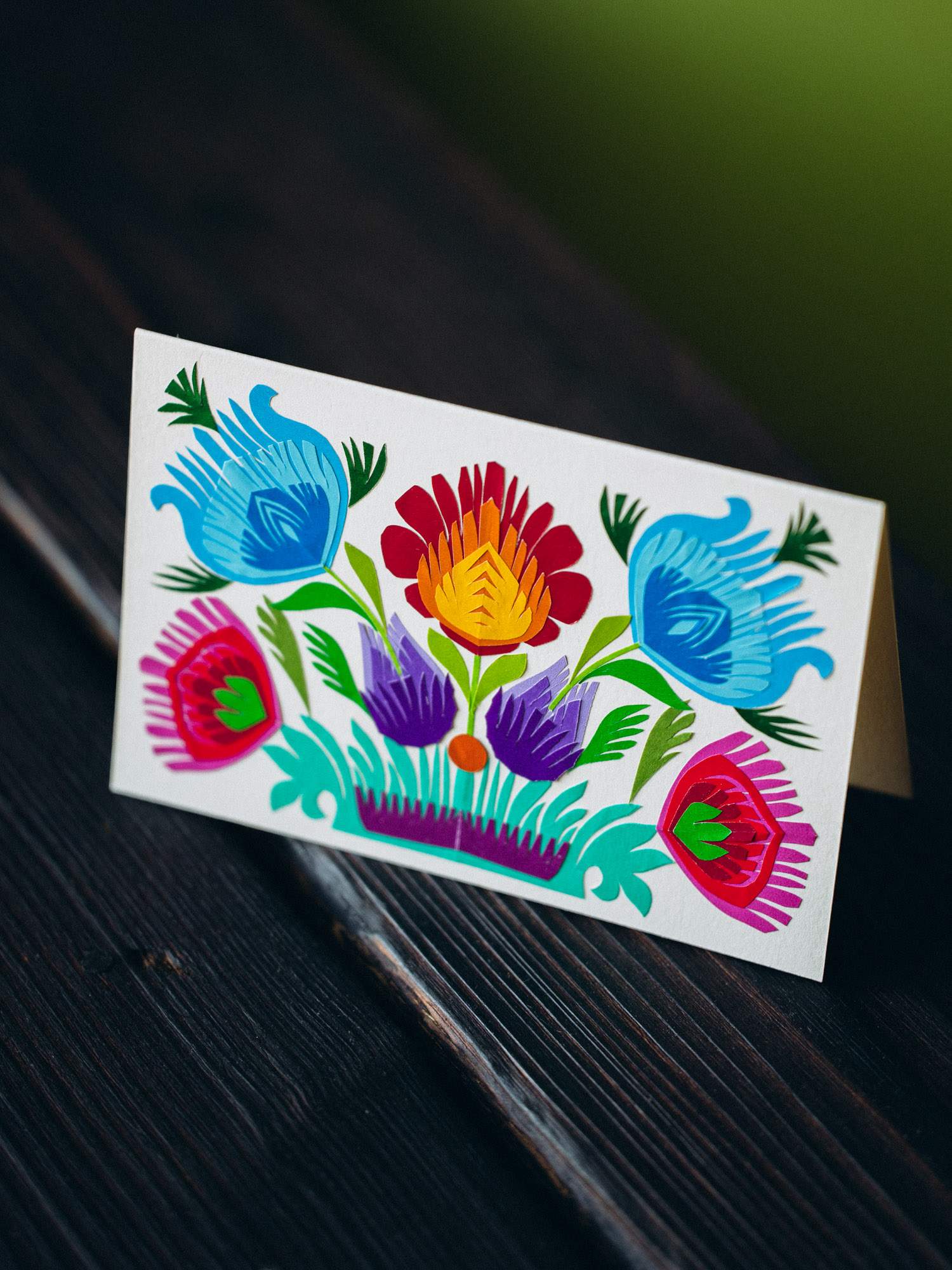 Kartka w postaci łowickiej wycinanki, przedstawiająca kolorowe polne kwiaty.