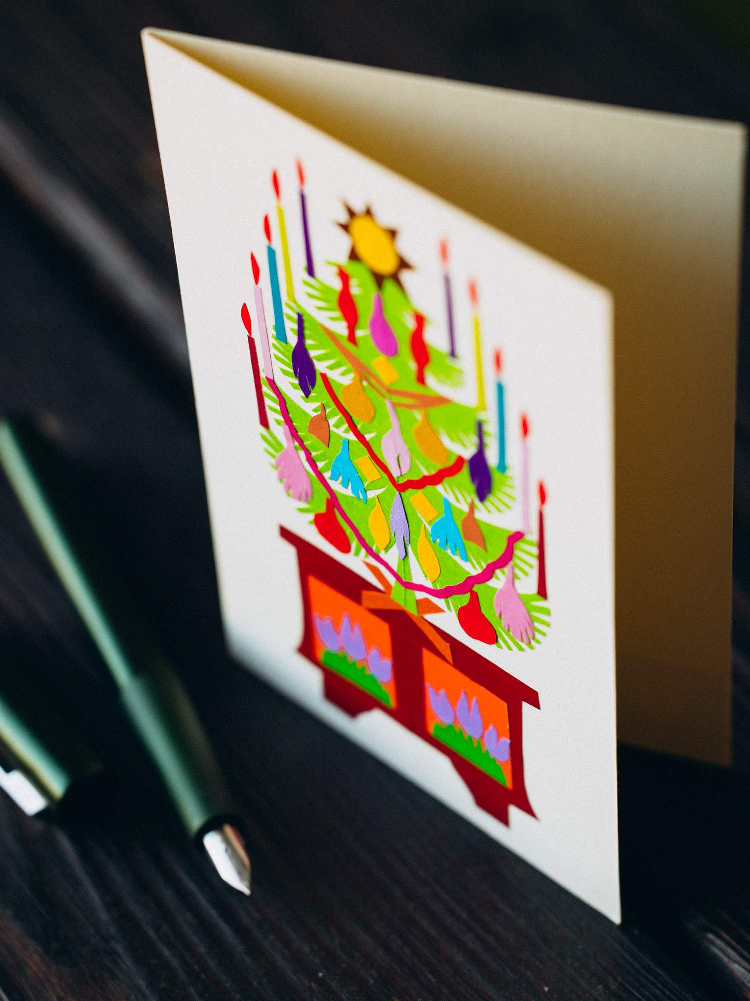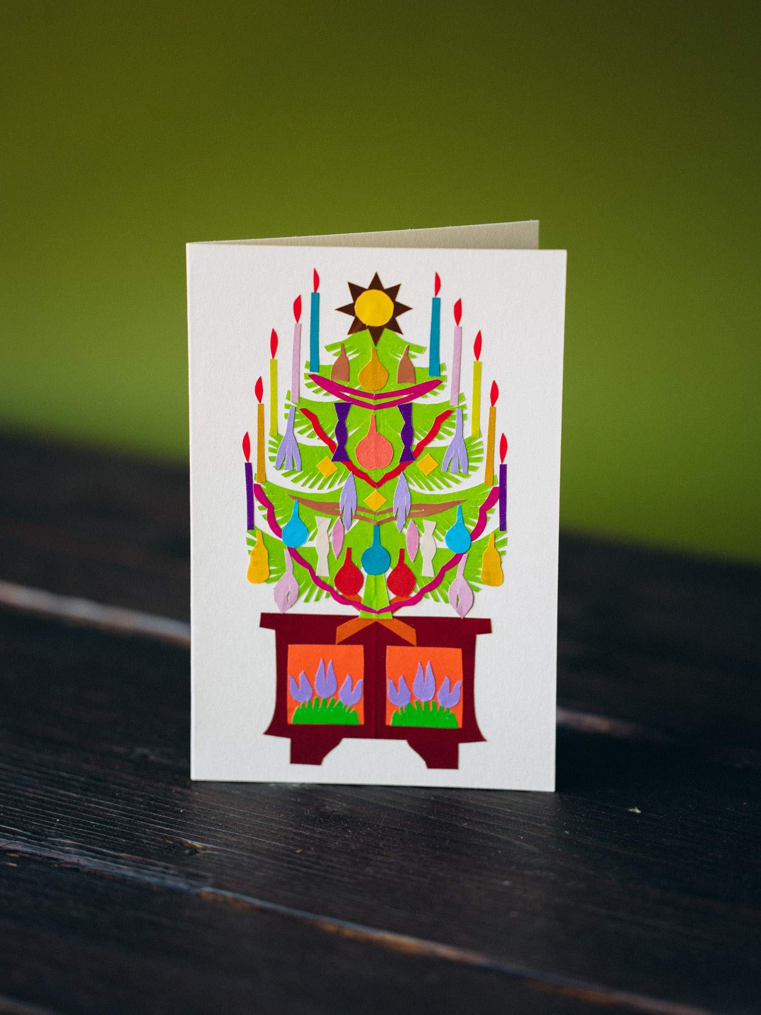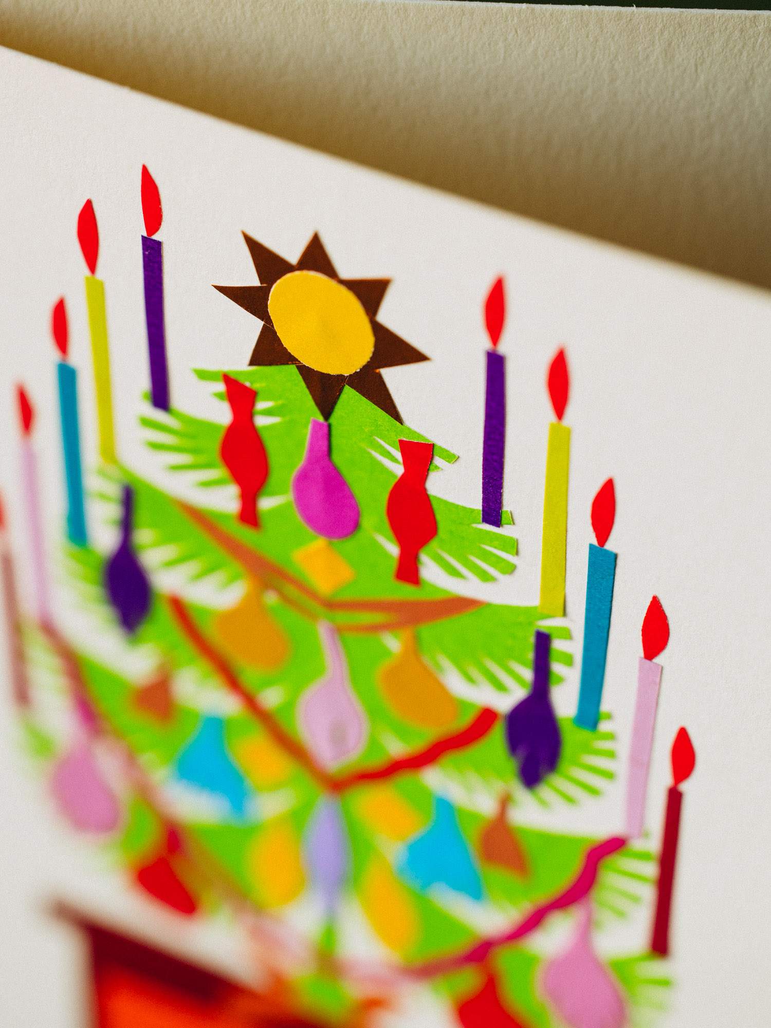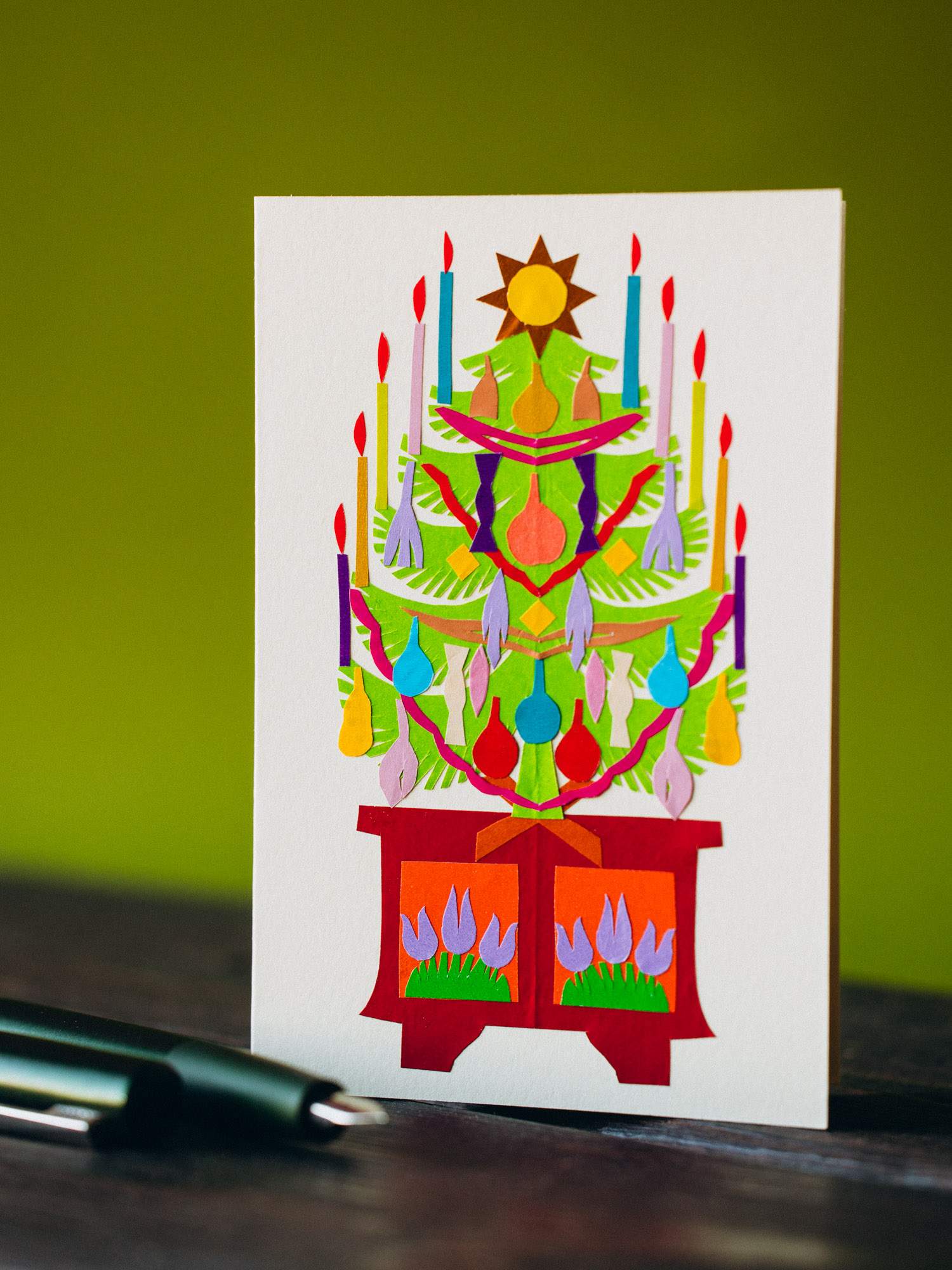 Kartka świąteczna przedstawiająca choinkę, ozdobioną w kolorowe bombki, łańcuchy i świece. Na czubku znajduję się żółta gwiazda. Choinka stoi na czerwonej skrzyni. Wykonana przez Twórczynie Ludową z Łowicza.