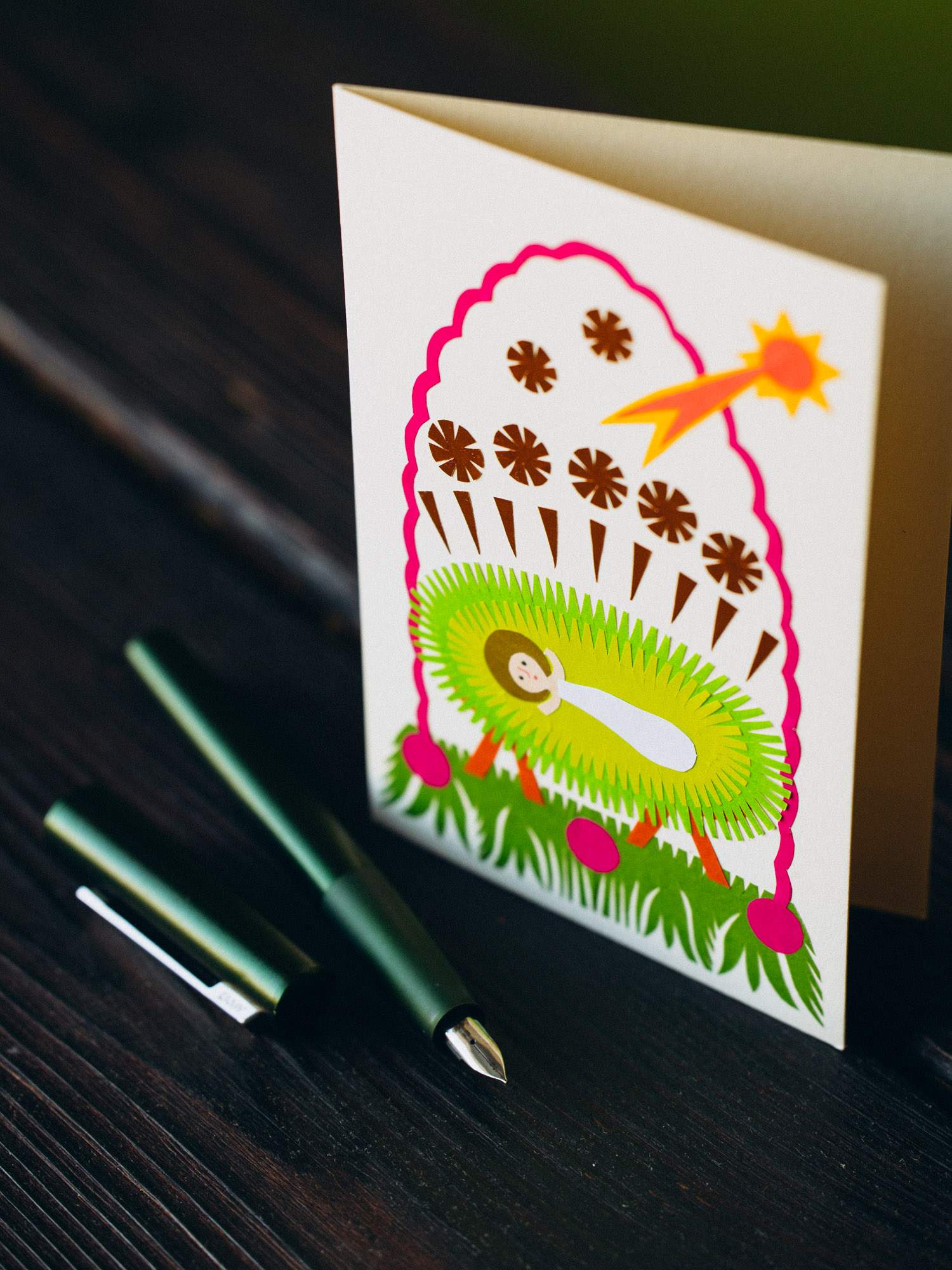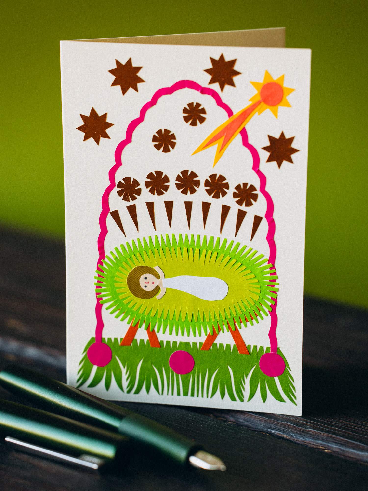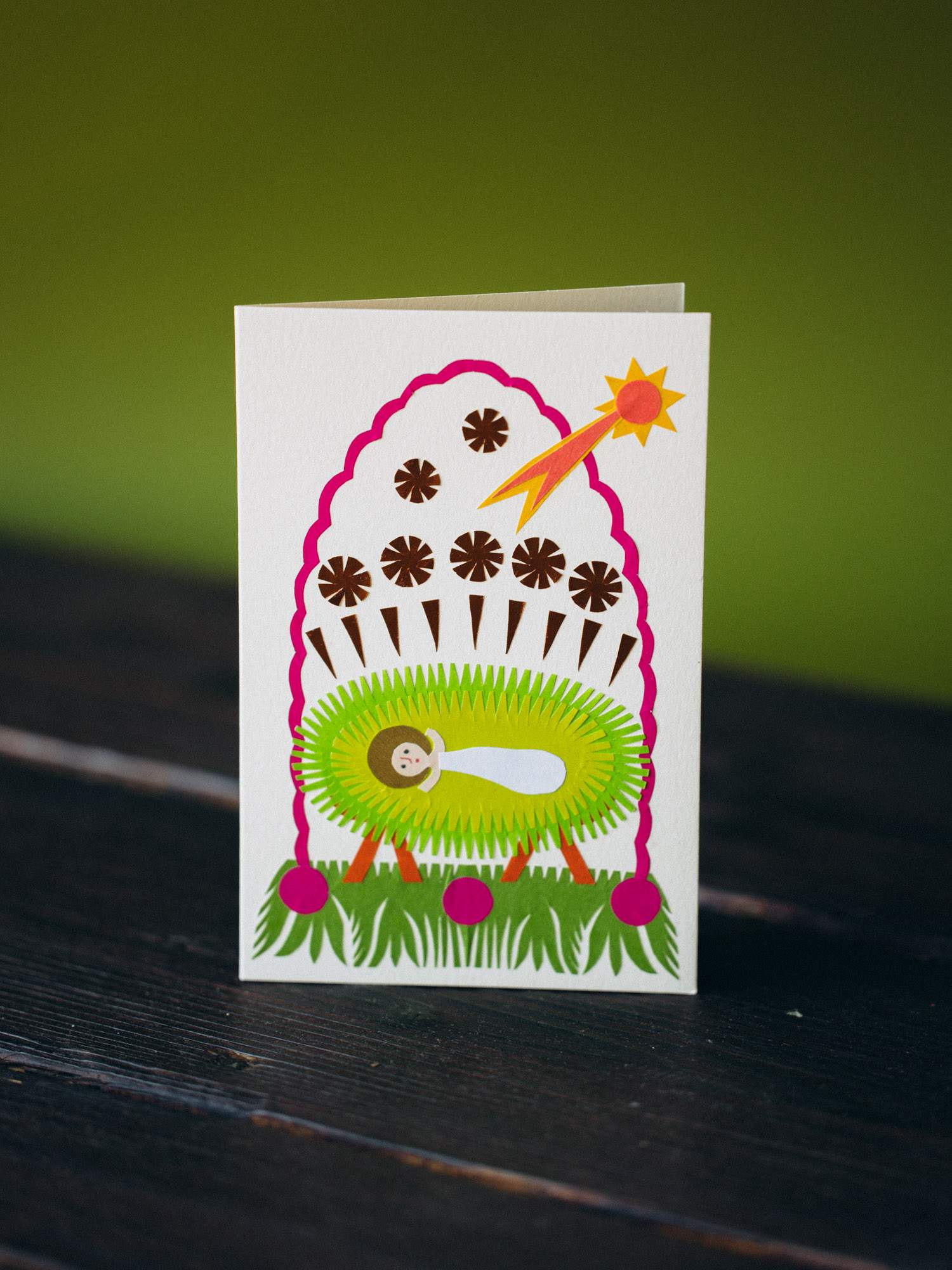 Kartka przedstawiająca Dzieciątko Jezusa leżące w zielonym żłobie. Nad sceną błyszczy złota gwiazda betlejemska, a wokół niej krążą drobne gwiazdki. Tradycyjny motyw Bożego Narodzenia ujęty w stylistyce polskiej wycinanki.
