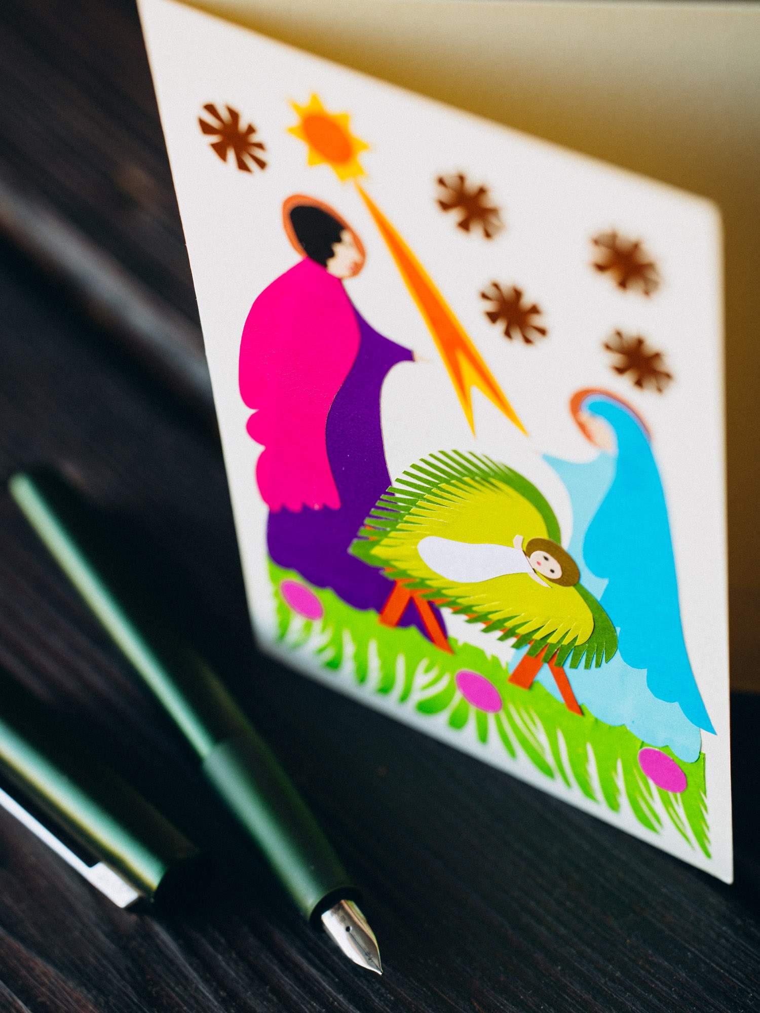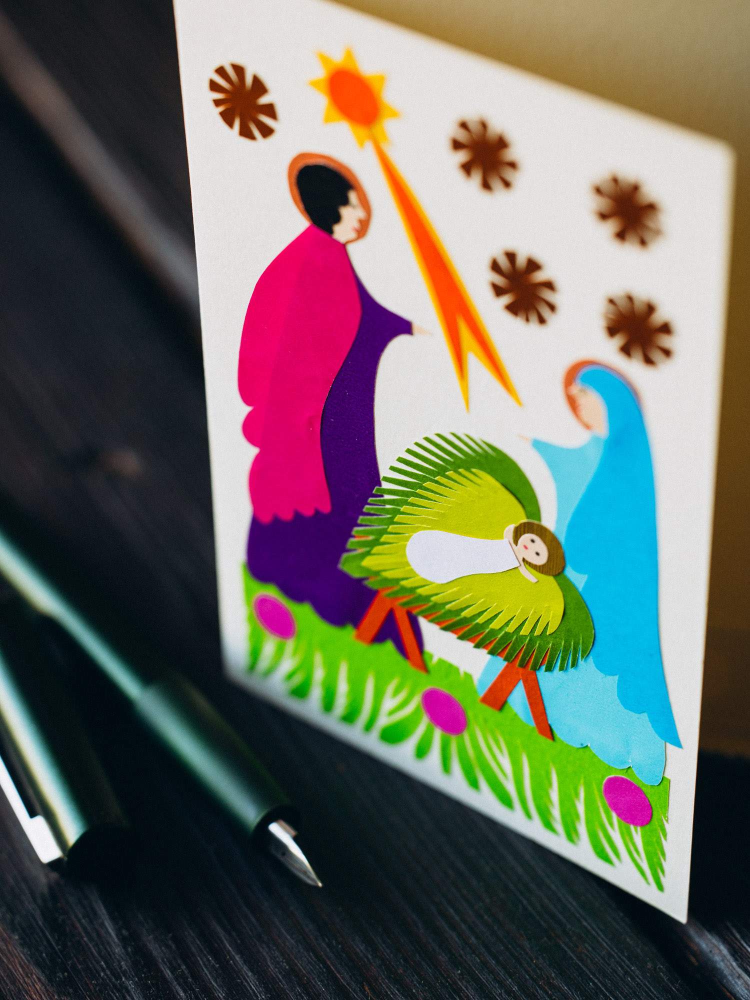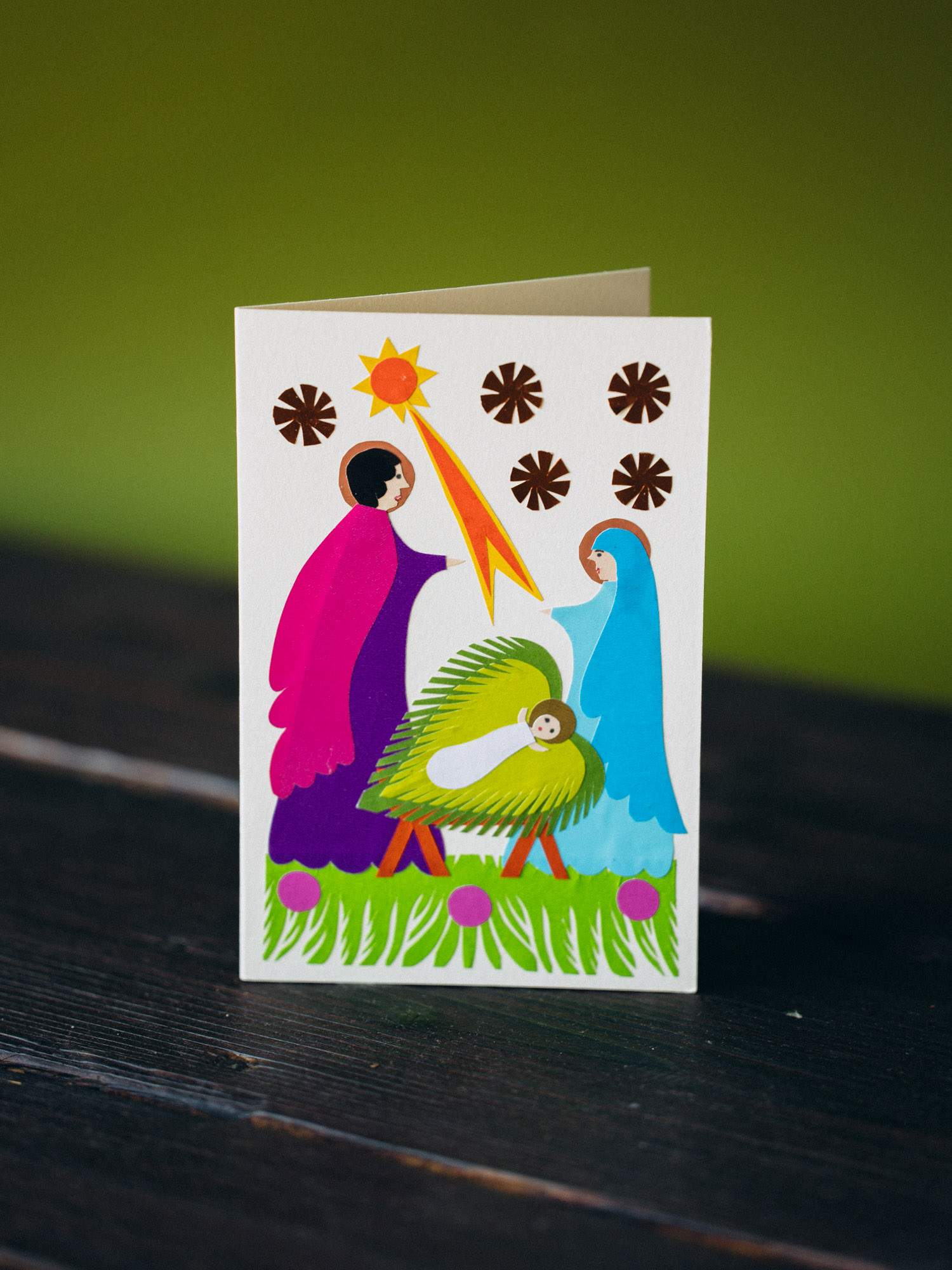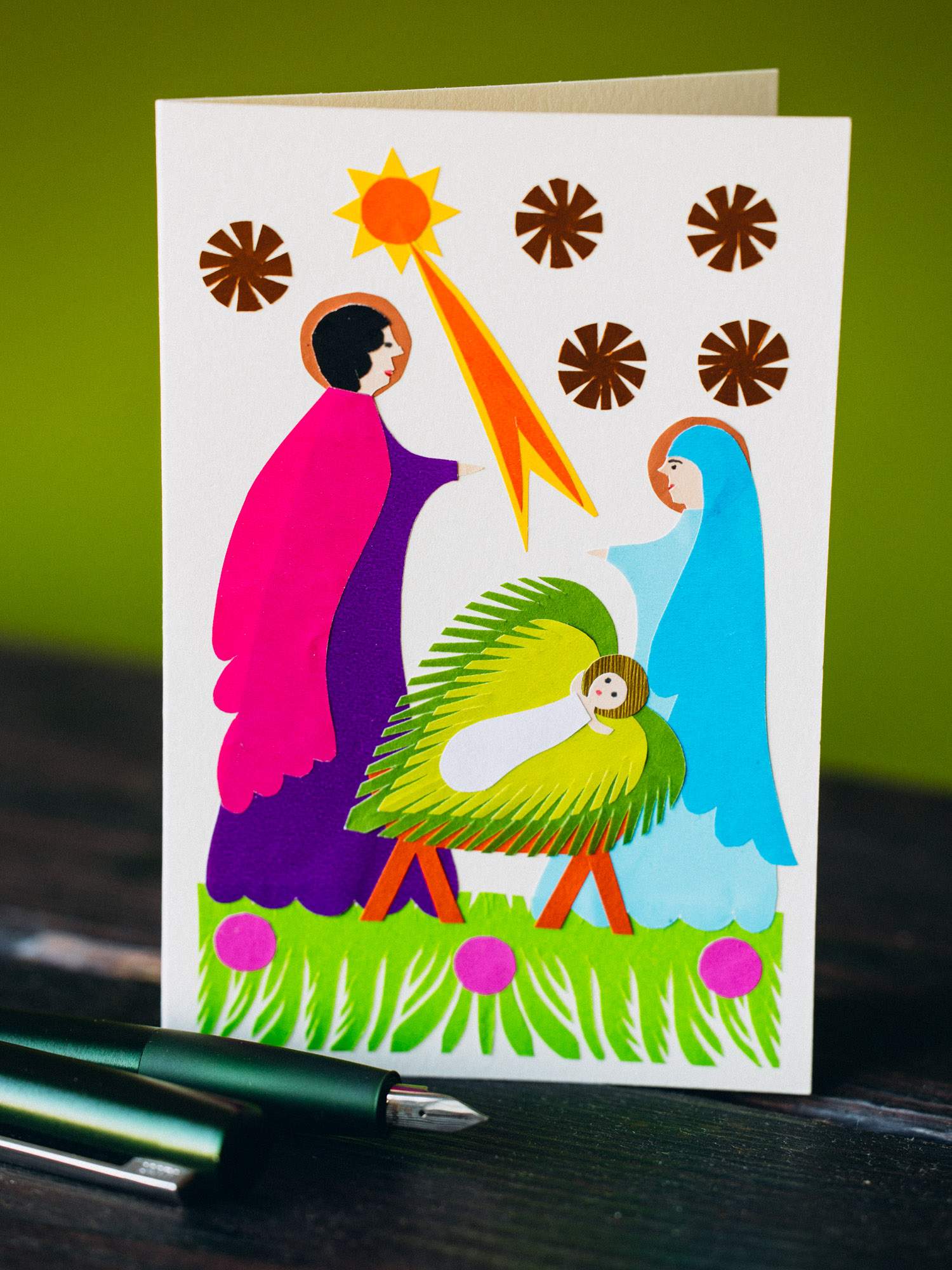 Ręcznie wykonana z precyzją kartka świąteczna, przedstawiająca Dzieciątko w żłobie z Maryją i Józefem.