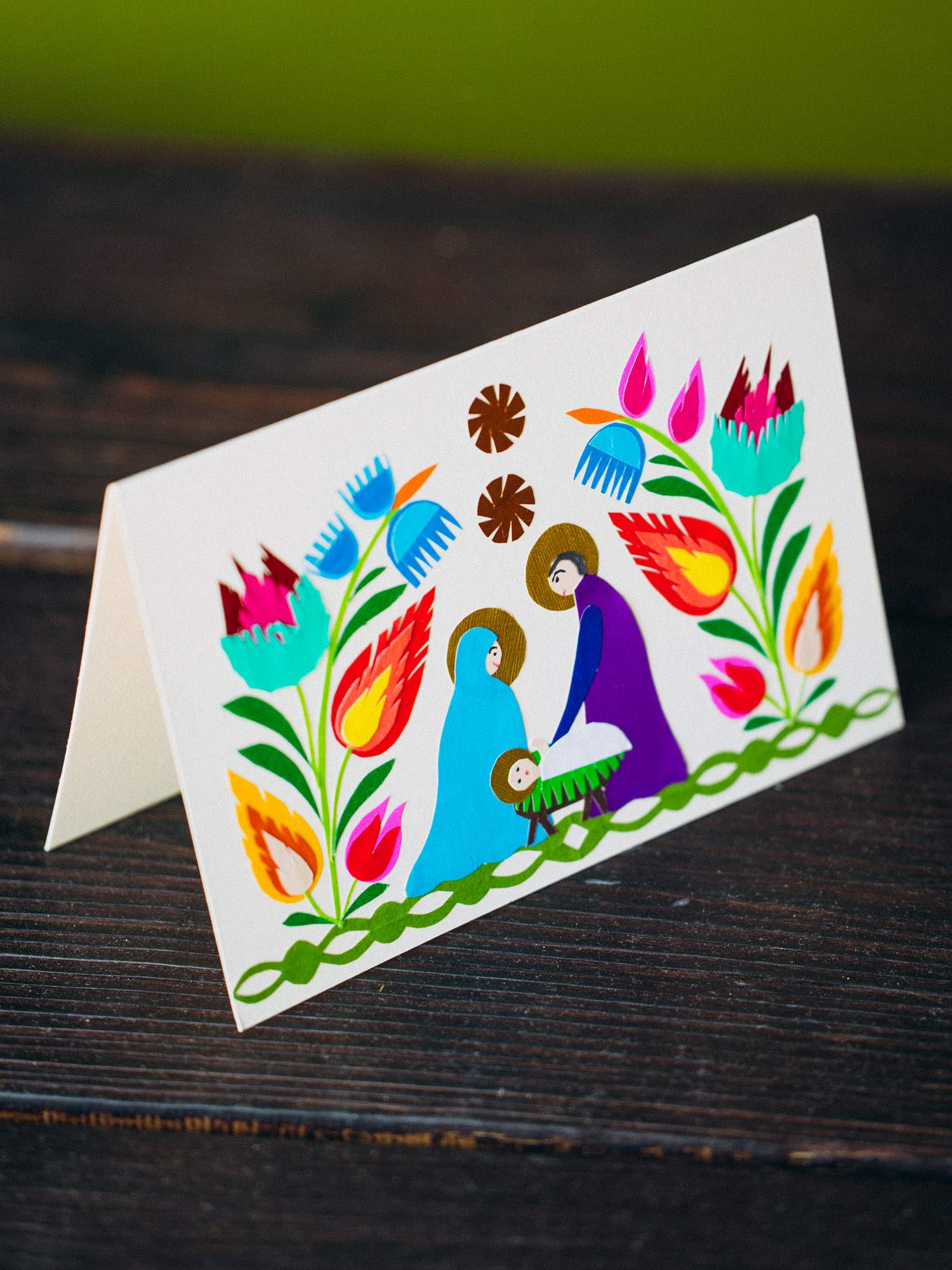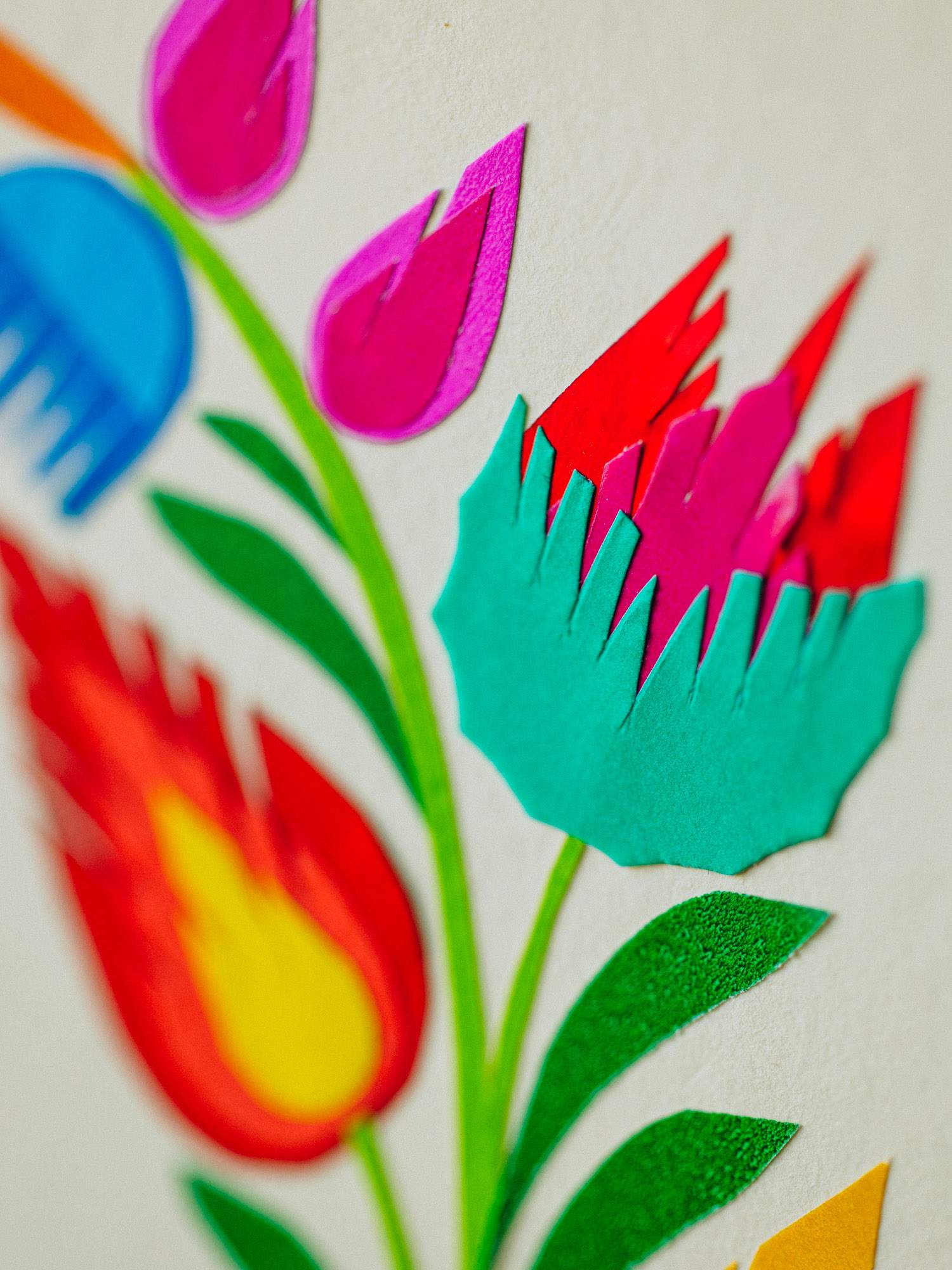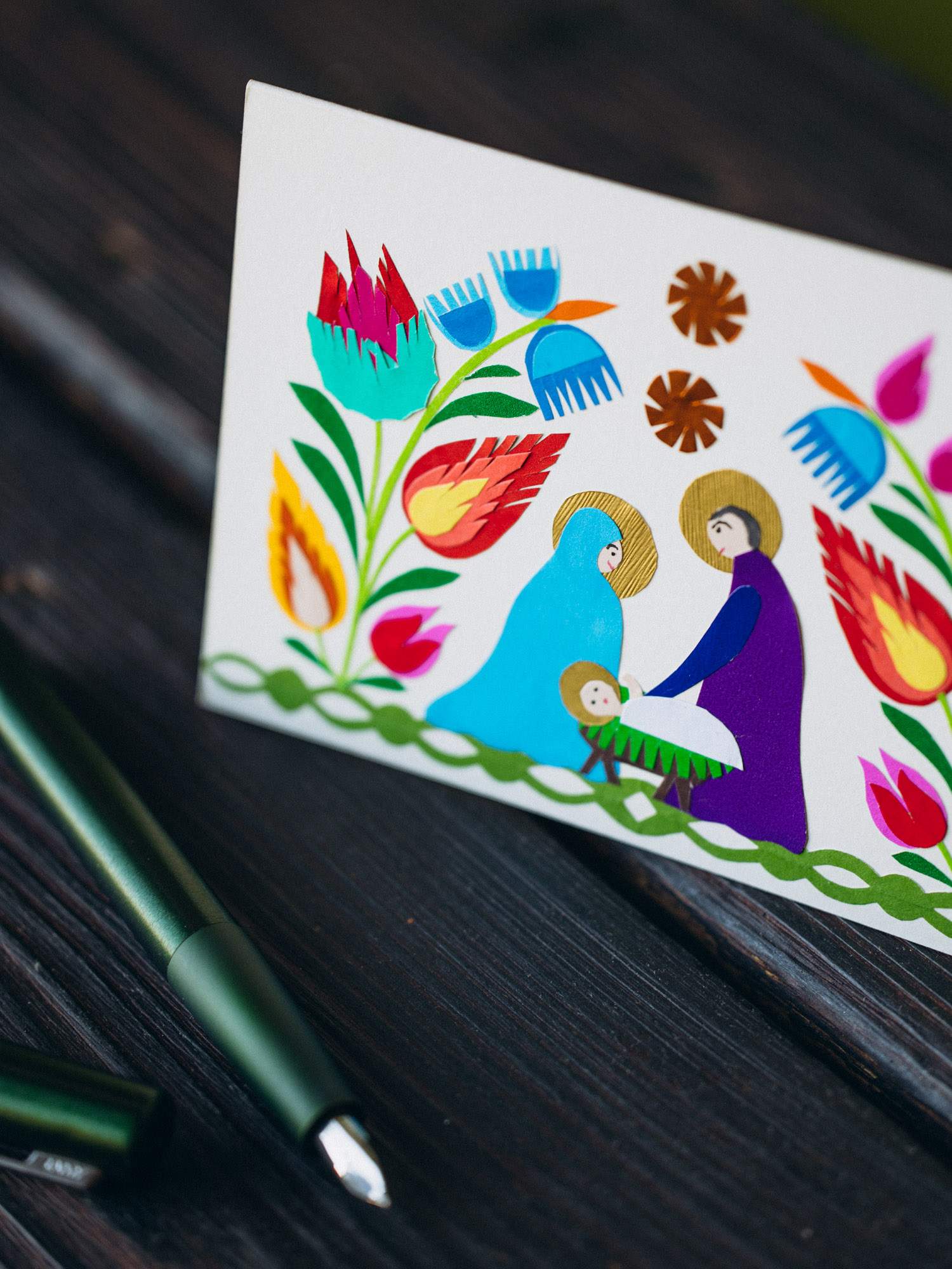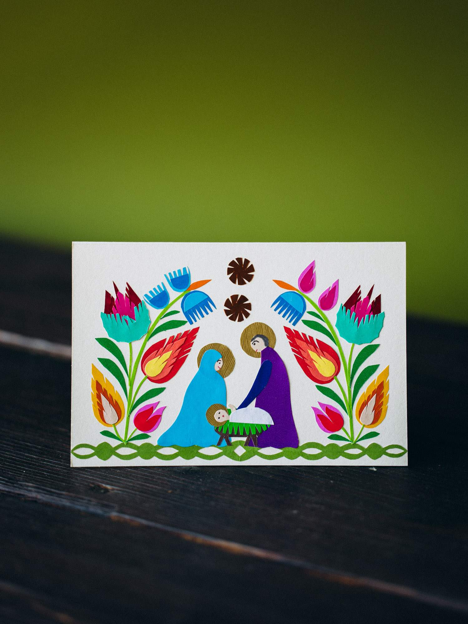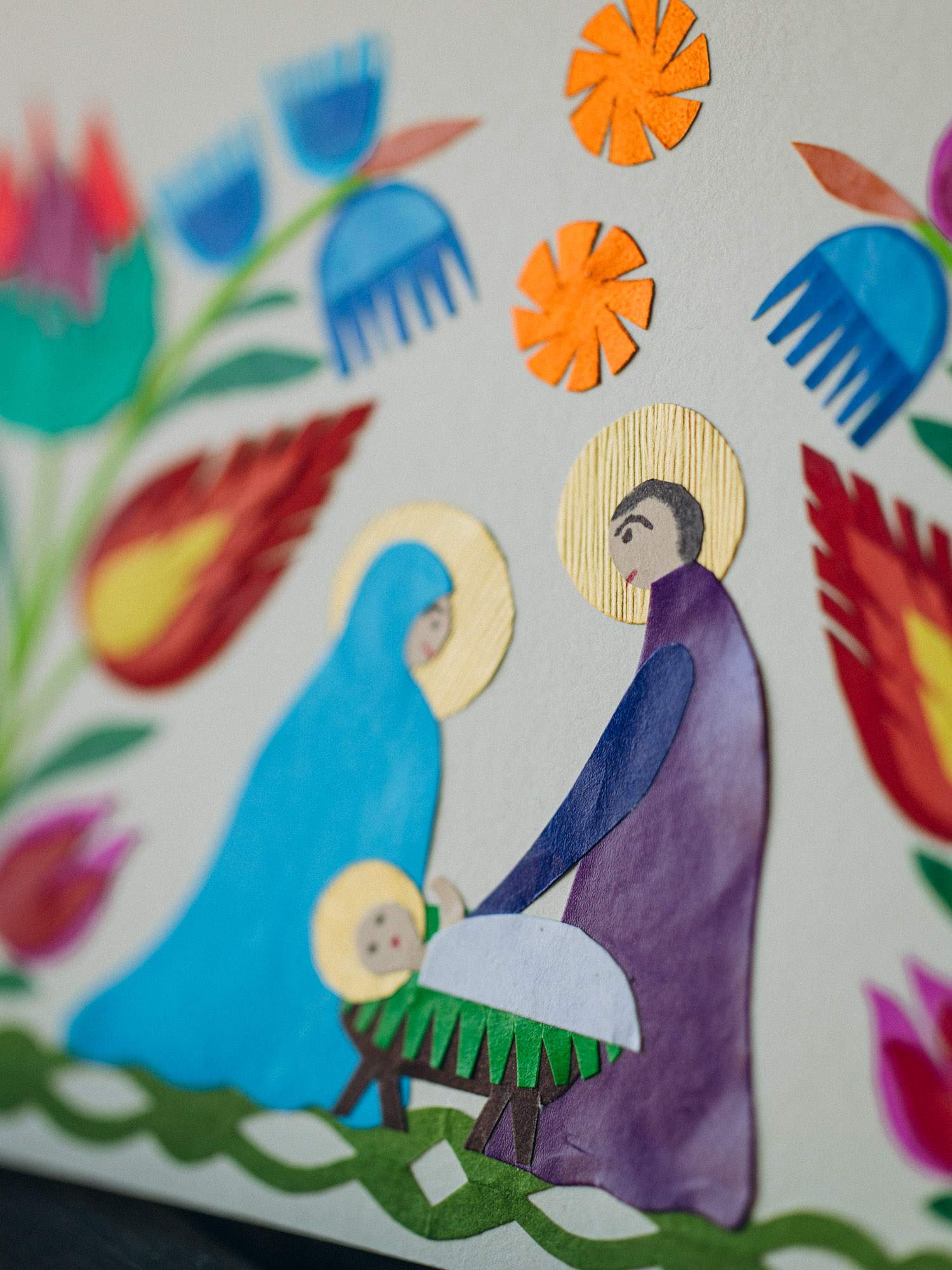 Barwna i radosna wycinanka ukazująca Maryję, Józefa i Dzieciątko w otoczeniu kwiatów i liści. Tradycyjny motyw Bożego Narodzenia ujęty w stylistyce polskiej wycinanki. Wykonana przez Twórczynie Ludową z Łowicza.