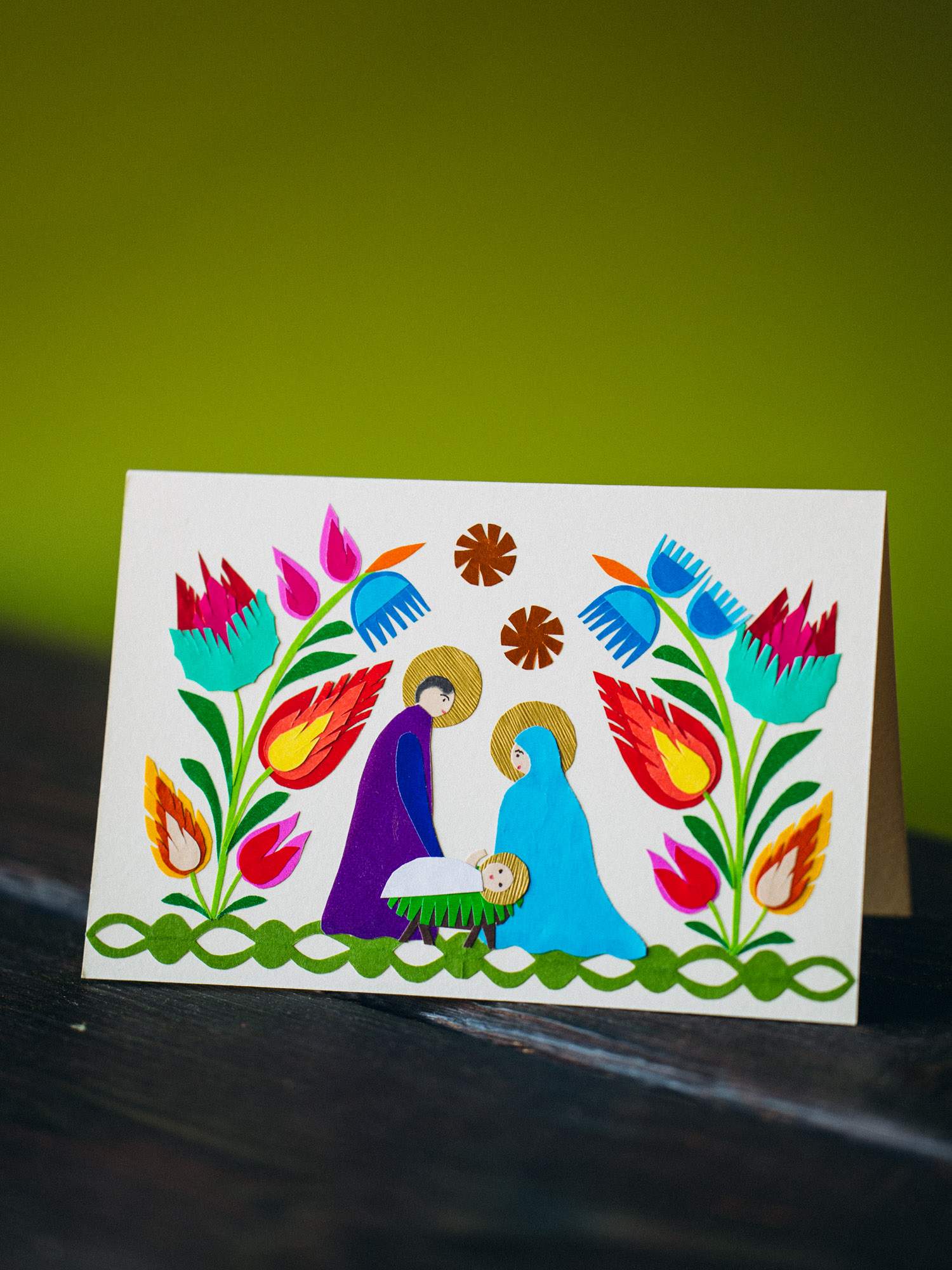 Kartka wycinanka świąteczna - Dzieciątko z rodzicami w kwiatach
