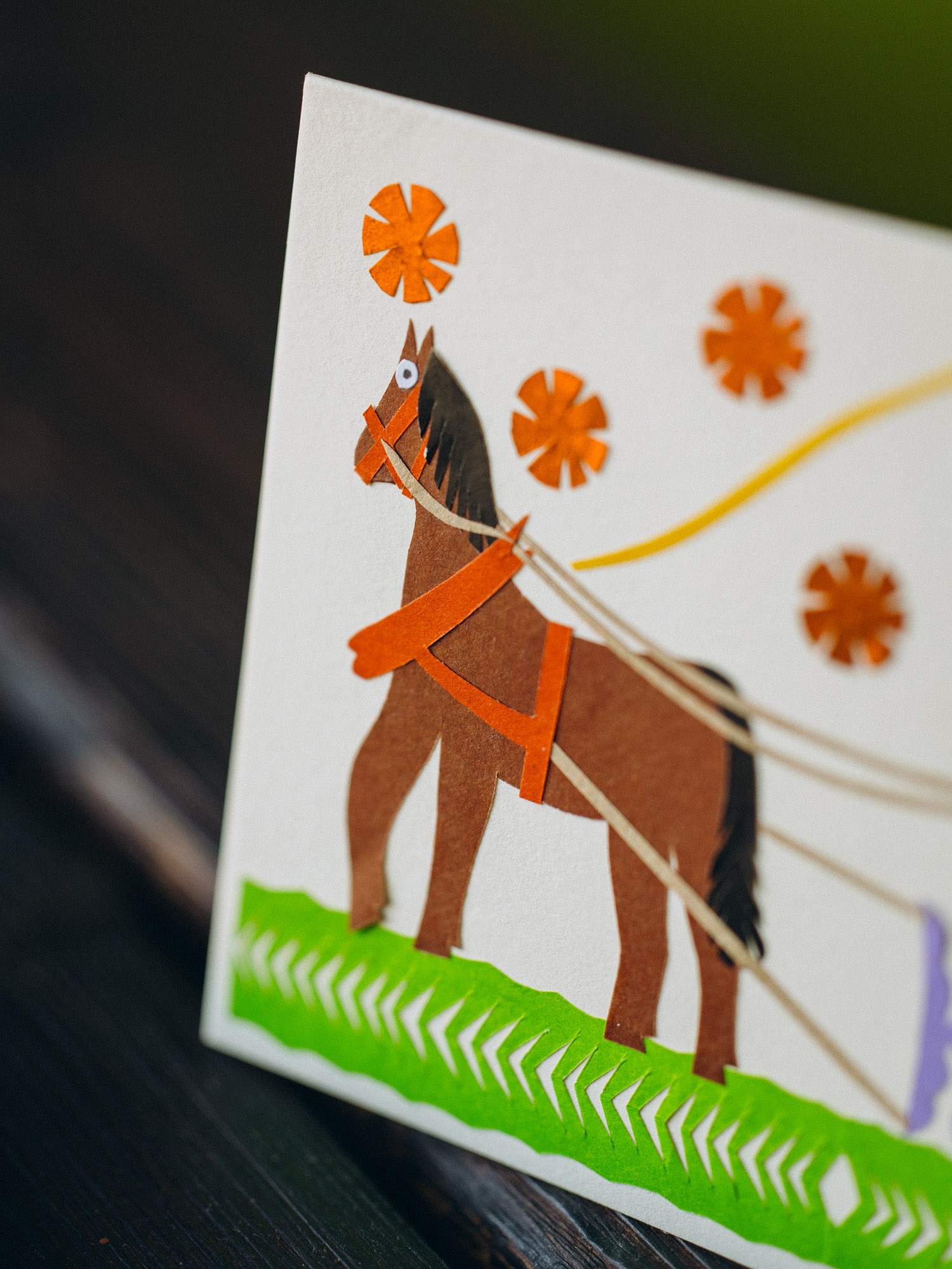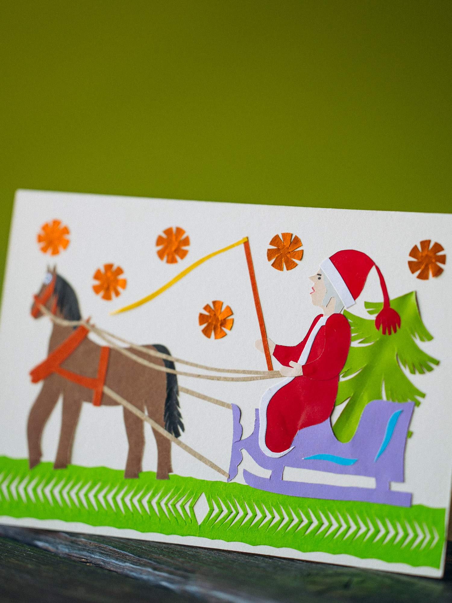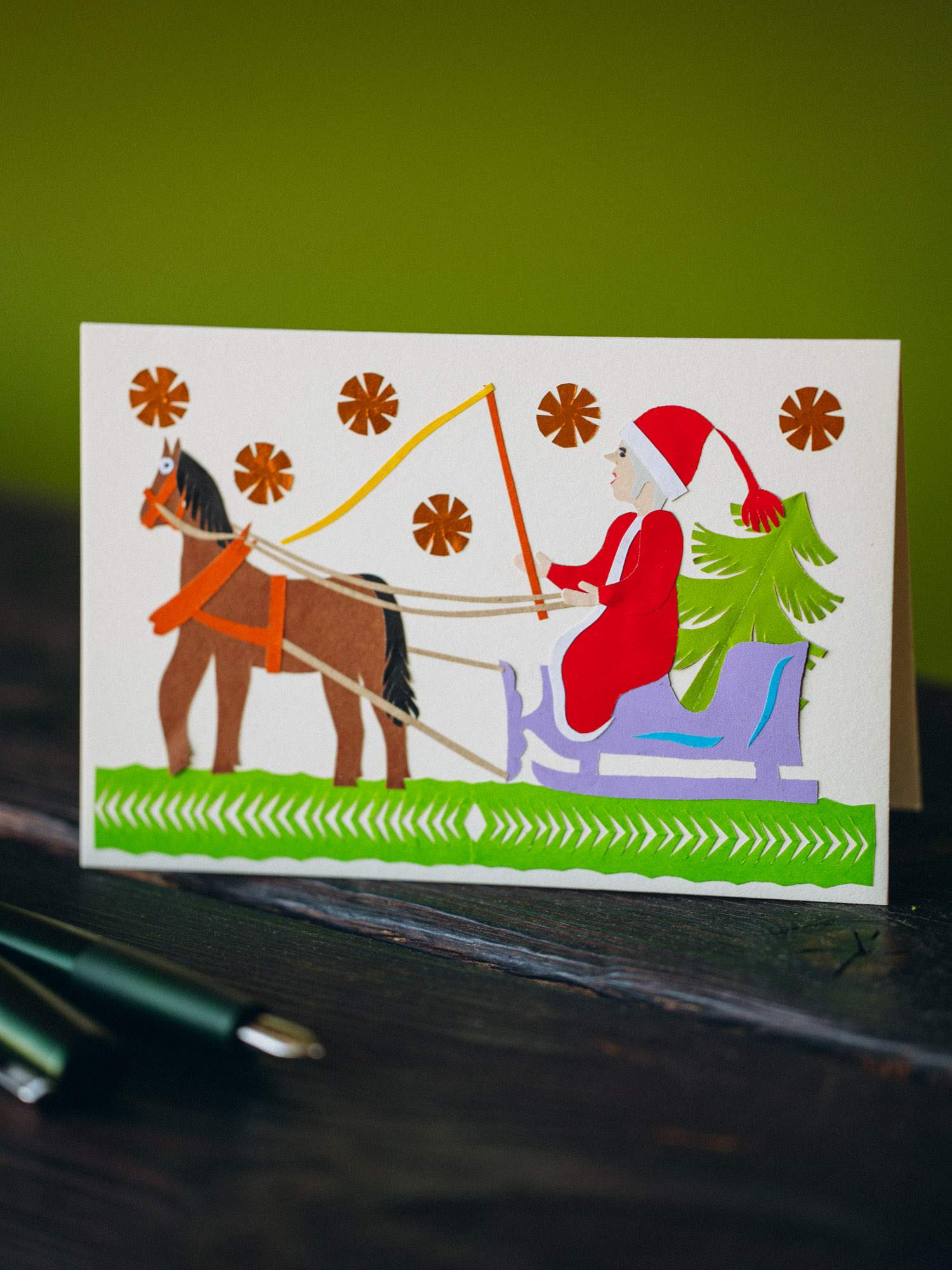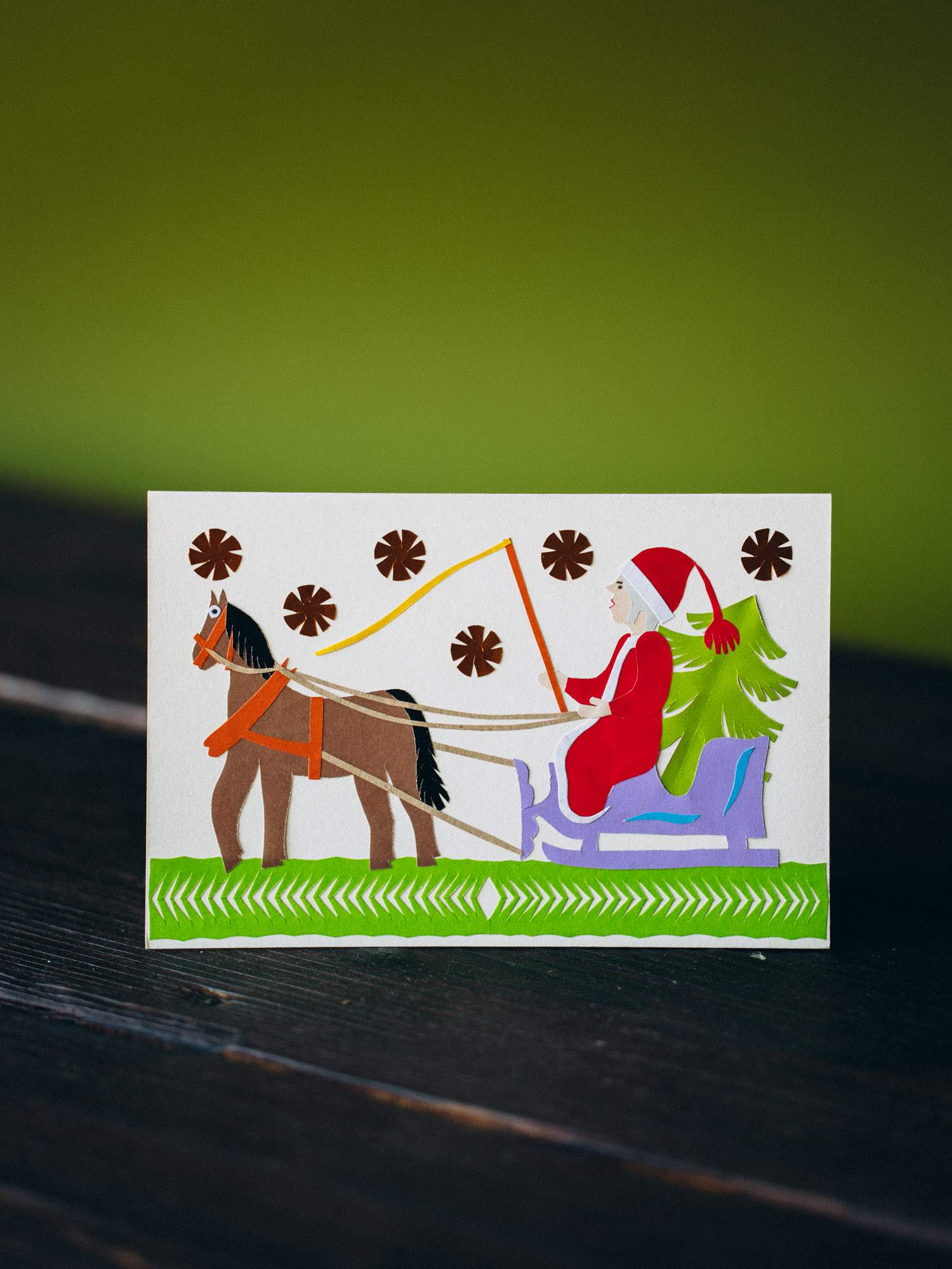Wycinanka w postaci świątecznej kartki umieszczonej na kremowym papierze. Na kartce znajduje się Święty Mikołaj na saniach, który trzyma w dłoniach lejce. Sanie ciągnie duży brązowy koń. Wycinanka została wykonana przez Twórczynie Ludową z Łowicza.