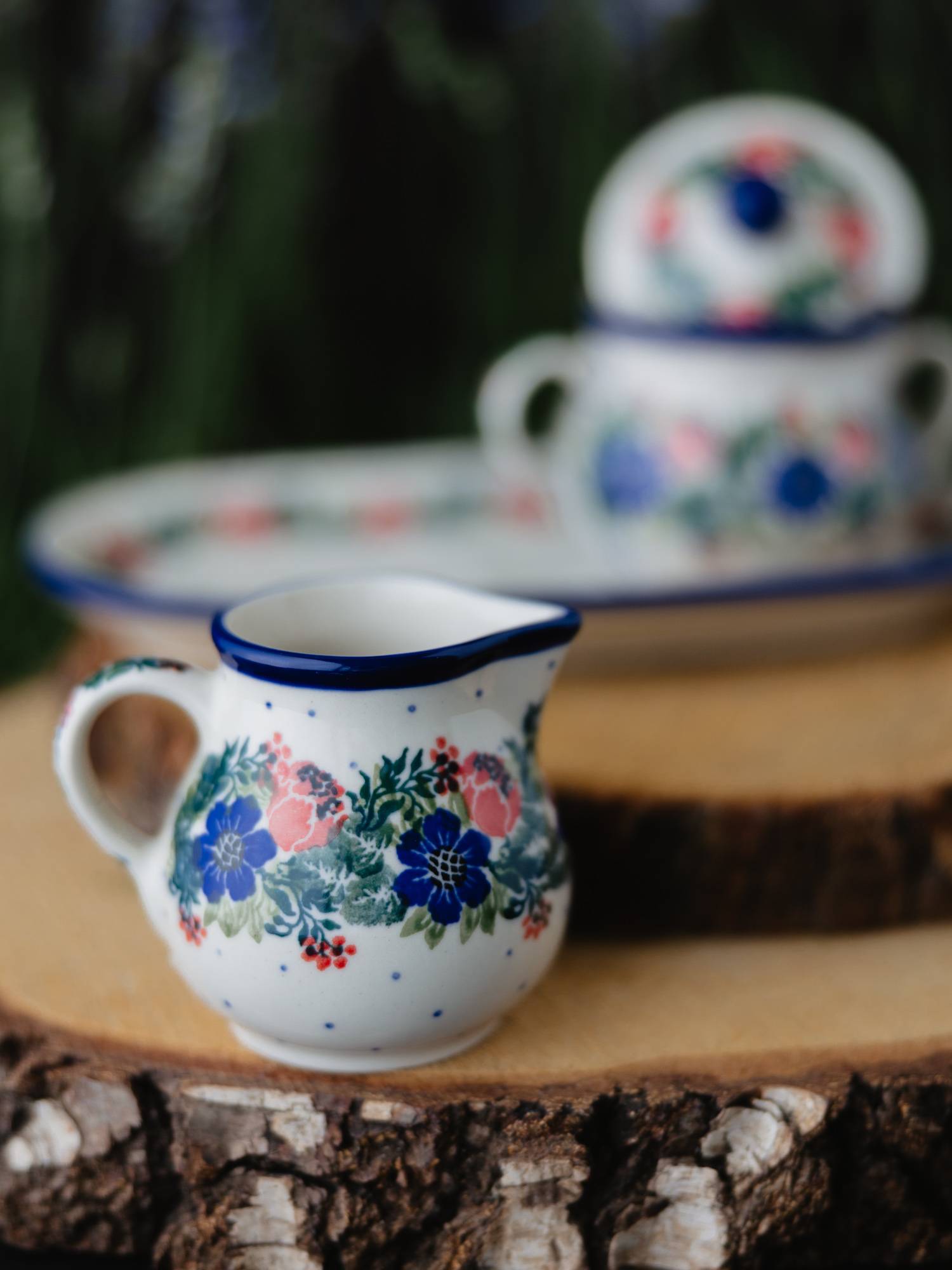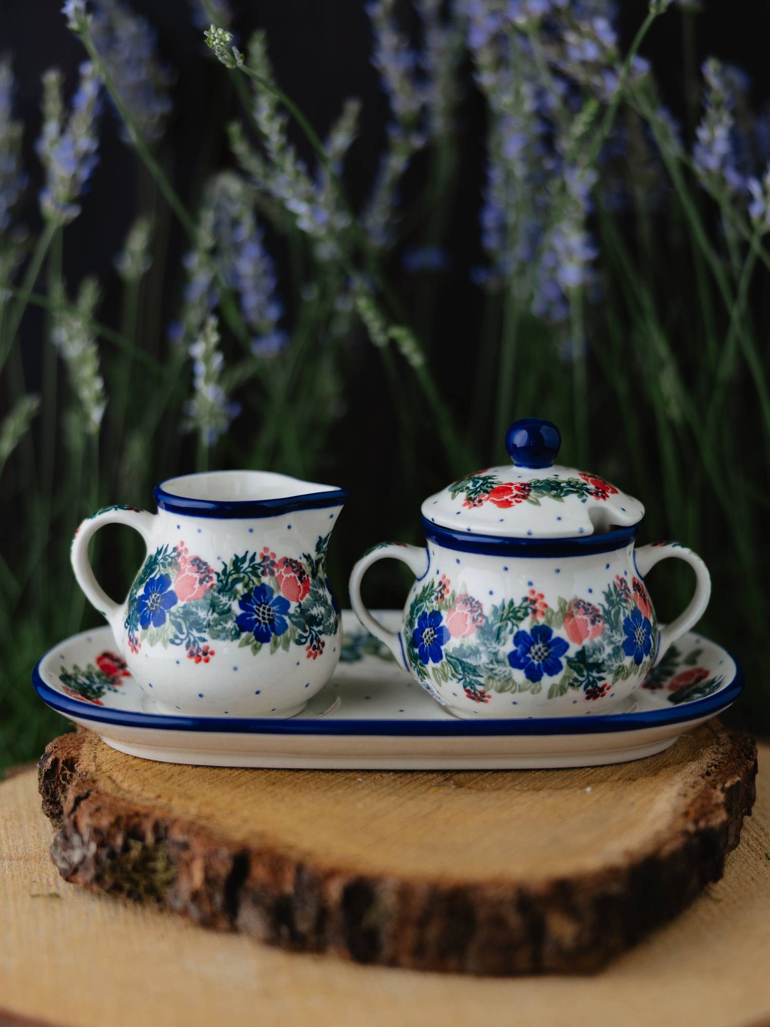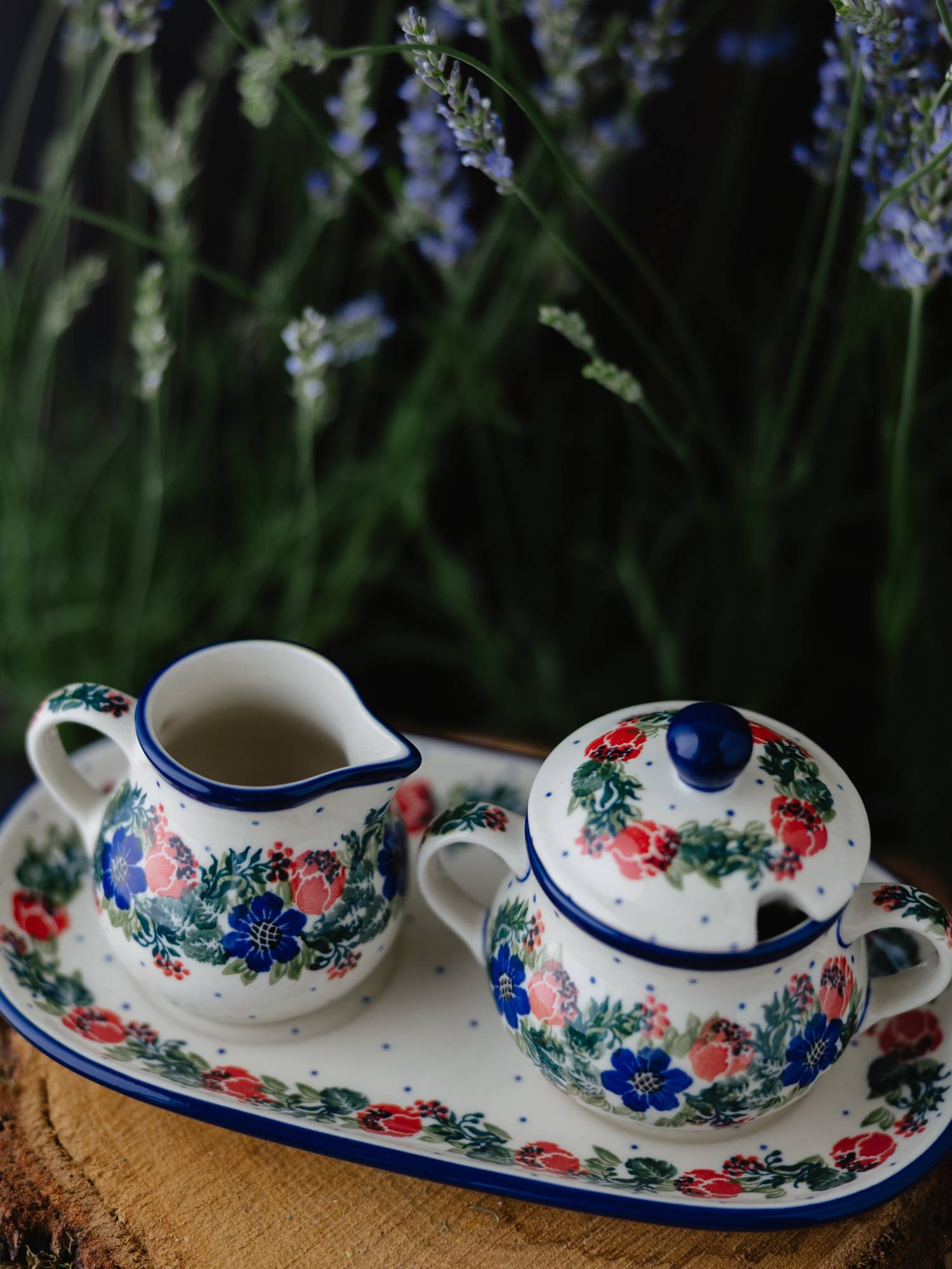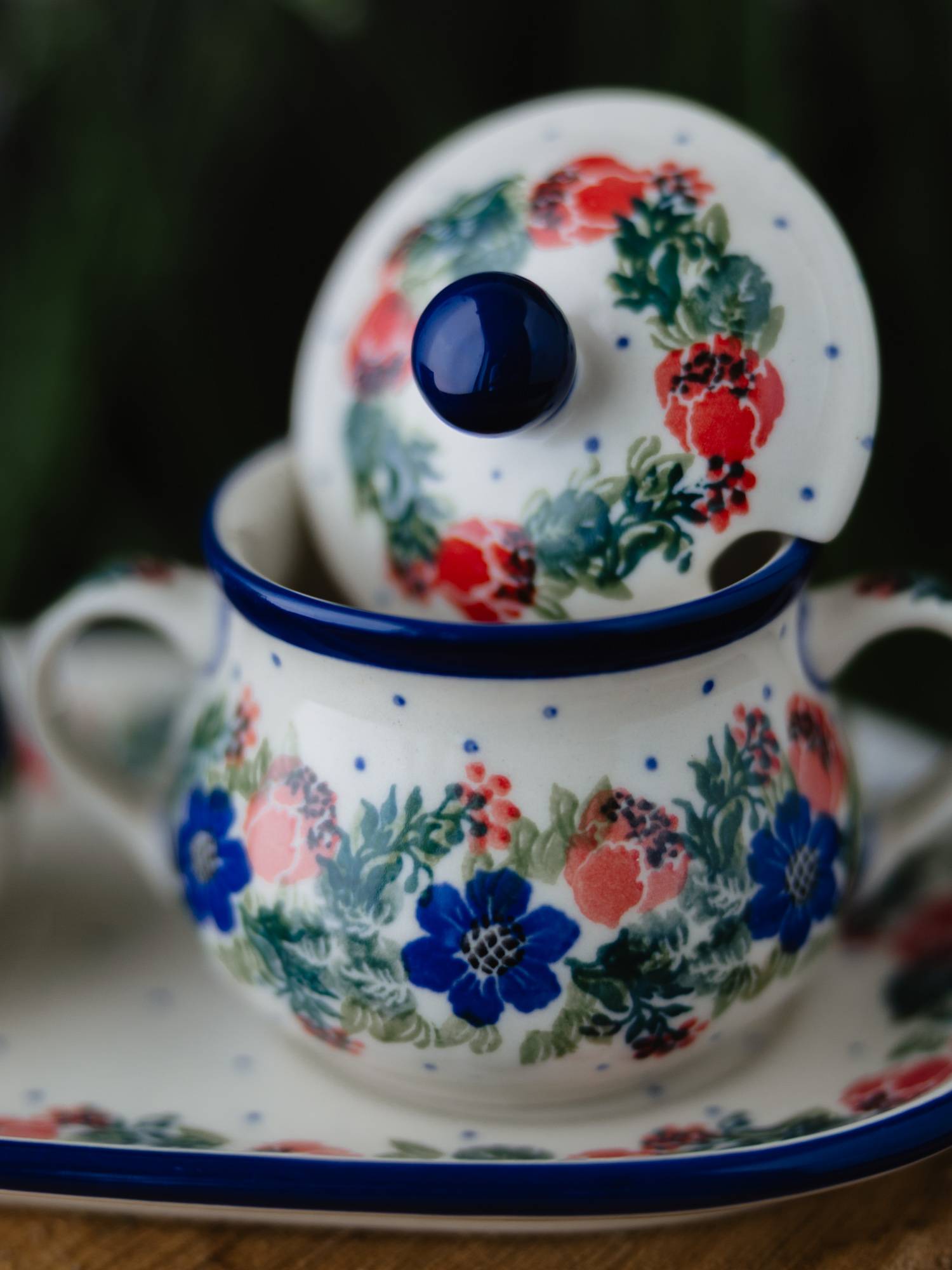Cukiernica i mlecznik w komplecie z dużym, owalnym podstawkiem. Ozdobione kwiatowym, kobaltowo-zielonym wzorem wianka z czerwonymi makami.