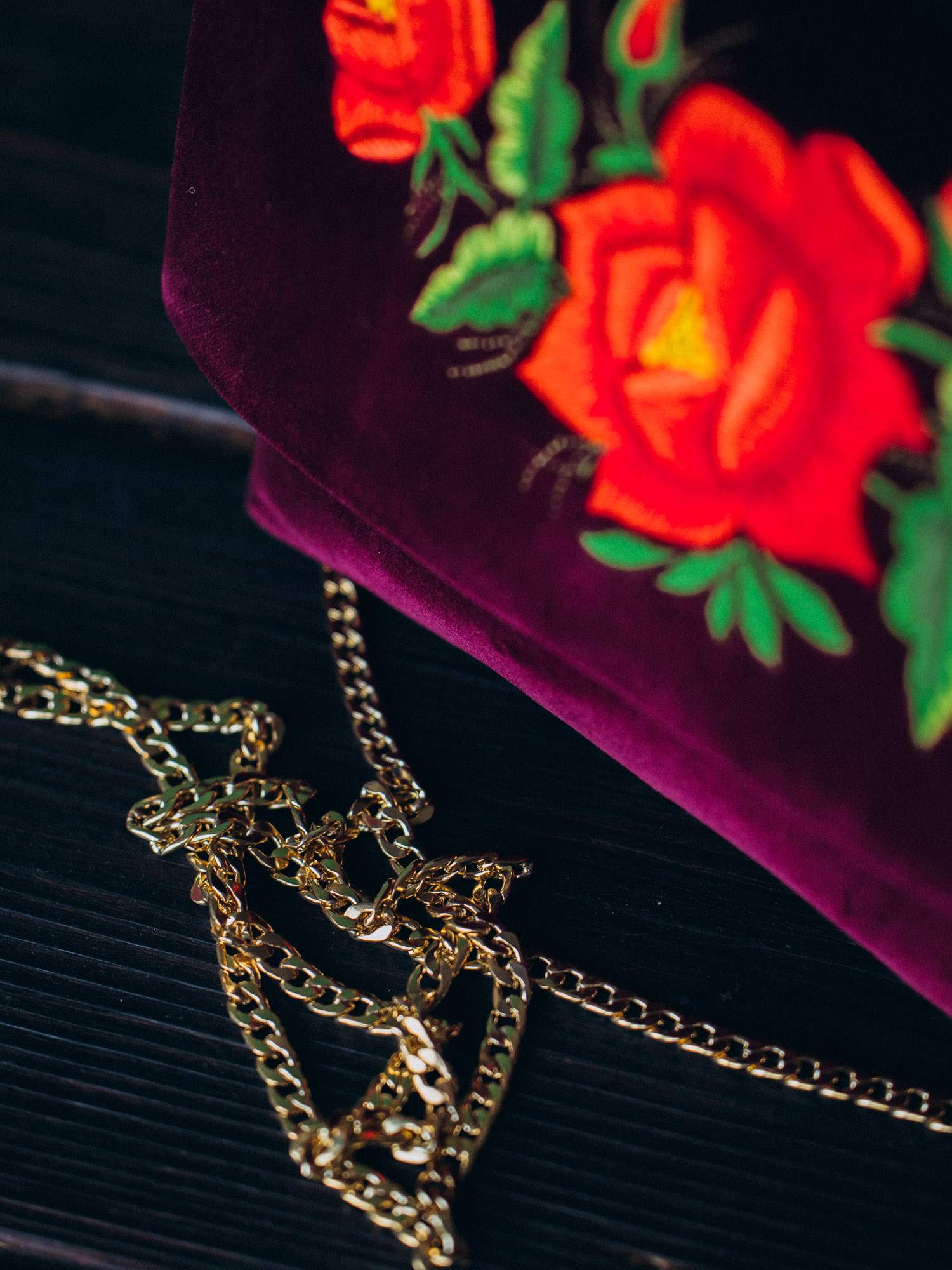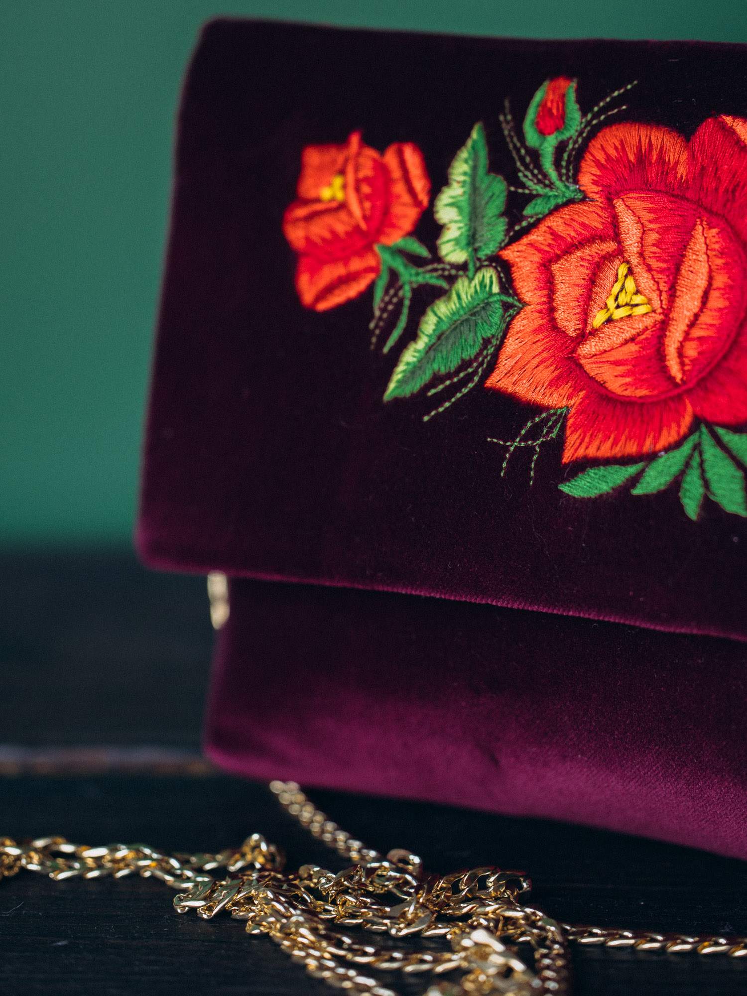 Aksamitna kopertówka w bordowym kolorze z łańcuszkiem, ozdobiona haftem czerwonej róży pączkiem. Łańcuszek występuje w trzech kolorach do wyboru: złotym, czarnym lub srebrnym. Kopertówka posiada zapięcie na zatrzask. Wyszywane detale zostały wykonane przez hafciarkę z okolic Łowicza.