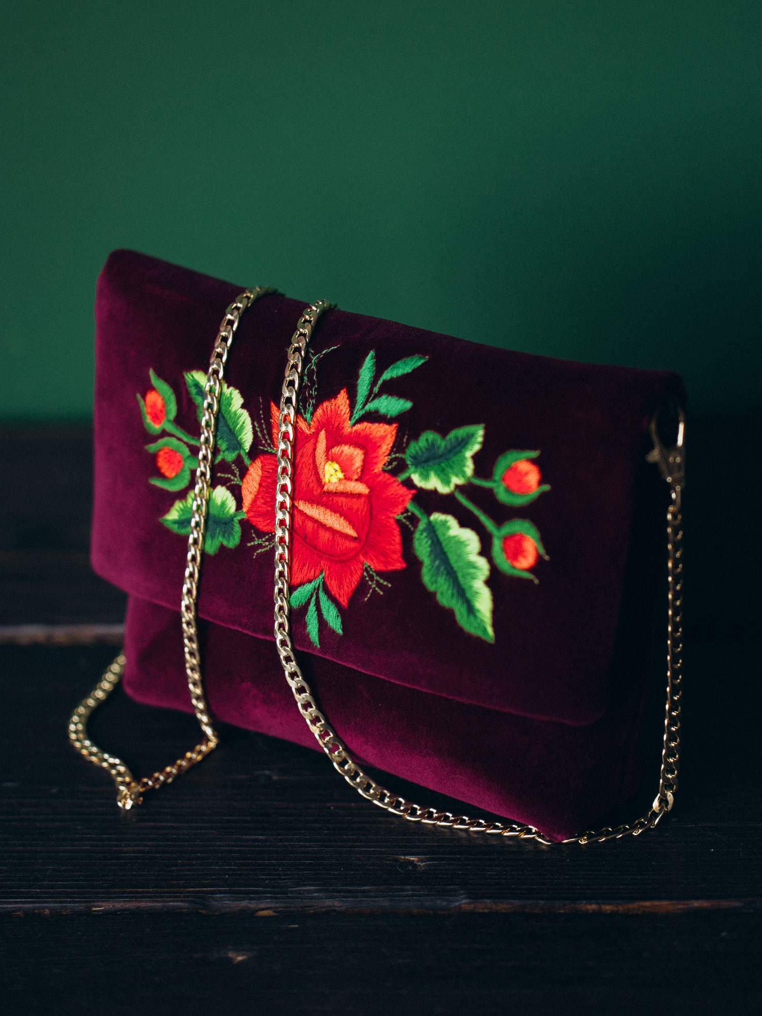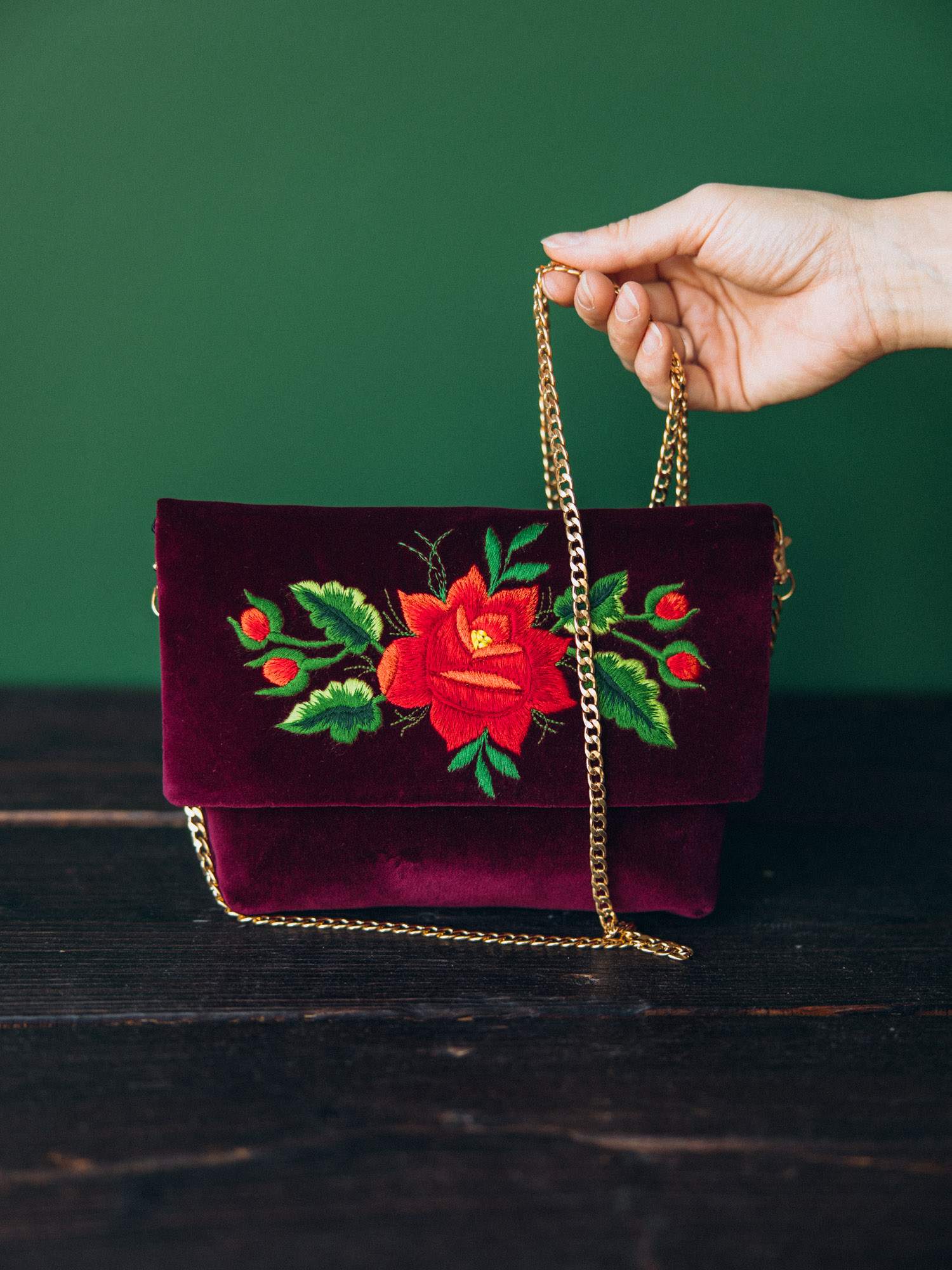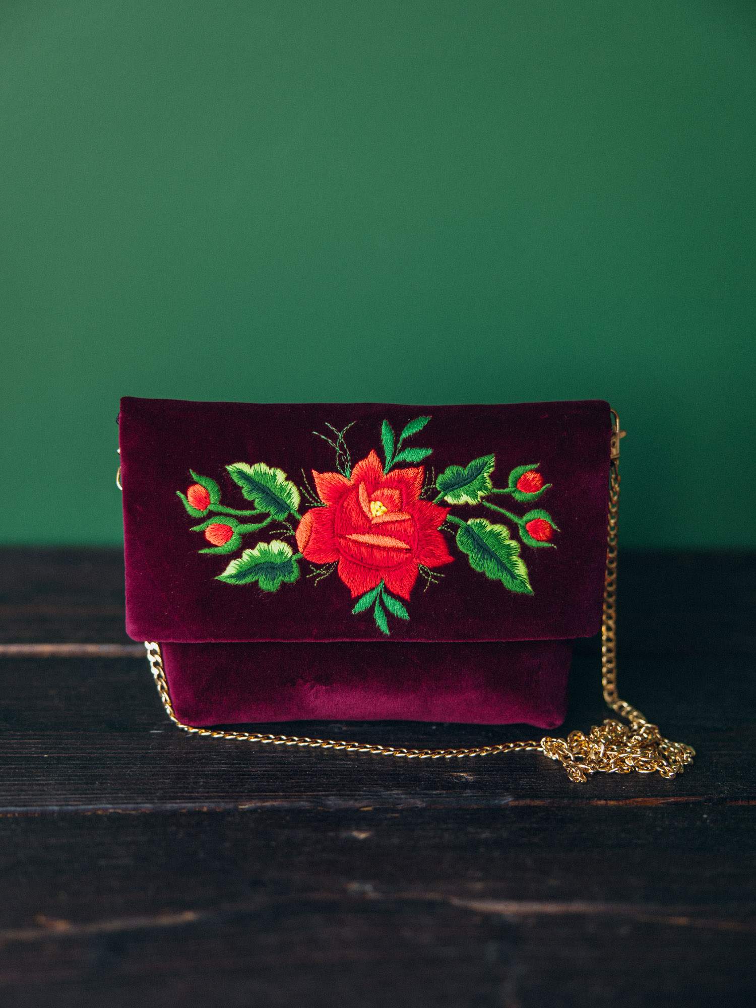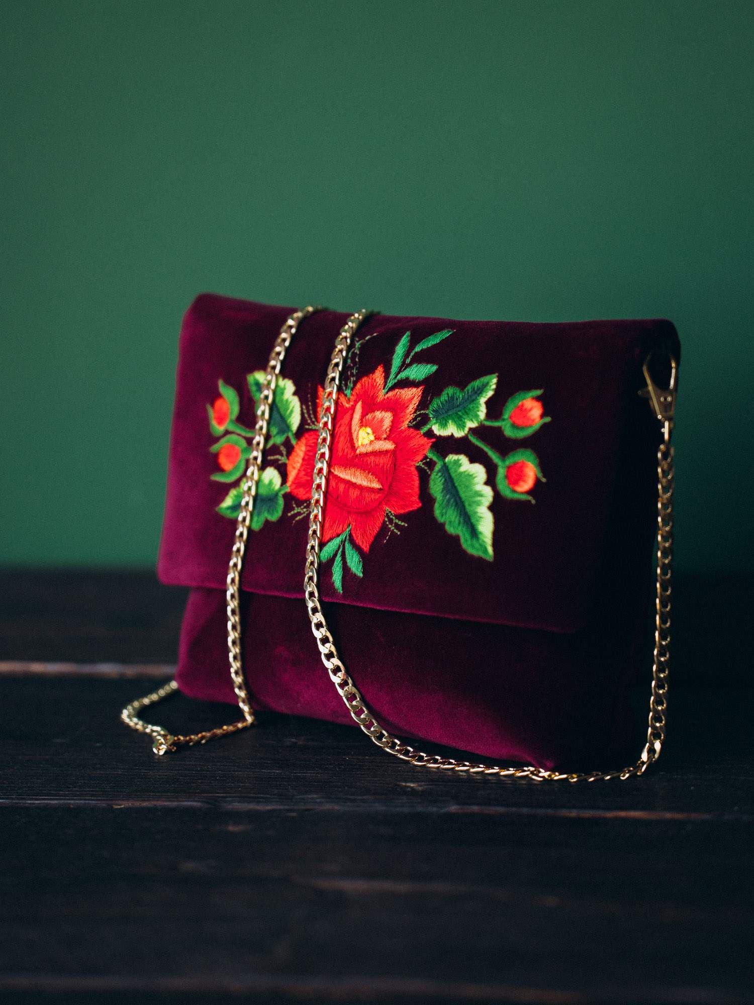 Aksamitna kopertówka w bordowym kolorze, ozdobiona haftem czerwonej róży z woreczka.