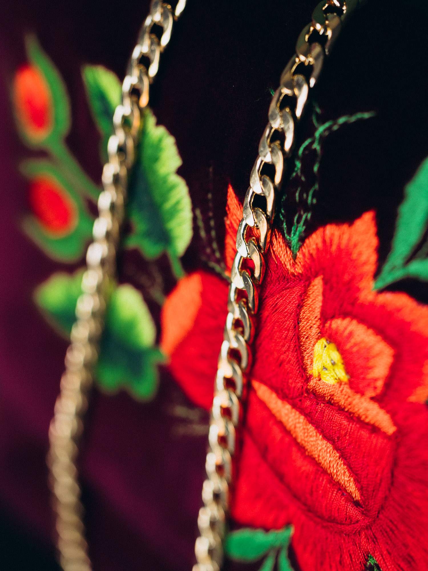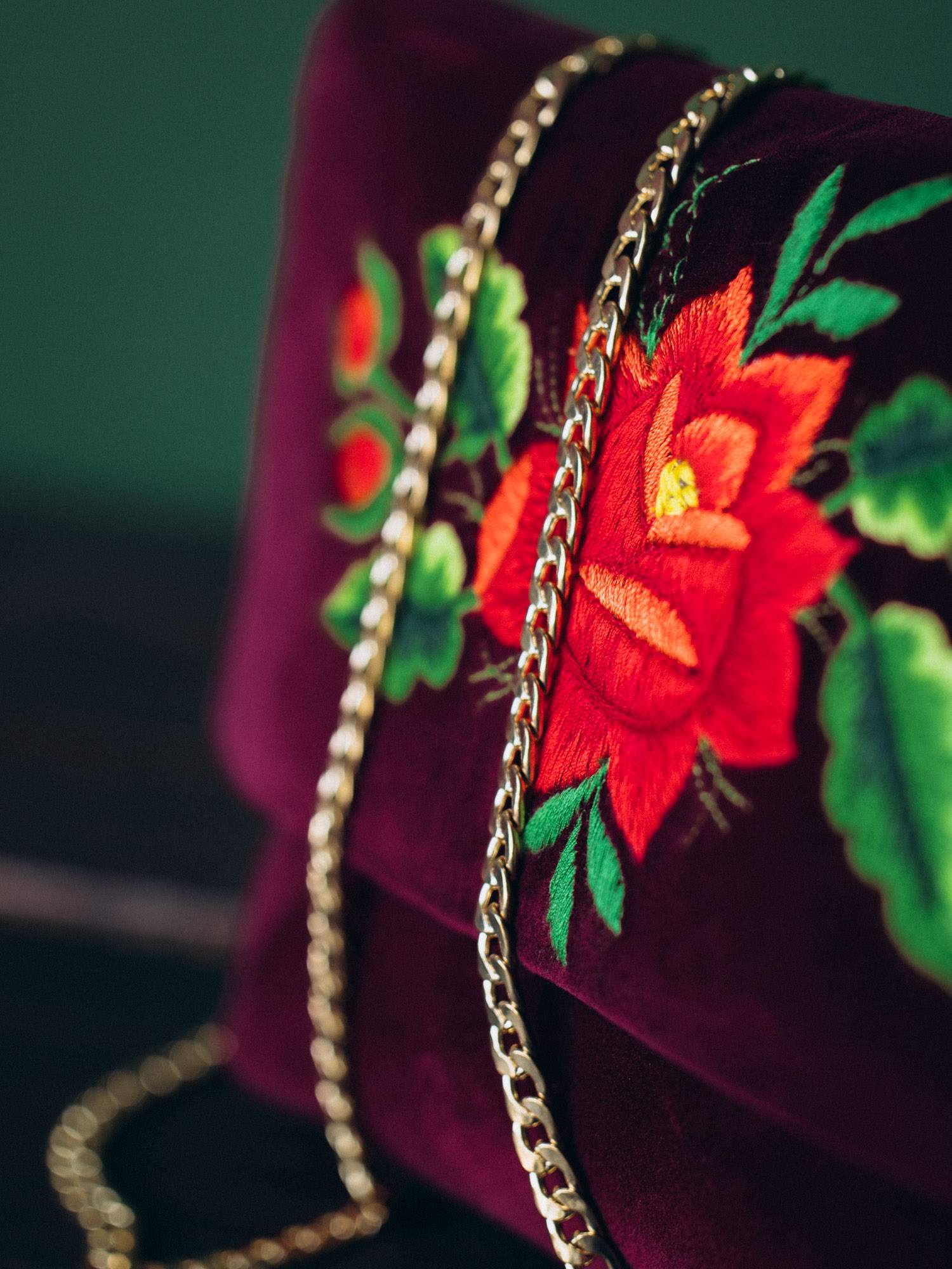 Elegancka kopertówka wykonana z aksamitu w bordowym kolorze. Na torebce znajduję się piękny, haftowany motyw kwiatowy, otoczony kilkoma mniejszymi pąkami i liśćmi. Łańcuszek występuje w trzech kolorach do wyboru: złotym, czarnym lub srebrnym. Kopertówka posiada zapięcie na zatrzask. Wyszywane detale zostały wykonane przez hafciarkę z okolic Łowicza.