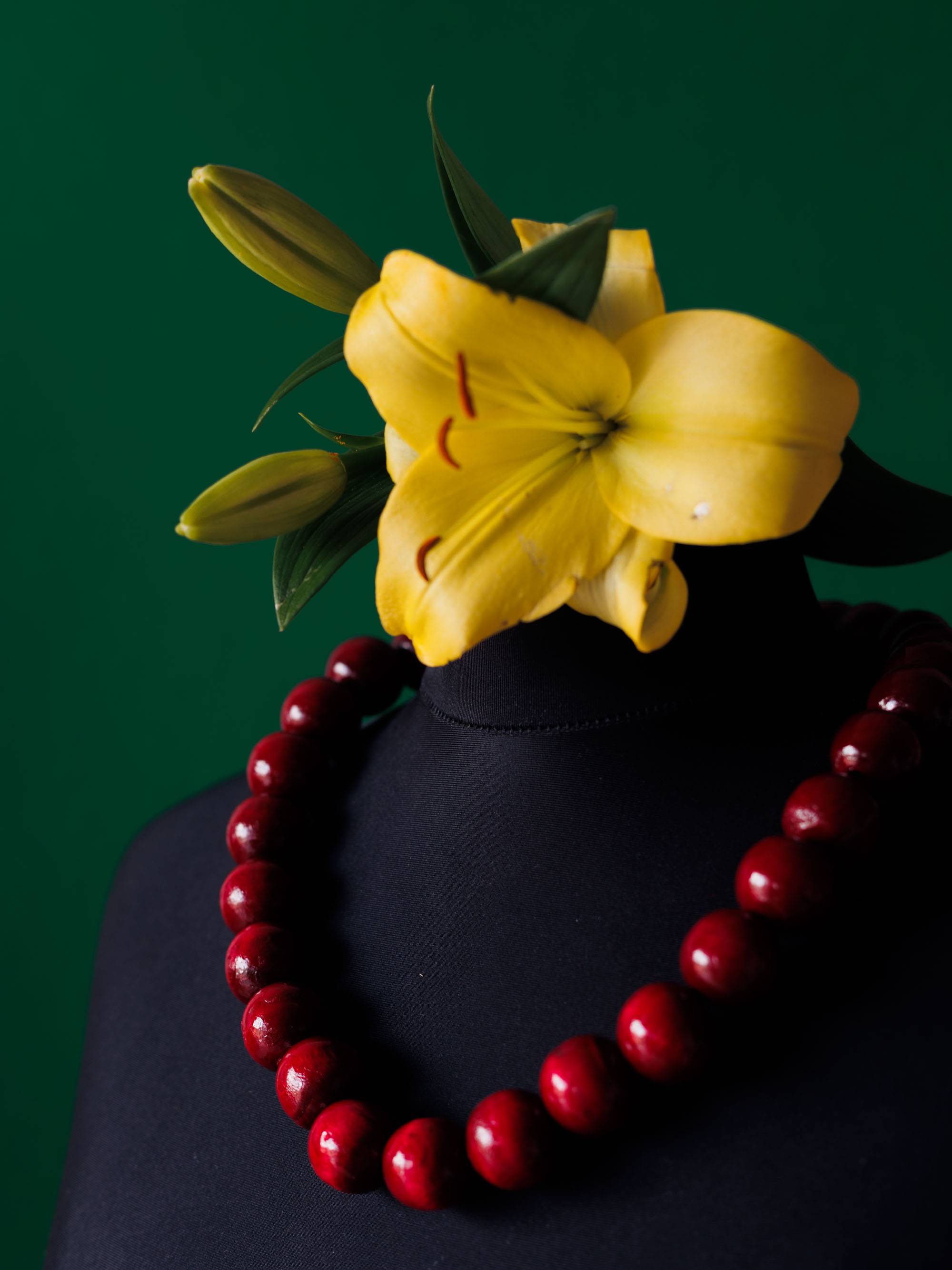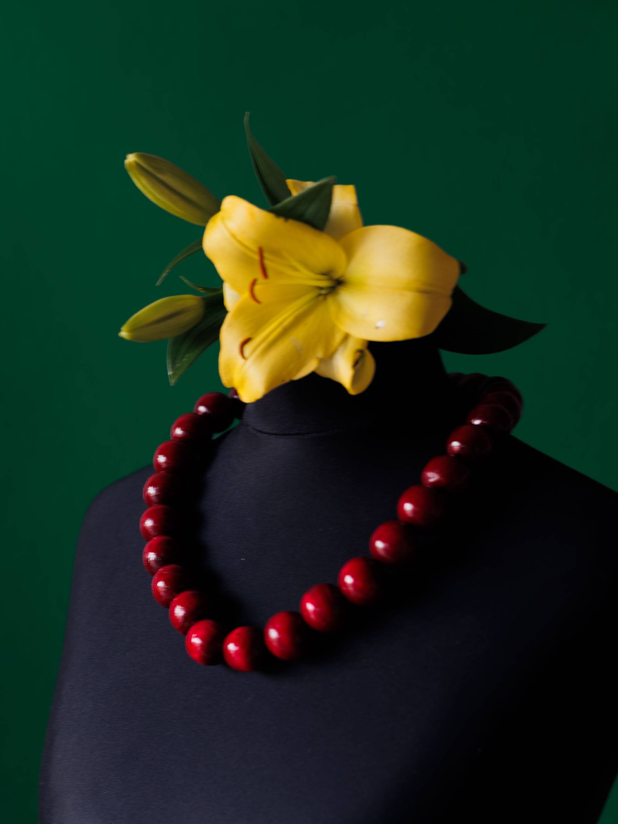 Równe, drewniane korale w postaci naszyjnika w wiśniowym kolorze.