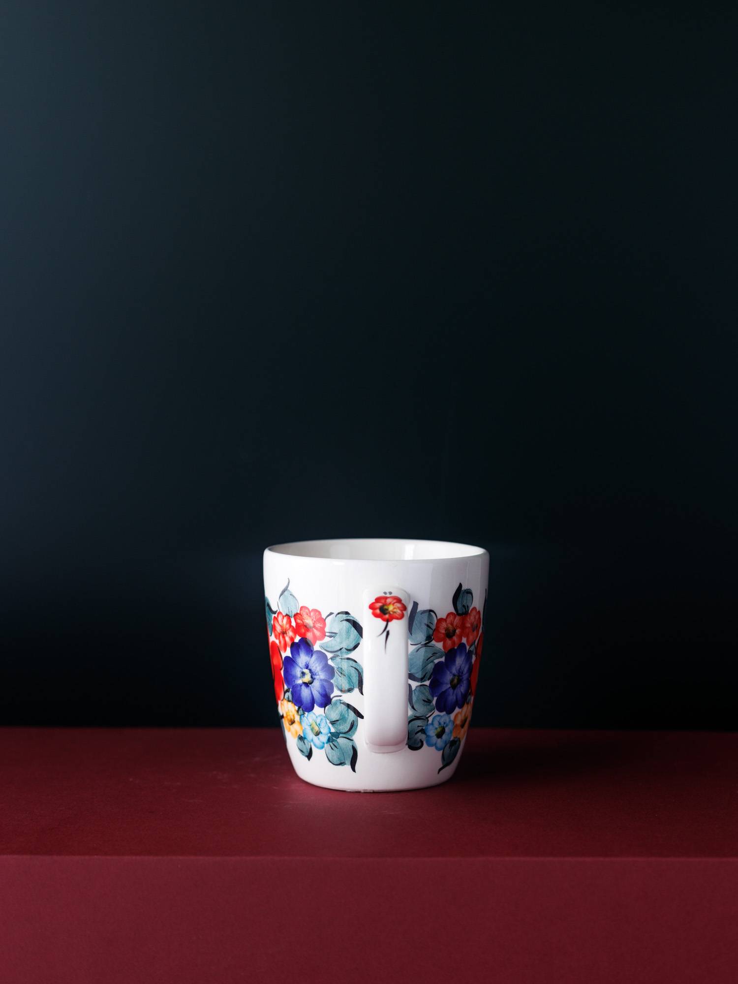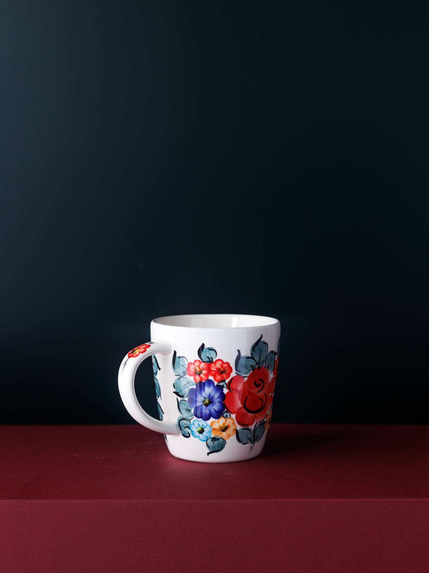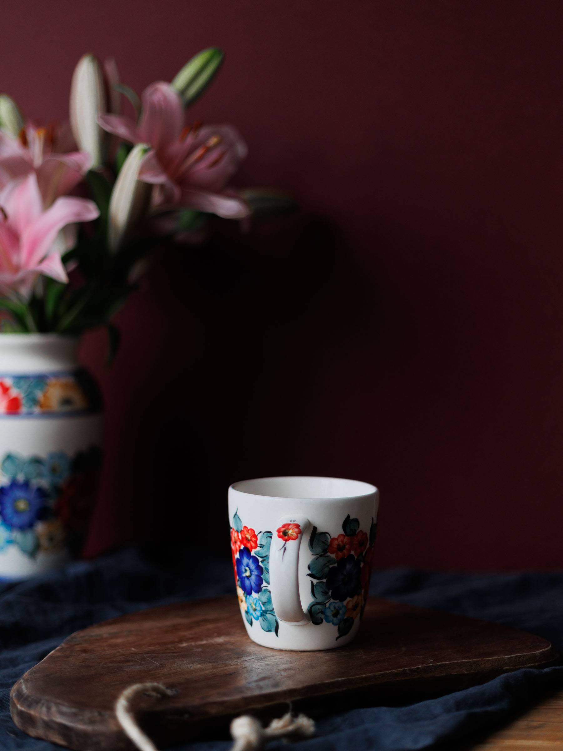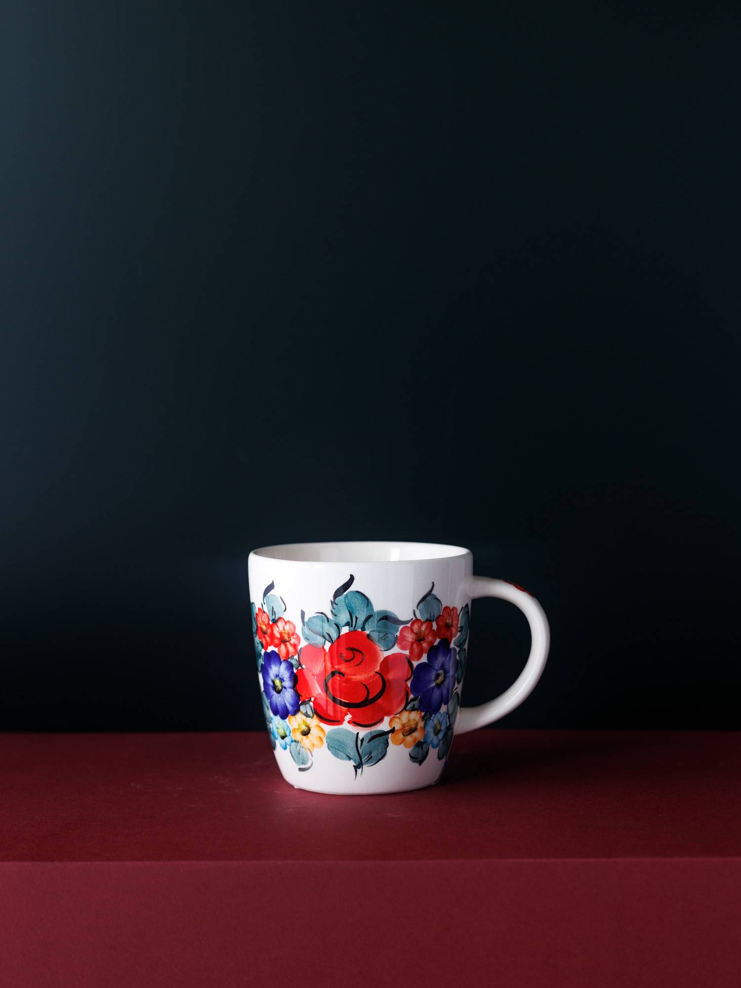 Solidnie wykonany kubek ozdobiony kolorowym wzorem. Wygodny uchwyt i odporność na wysokie temperatury sprawiają, że jest praktyczny w użytkowaniu. Doskonały na prezent, jego elegancka dekoracja wyróżnia się, a tradycyjny motyw fajansu włocławskiego dodaje mu ludowego charakteru.