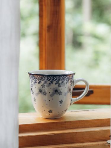 Kubek imitujący dużą filiżankę. Jasna ceramika została ozdobiona ręcznie, kobaltowo-zielonym wzorem jagódek. Naczynie posiada subtelnie wywinięty brzeg oraz wygodny uchwyt. Kubek został wykonany w „Ceramice Artystycznej” w Bolesławcu.