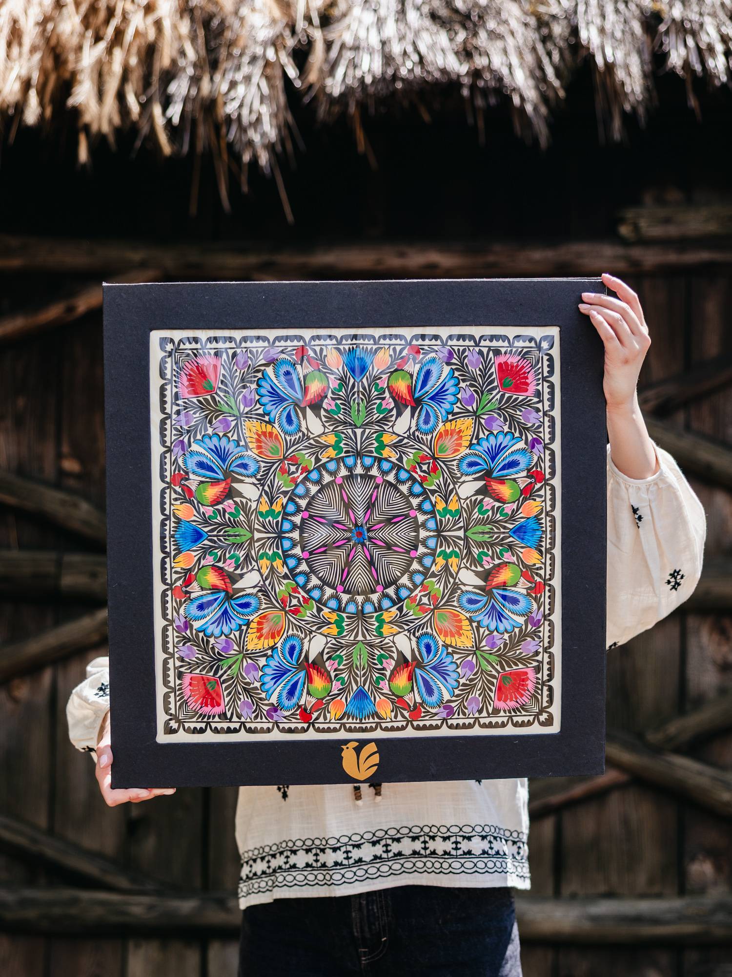 Kwadratowa wycinanka duża w ramie - koguty z niebieskimi ogonami