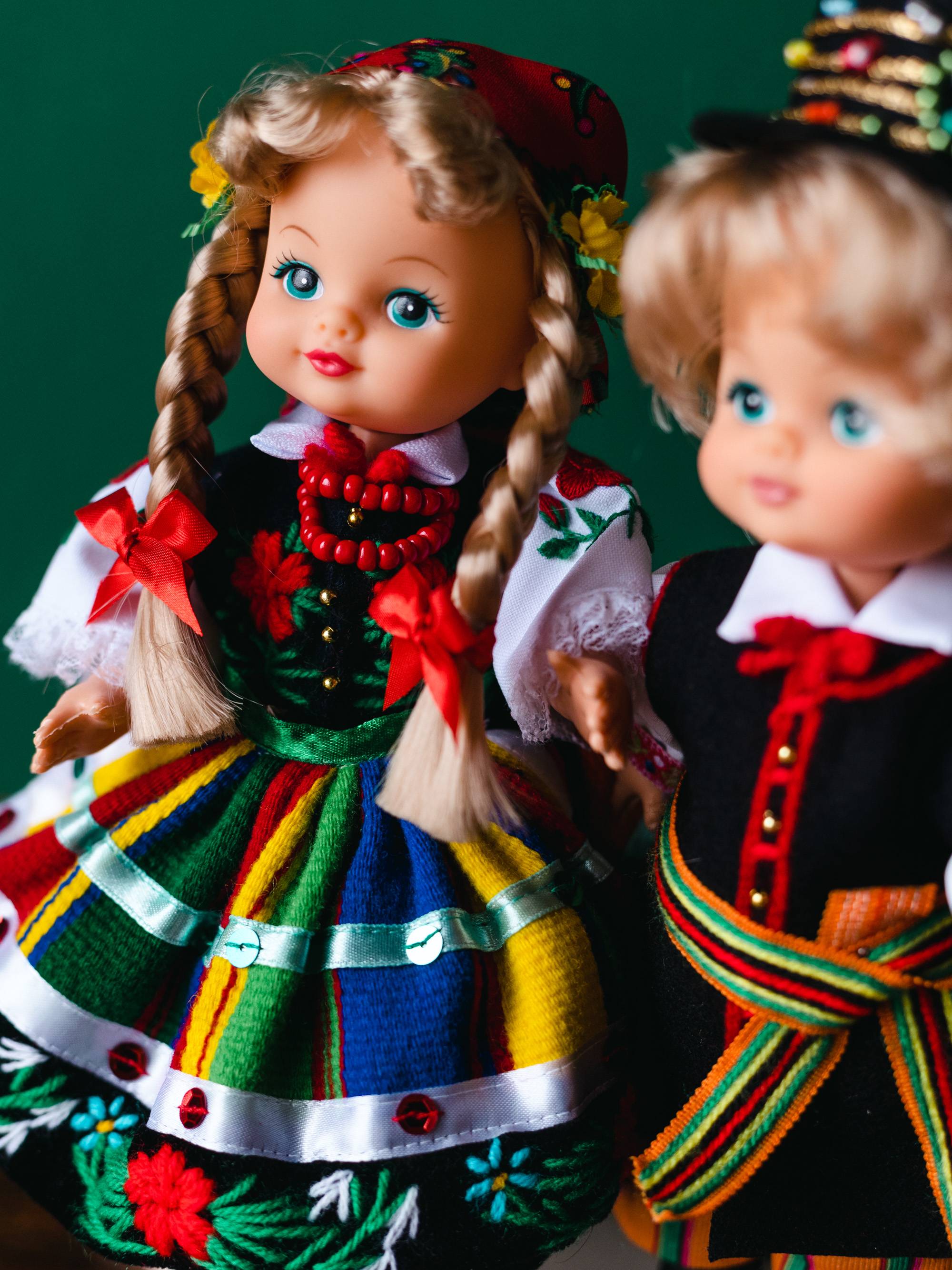 Para łowickich lalek ludowych, w tradycyjnych strojach zdobionych barwnymi haftami.