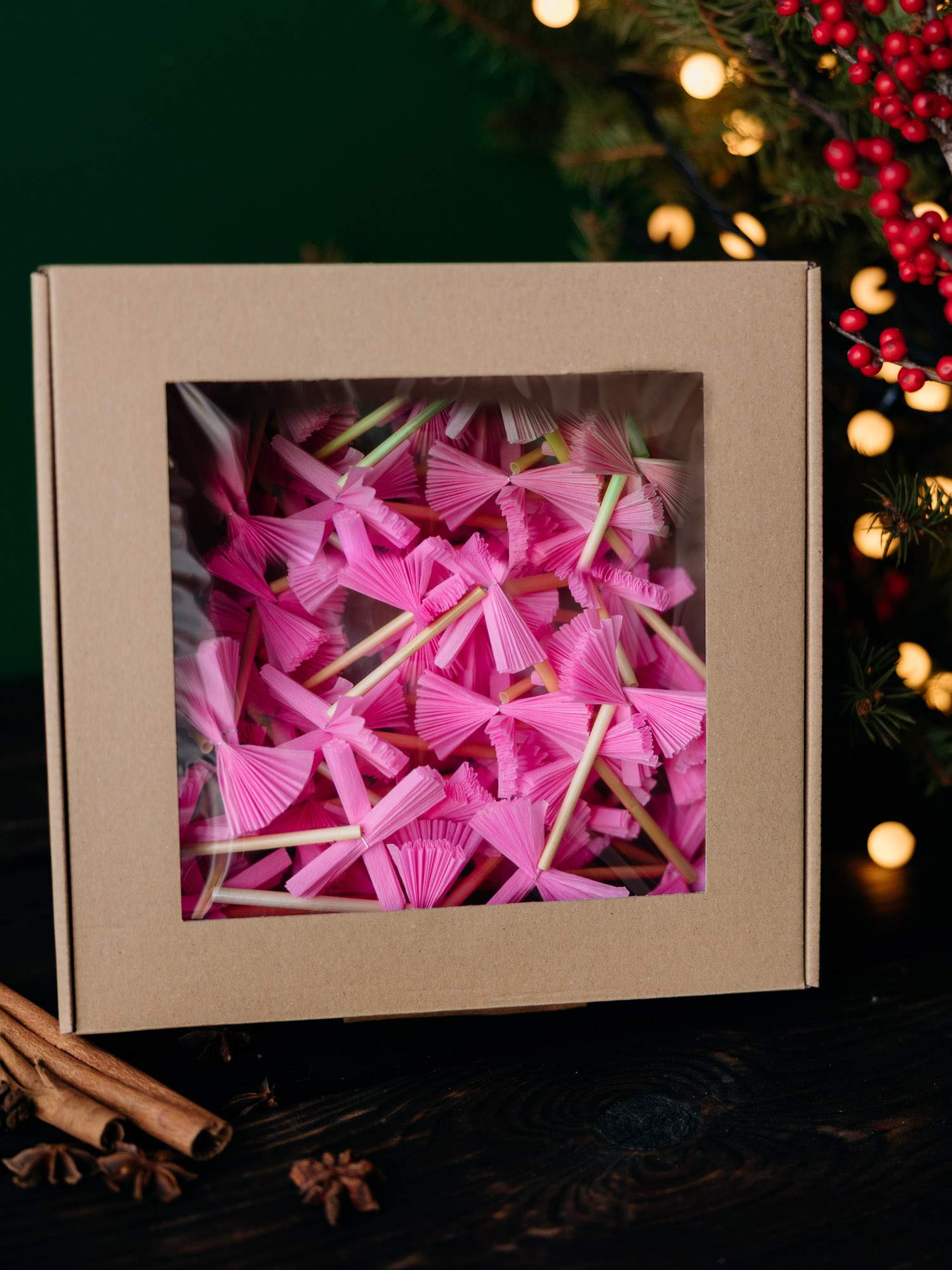 Różowy łańcuch choinkowy wykonany ze słomy i barwionej bibuły. Można go stosować jako ozdobę choinki, kompozycji świątecznych oraz wystroju wnętrz. Wykonany przez Twórczynię Ludową z regionu kujawskiego.