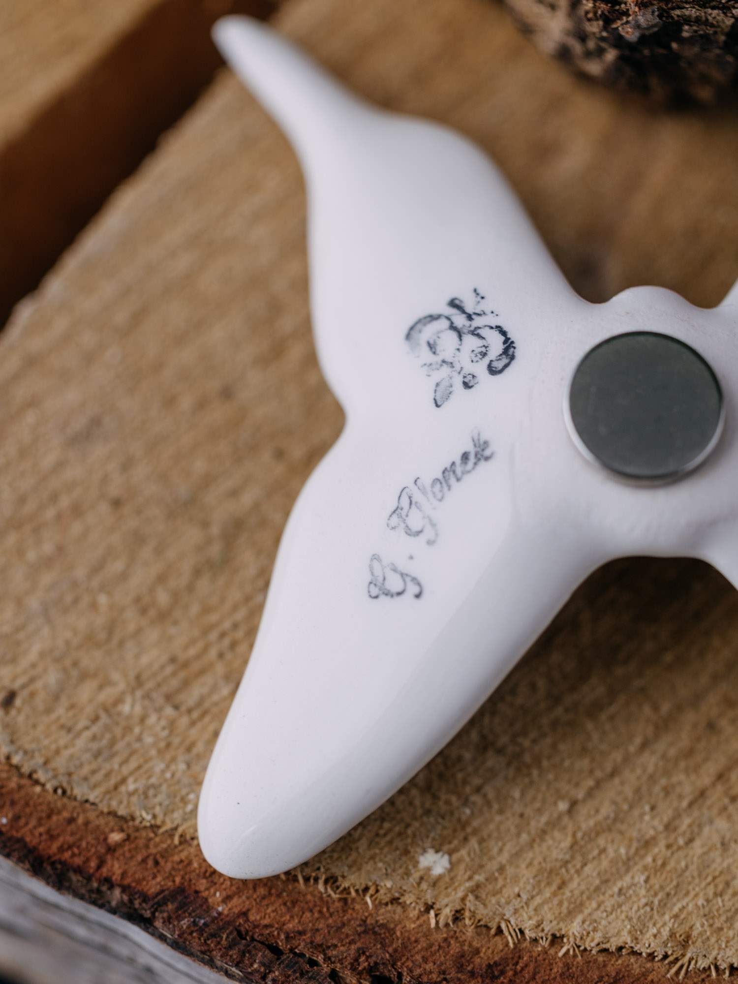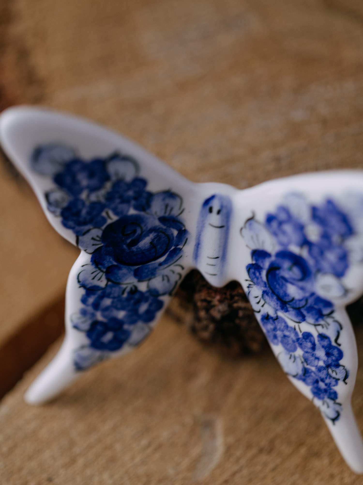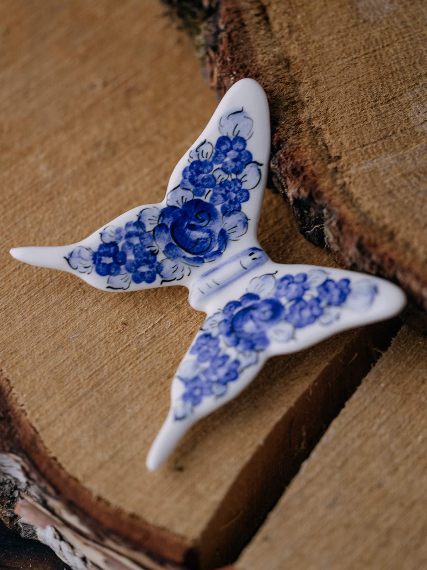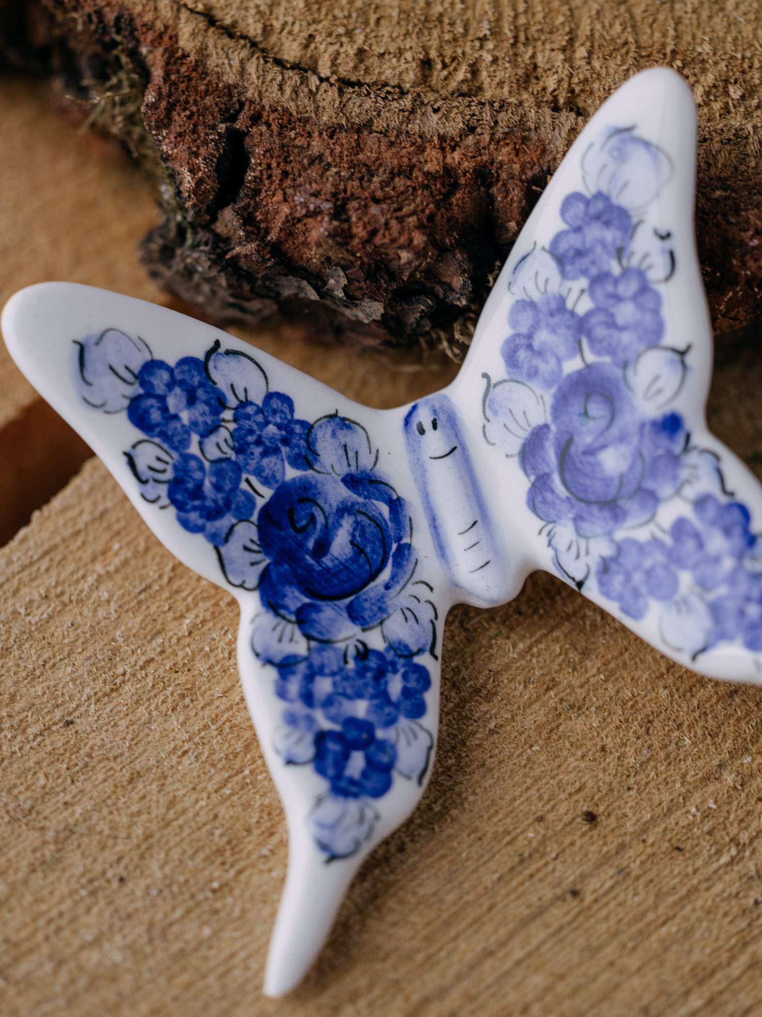 Ceramiczny magnes w kształcie motyla, wykonany z Fajansu Włocławek. Ręcznie ozdobiony kobaltowym wzorem. Delikatny i artystyczny, łączy w sobie tradycyjne rzemiosło z wyjątkowym designem. Idealny jako dekoracyjny akcent na lodówkę lub inną metalową powierzchnię.