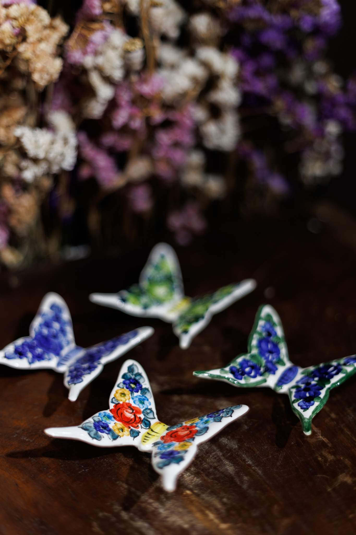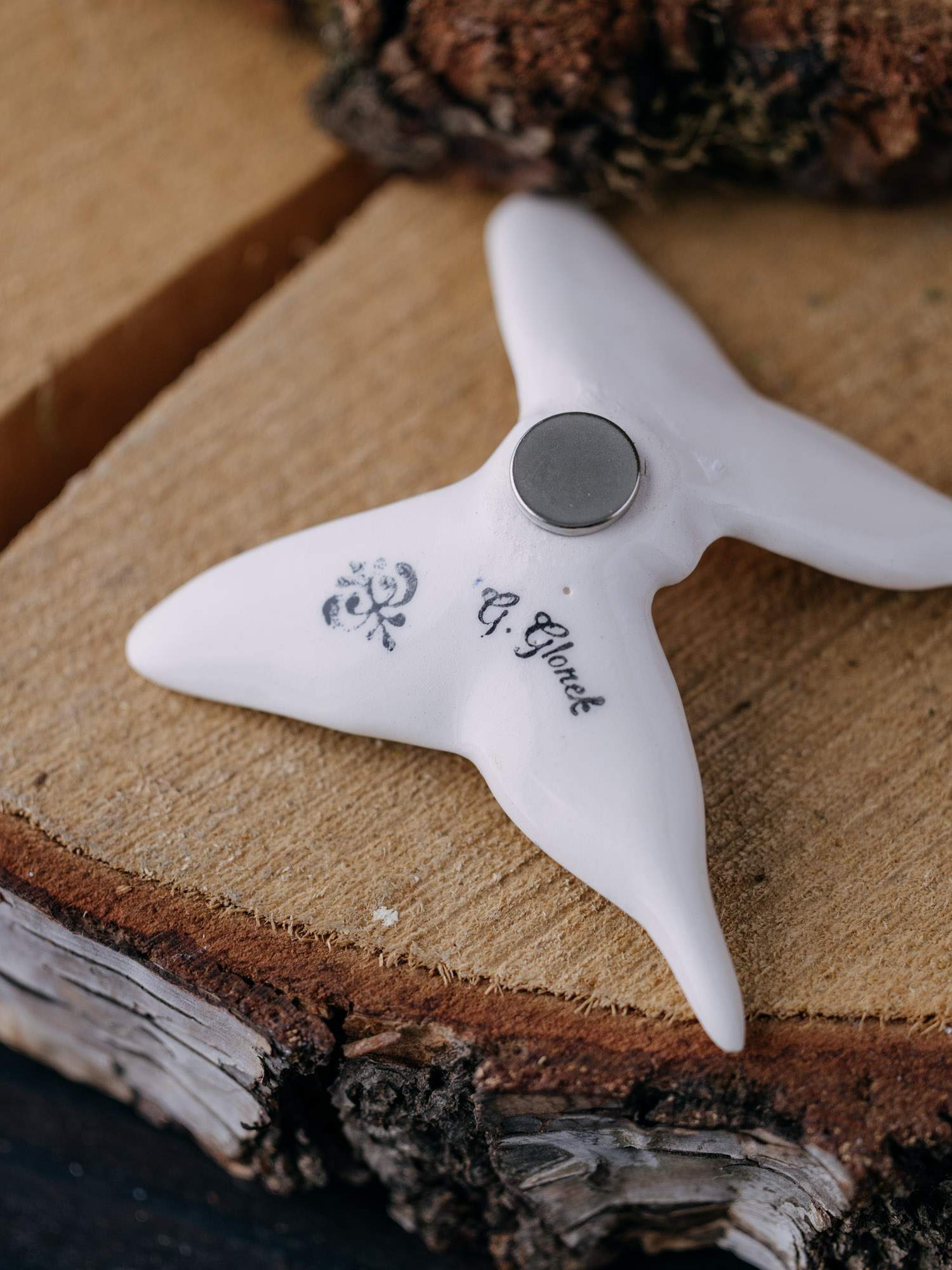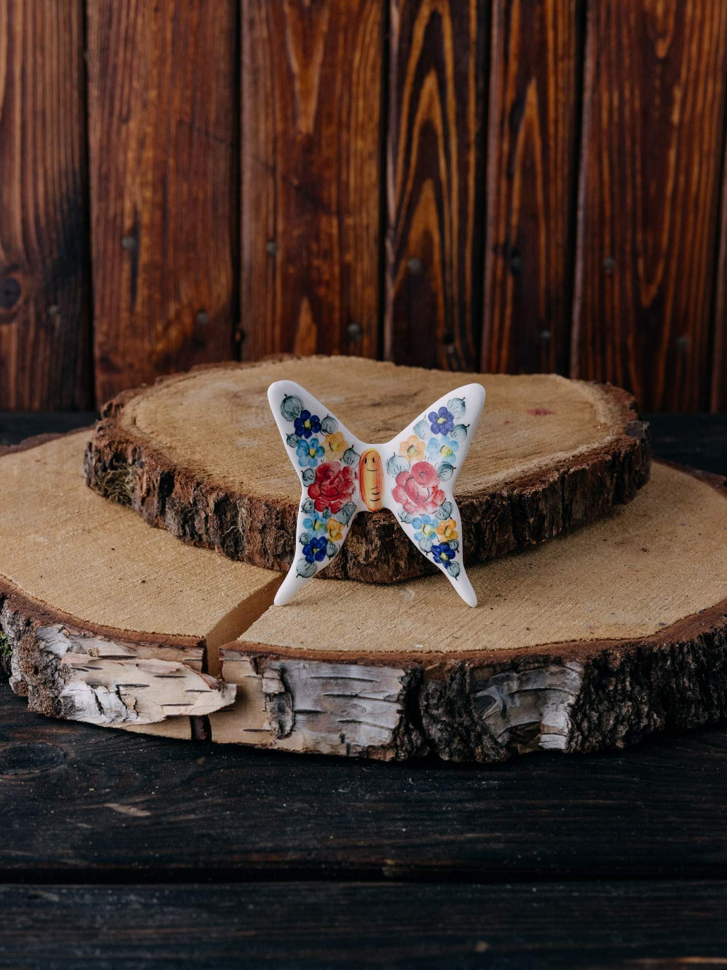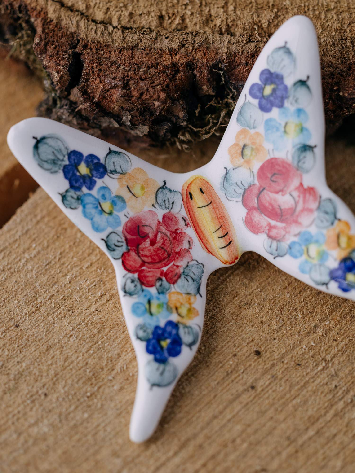 Ceramiczny magnes w kształcie motyla, wykonany z Fajansu Włocławek. Ręcznie ozdobiony kolorowym, kwiatowym wzorem. Łączy w sobie tradycyjne rzemiosło z wyjątkowym designem. Idealny jako dekoracyjny akcent na lodówkę lub inną metalową powierzchnię.