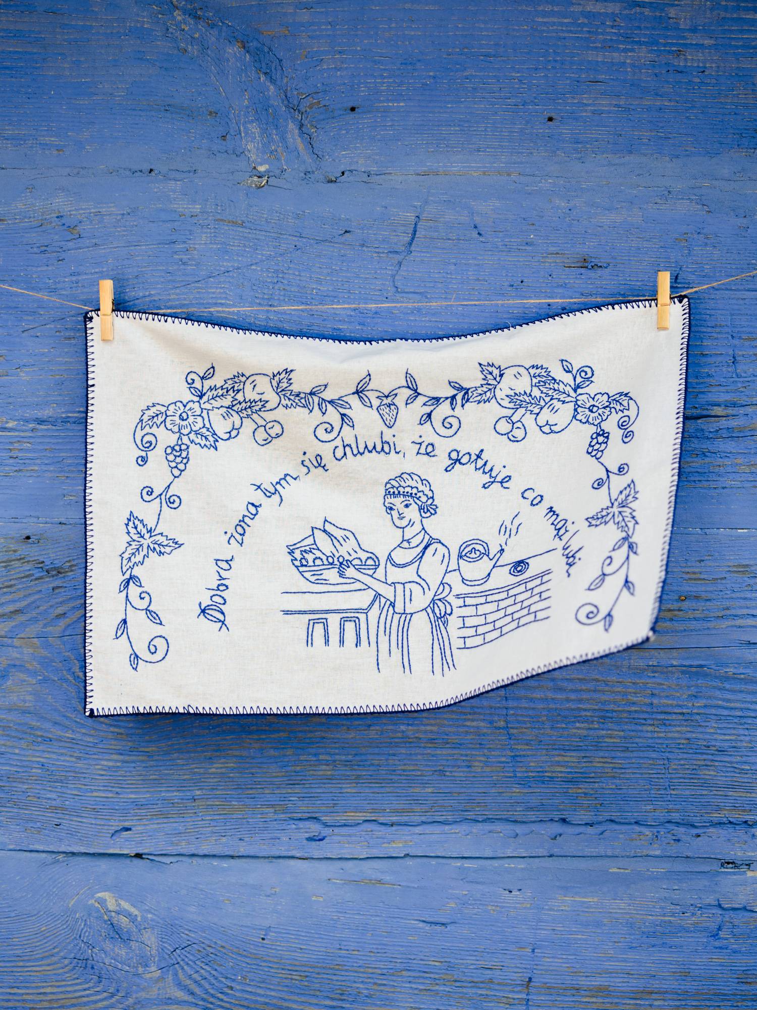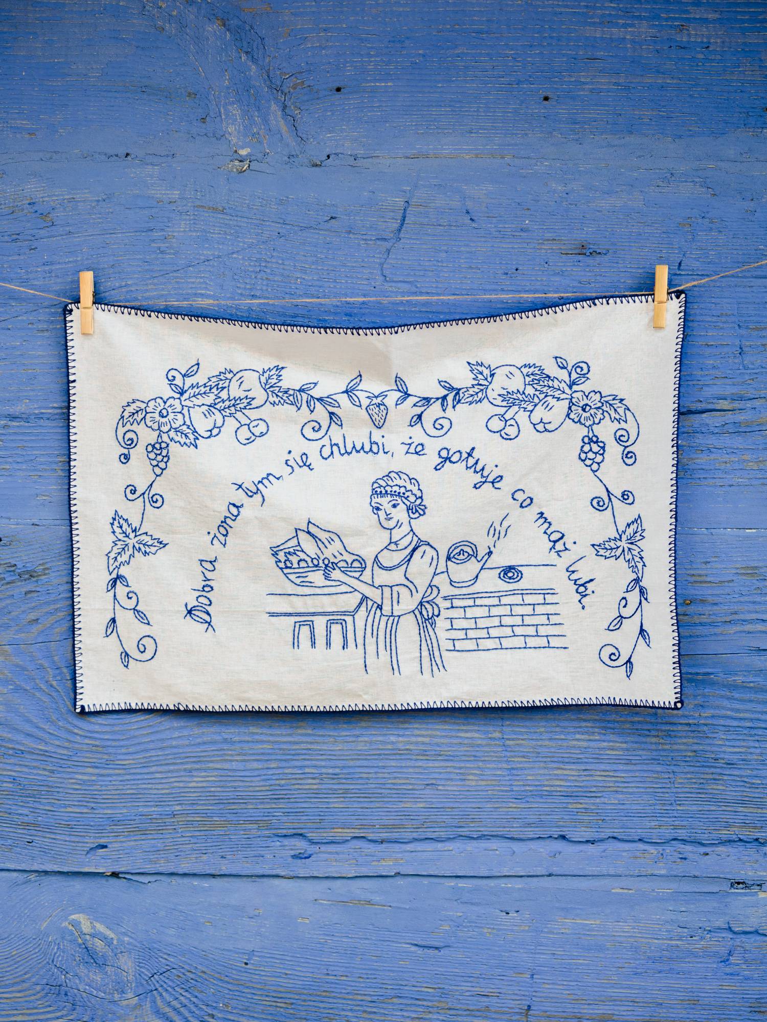 Makatka z wyhaftowanym napisem ,,Dobra żona tym się chlubi, że gotuje co mąż lubi".