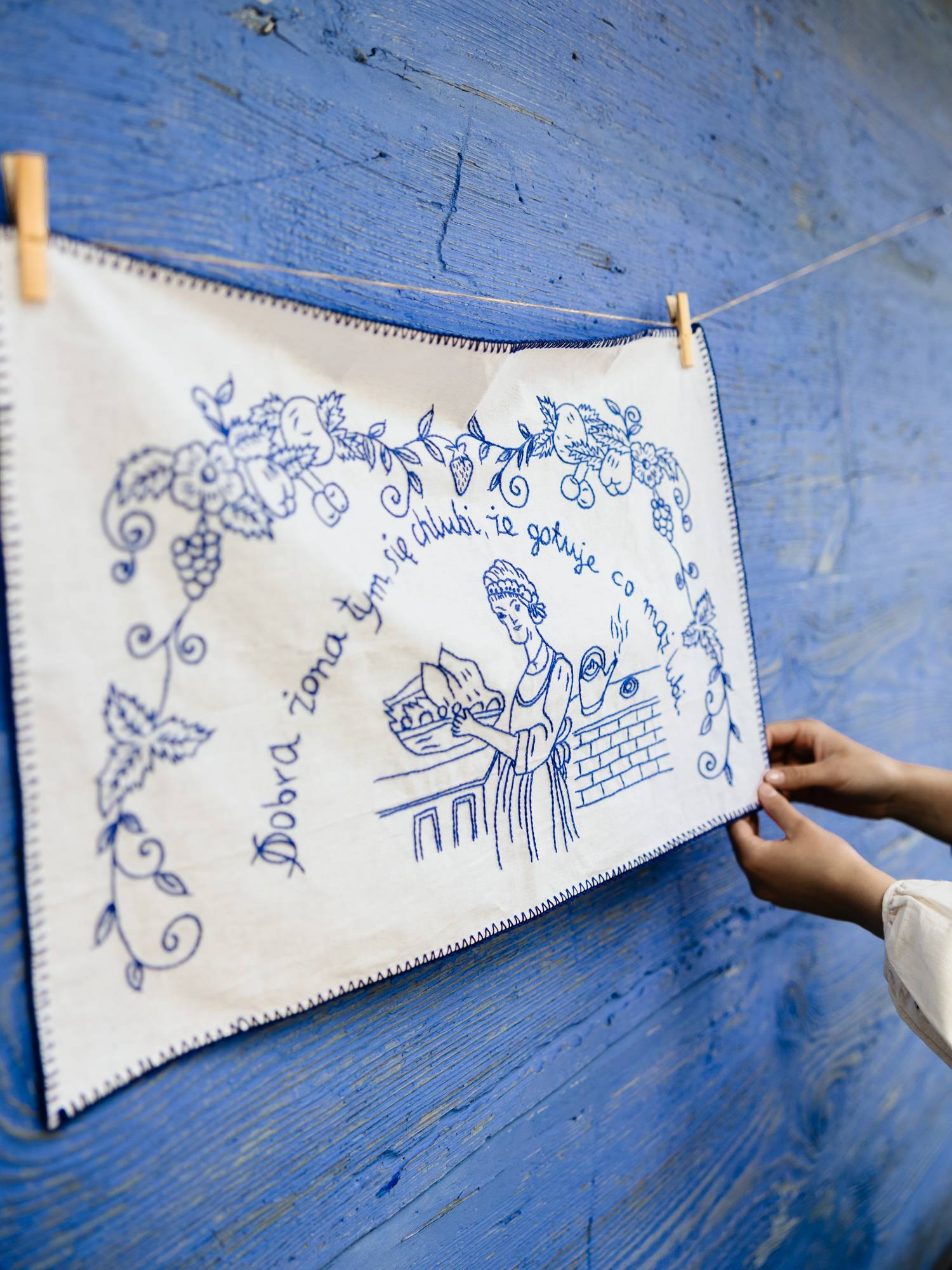 Makatka haftowana niebieskimi nićmi na jasnej tkaninie. Wykonana ręcznie, techniką wyszywania. Makatka przedstawia rysunek gospodyni, która przygotowuje posiłek. W tle znajduje się kuchenka, na której stoi czajnik z gotującą się wodą. Na makatce wyhaftowane są motywy roślinne.