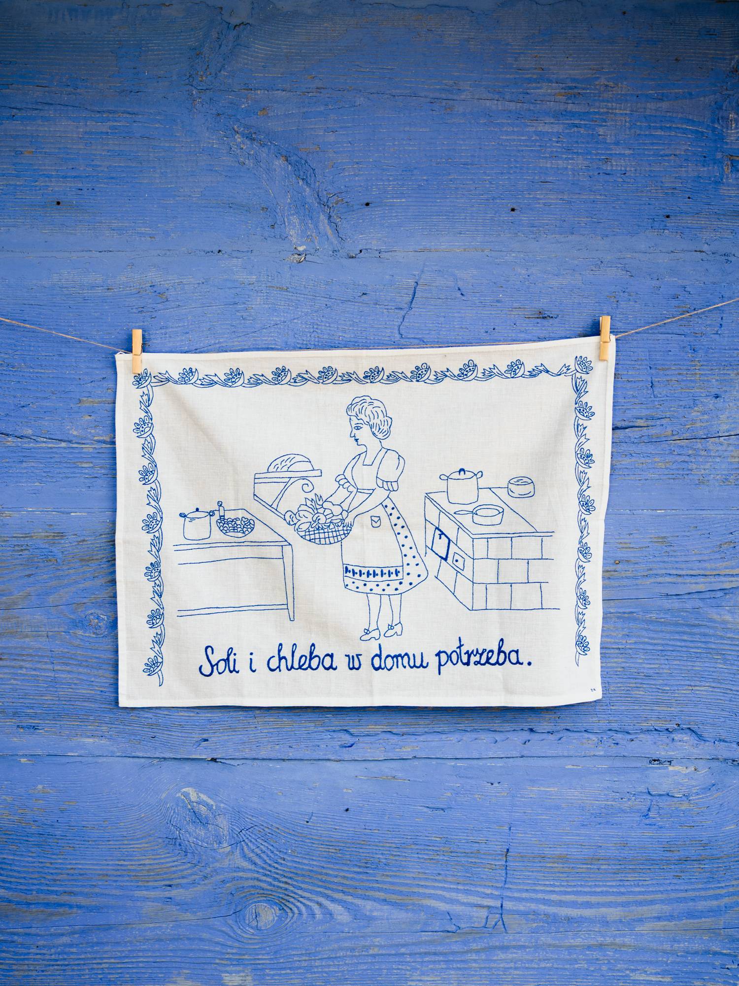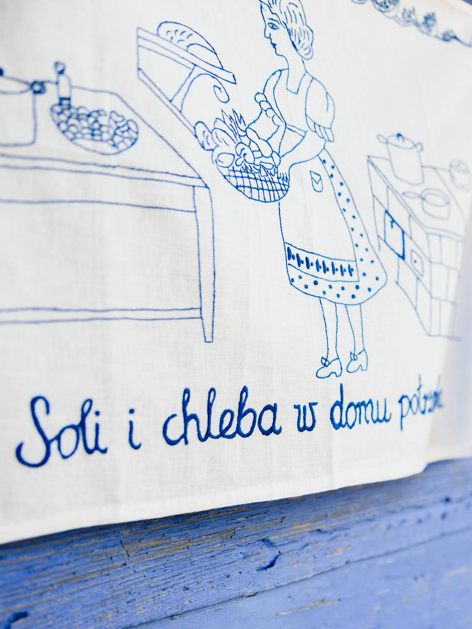 Makatka haftowana niebieskimi nićmi na jasnej tkaninie. Wykonana ręcznie, techniką wyszywania. Przedstawia gospodynię w kuchni trzymającą kosz z warzywami. Napis ,,Soli i chleba w domu potrzeba" został wyhaftowany grubszą nicią.