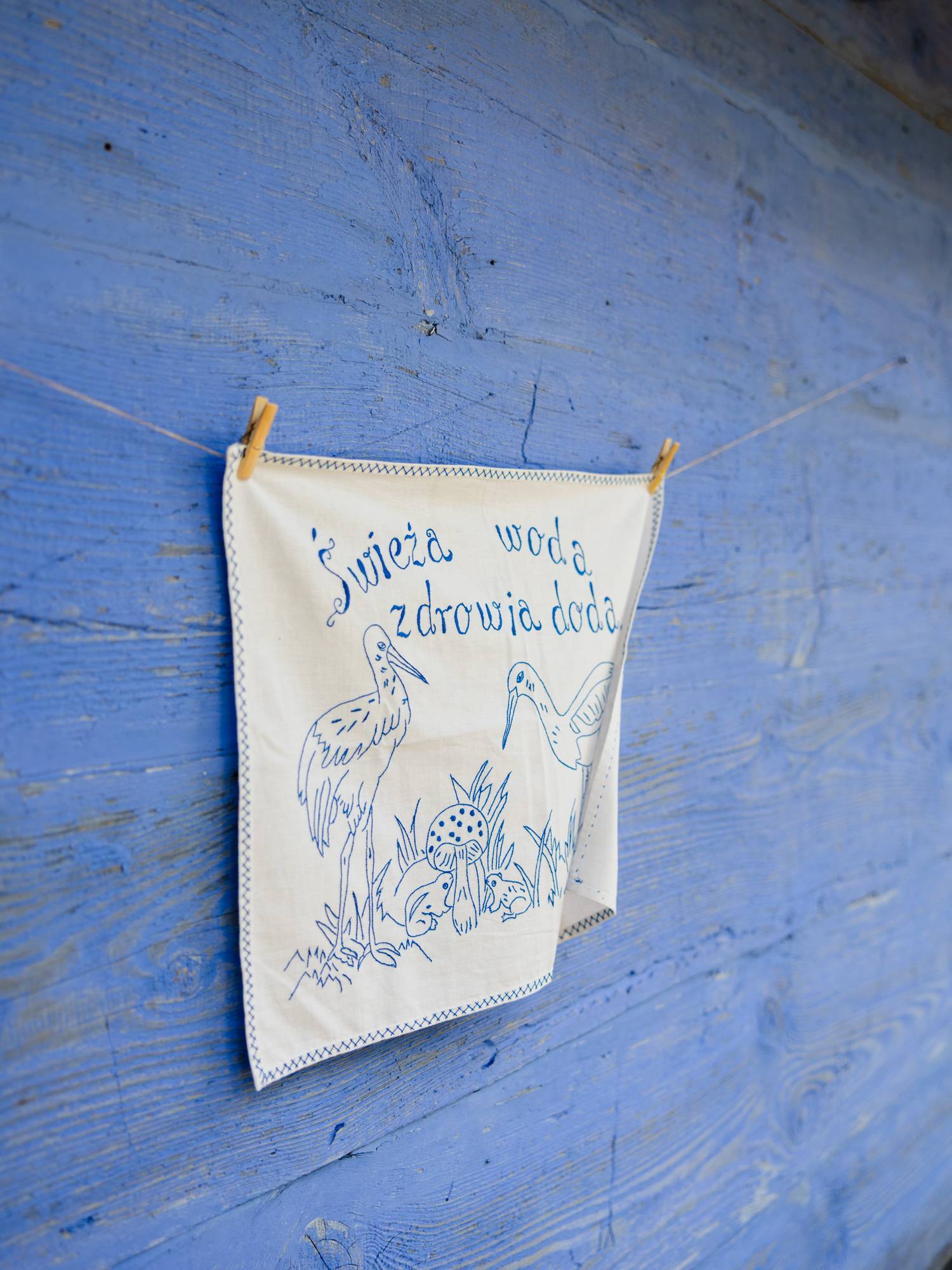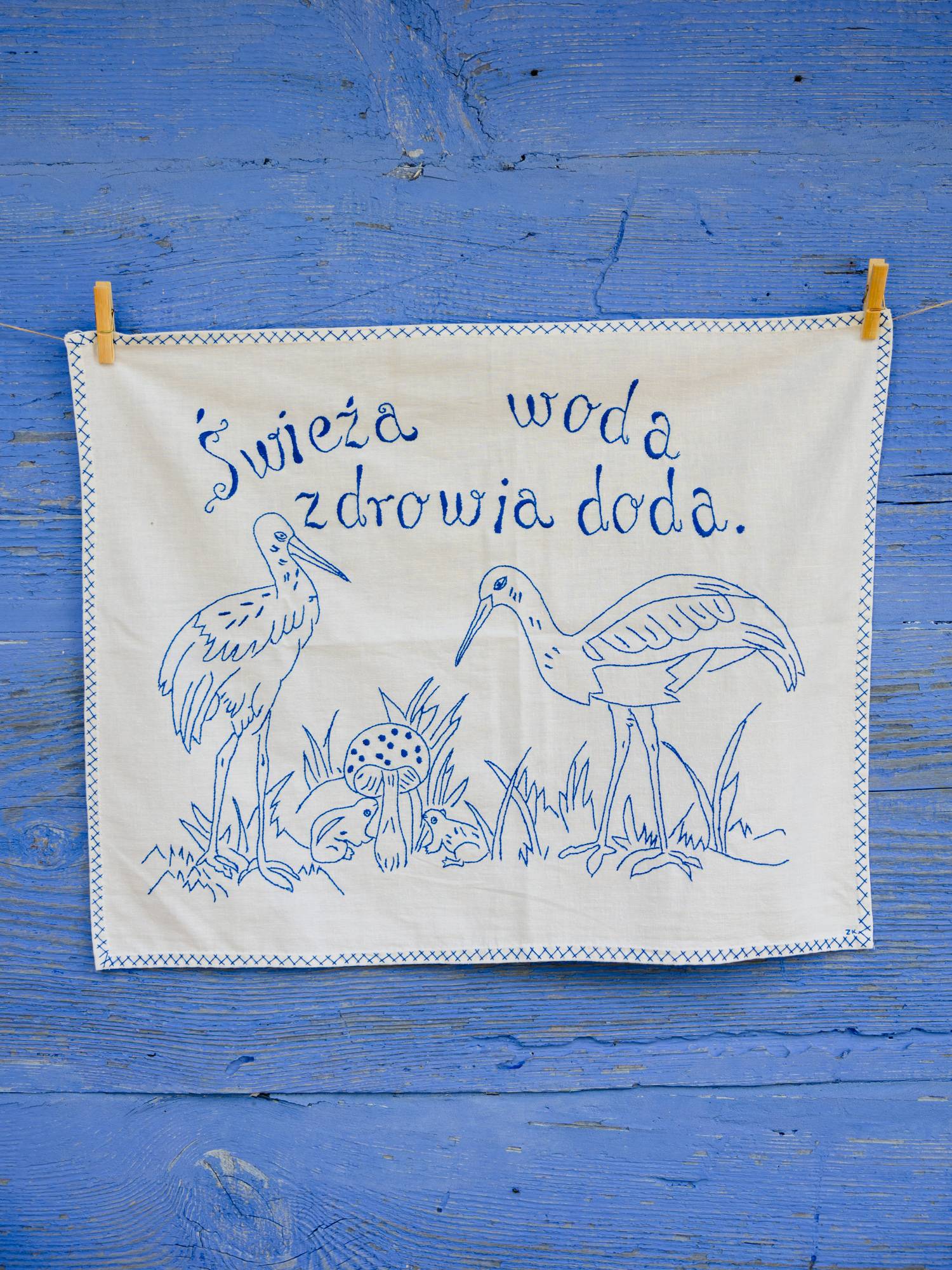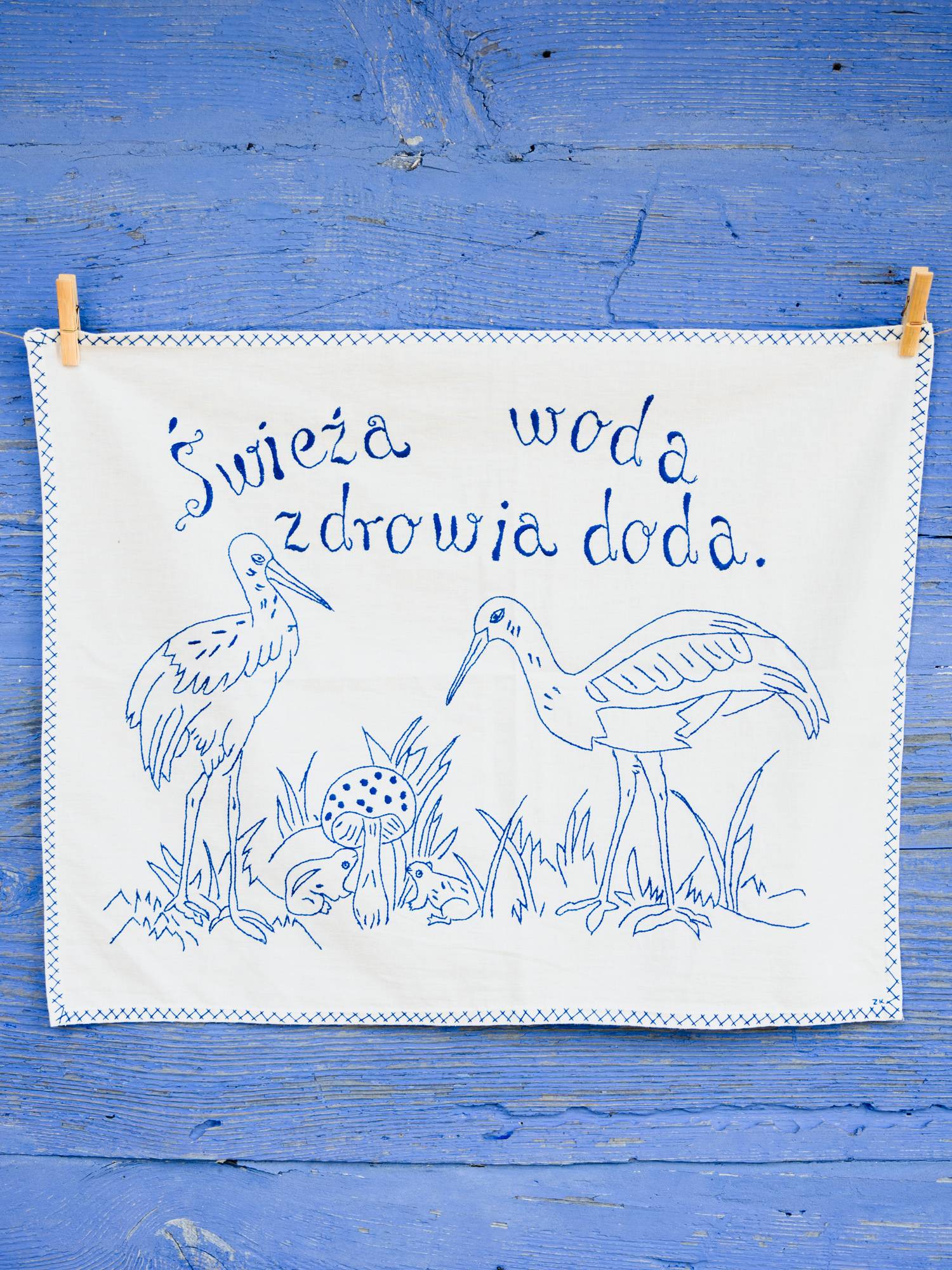 Makatka wyhaftowana niebieskimi nićmi na jasnej tkaninie. Wykonana ręcznie, techniką wyszywania. Makatka przedstawia dwa bociany na łonie natury. Napis ,,Świeża woda zdrowia doda" został wyhaftowany grubszą nicią.