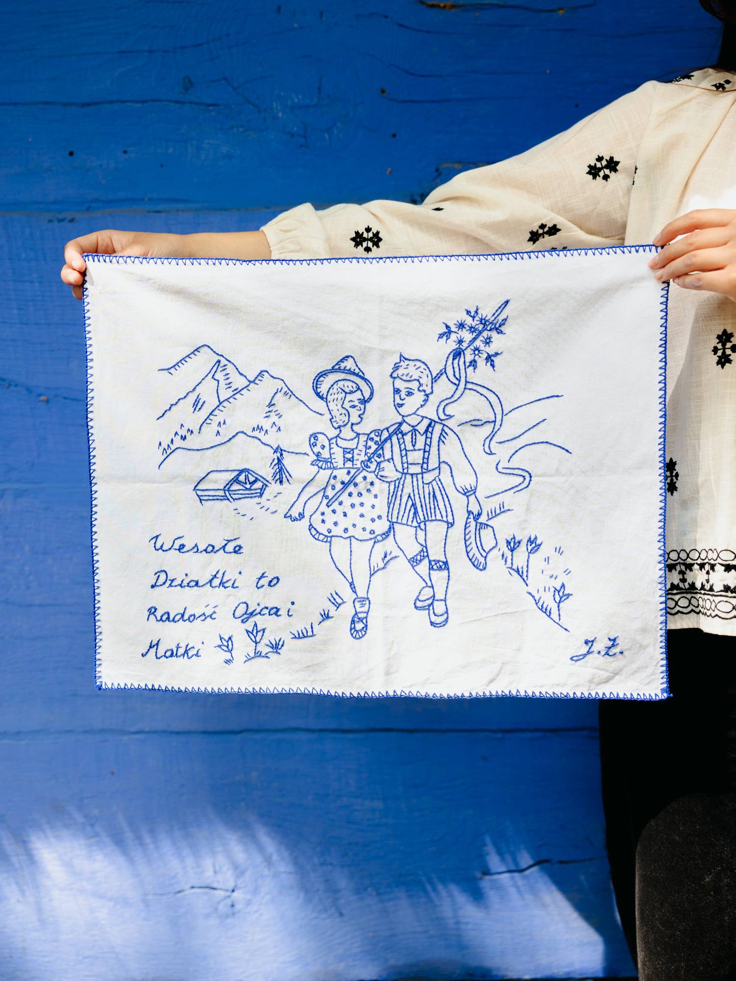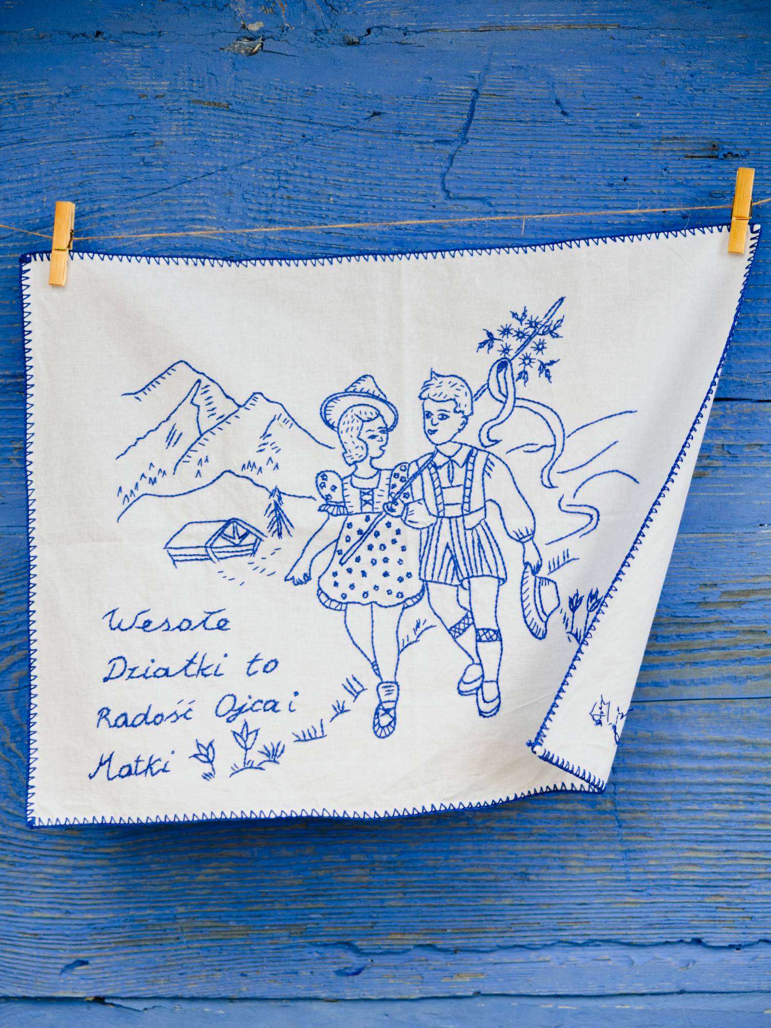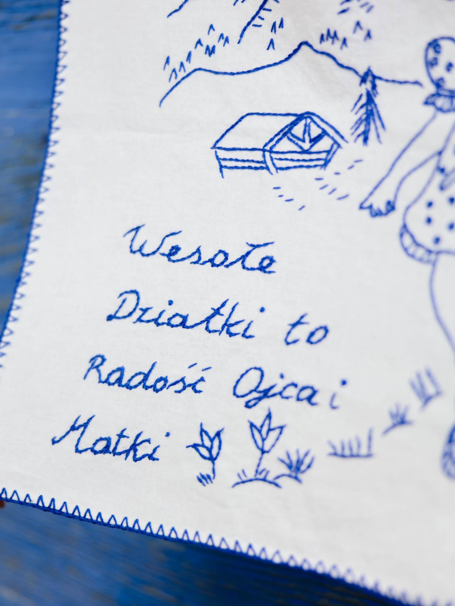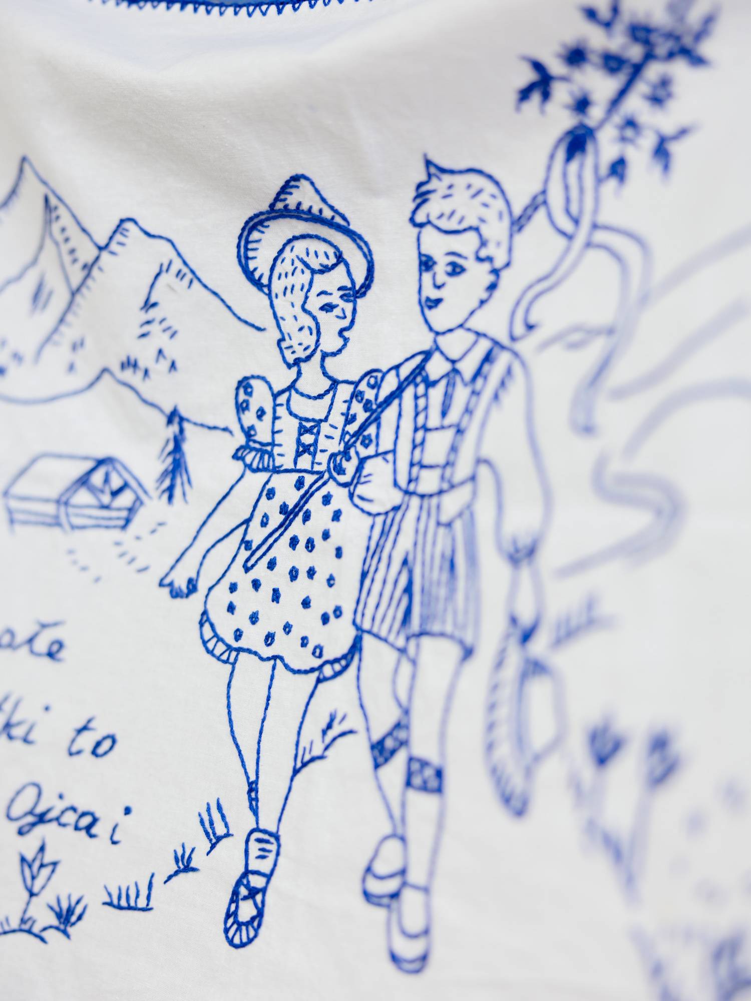 Makatka haftowana niebieskimi nićmi na jasnej tkaninie. Wykonana ręcznie, techniką wyszywania. Makatka przedstawia rysunek chłopca oraz dziewczynki wędrujących na łonie natury. W tle widoczne są góry. Na makatce wyszyte zostały również kwiatki. Na dole po prawej znajdują się inicjały - autorki makatki.