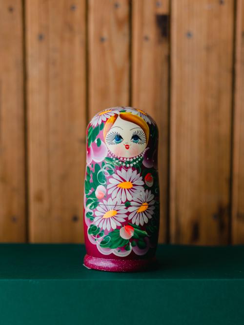 Matrioszka składająca się z 5 elementów, wykonana z najwyższej jakości drewna i starannie ręcznie malowana. Głęboki fiolet stanowi tło dla delikatnych stokrotek i zielonych listków, tworząc subtelną i zachwycającą kompozycję. Ta wyjątkowa ozdoba idealnie nadaje się jako dekoracja, unikatowy element kolekcjonerski lub oryginalny prezent inspirowany tradycyjnym rękodziełem.