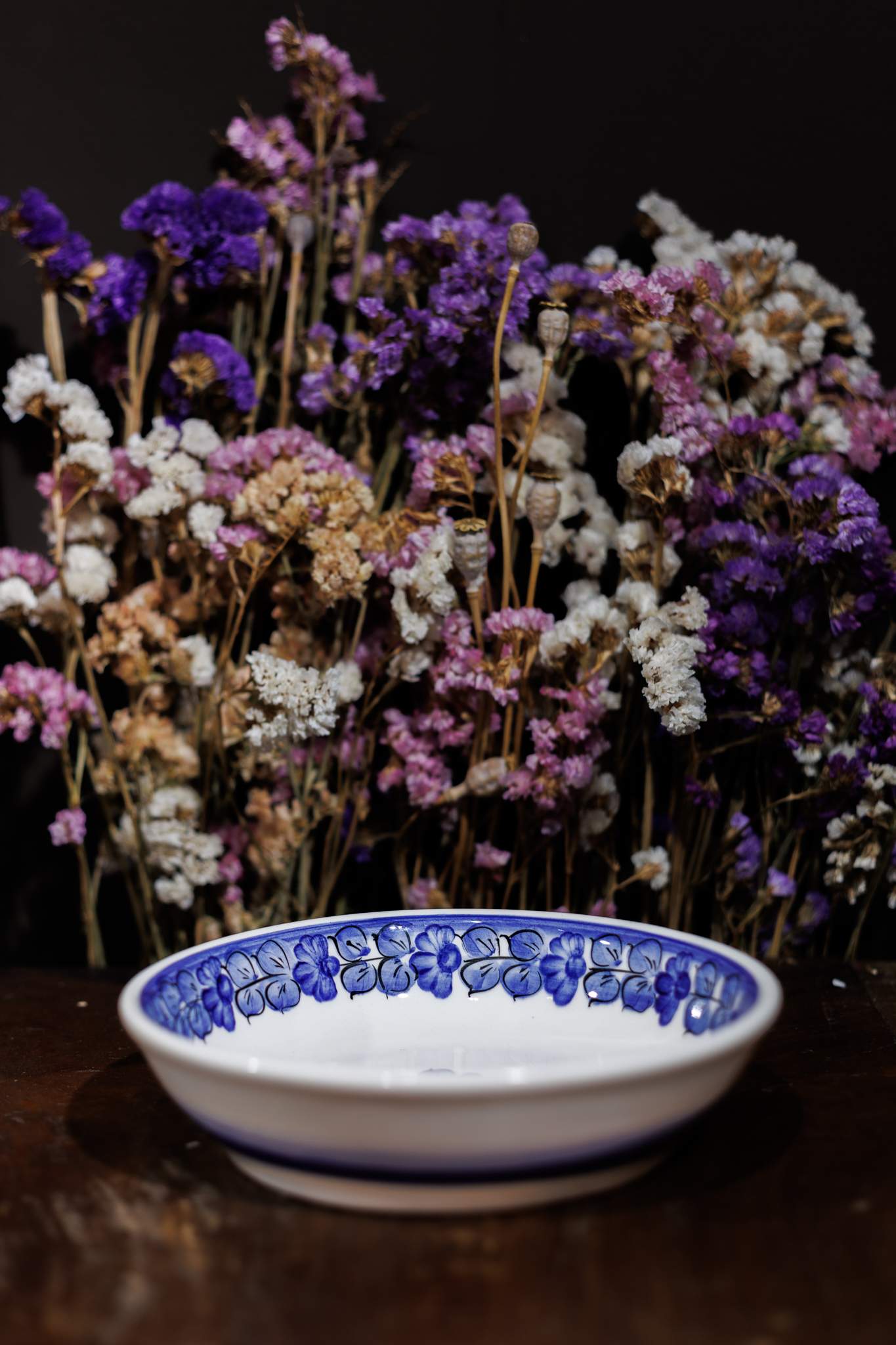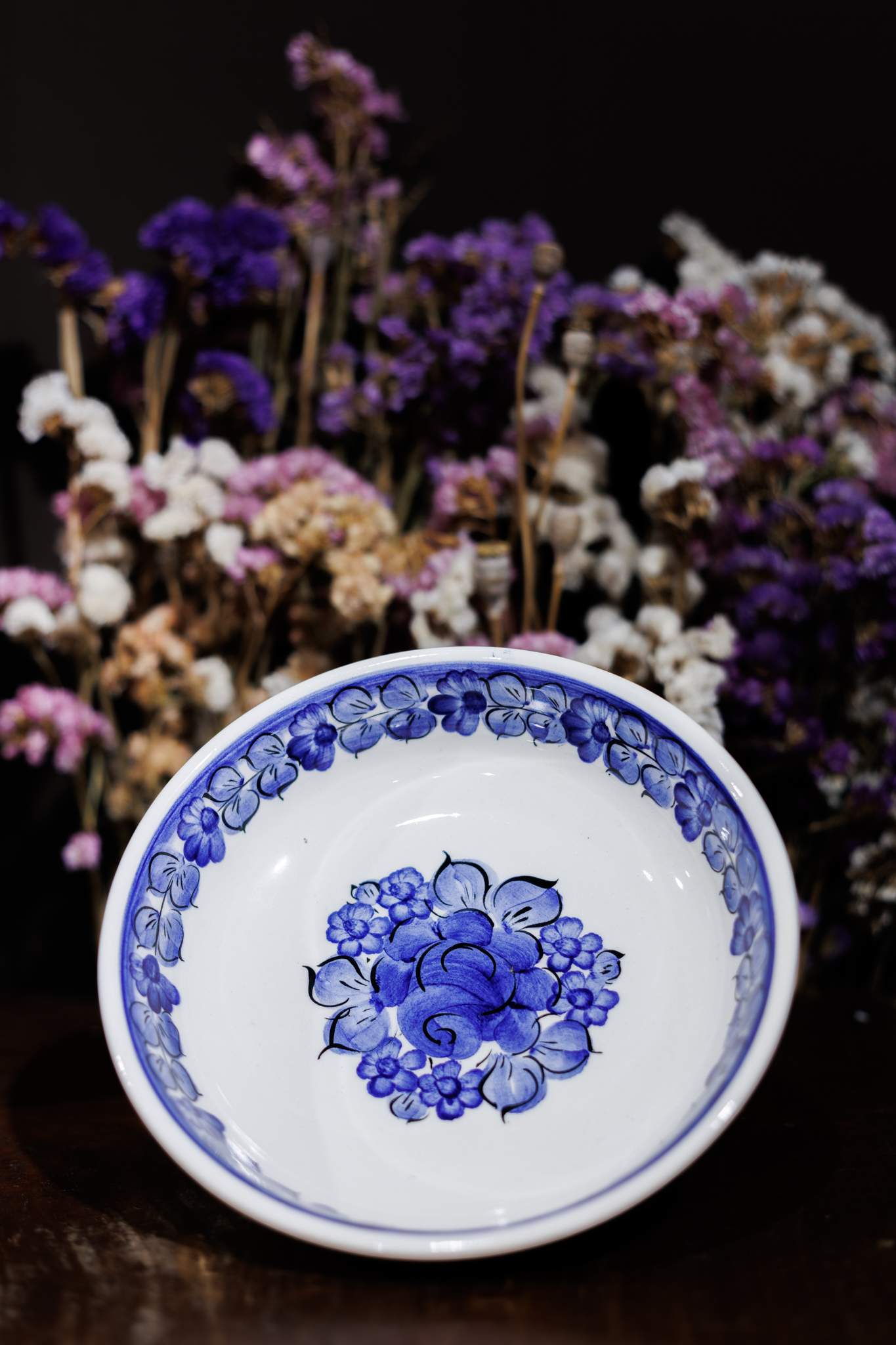 Płaska miska z Fajansu Włocławek o średnicy 19 cm. Wyróżnia się klasycznym designem. Jej biała powierzchnia zdobiona jest ręcznie malowanym kobaltowym wzorem kwiatowym. Kontrast między białym tłem a głębokim niebieskim wzorem tworzy wyrazisty efekt. Miska jest pokryta szkliwem, co zapewnia jej trwałość, połysk i ochronę wzoru.