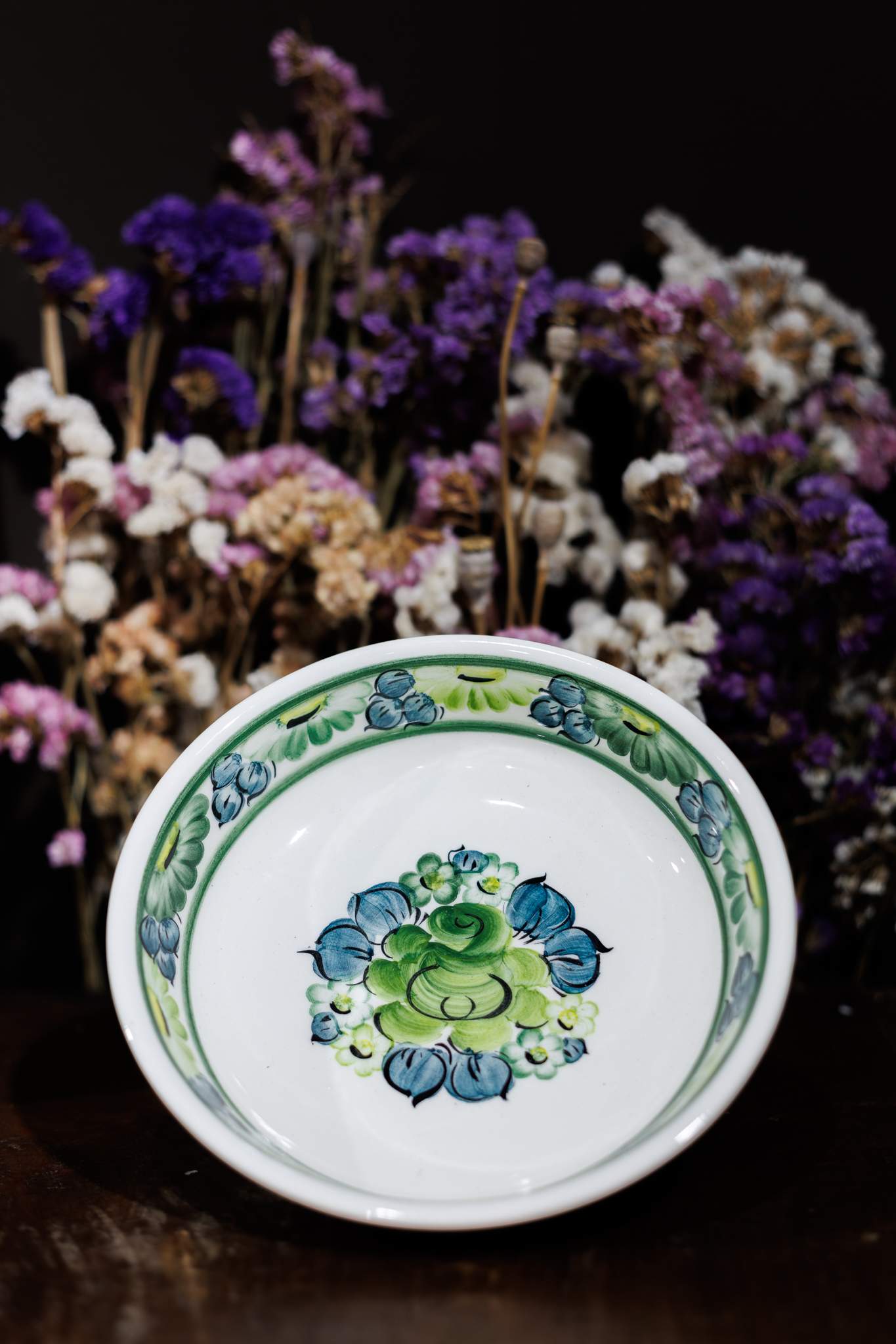 Płaska miseczka z klasycznym, zielonym wzorem z Fajansu Włocławek.