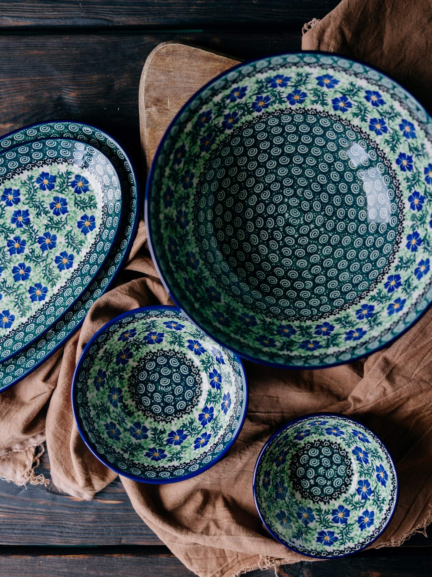 Rozszerzeniem tego wzoru są tak zwane pawie oczka. Stempelek w formie kobaltowego kółka uzupełniony jest mniejszym, zielonym okręgiem i brązowym punktem wewnątrz. Pawie oczka, na kremowym tle naczynia, często uzupełniane są jeszcze liniami w kolorze niebieskim. Ręcznie malowane wzory powodują, że każde naczynie jest unikalne i mogą między nimi występować minimalne różnice w zdobnictwie. Jednak bez precyzyjnych rąk i umiejętnych ruchów Twórcy Ludowego żadne naczynie samo nie powstanie.