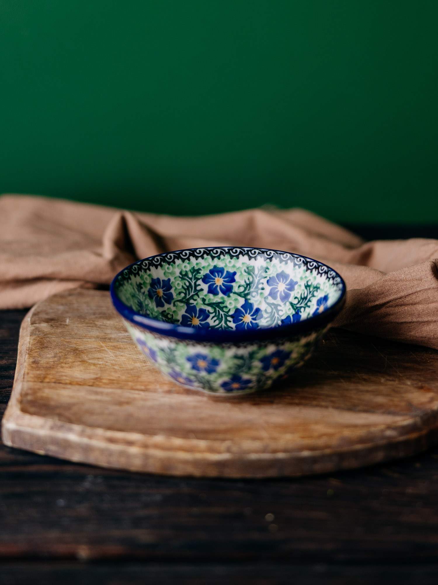 Mała miska o okrągłym kształcie. Jasna ceramika została ozdobiona ręcznie, kobaltowo-zielonym wzorem chabrów. Miska posiada delikatnie grubszy brzeg, który pomaga utrzymać ją w dłoniach. Naczynie zostało wykonane w „Ceramice Artystycznej” w Bolesławcu.