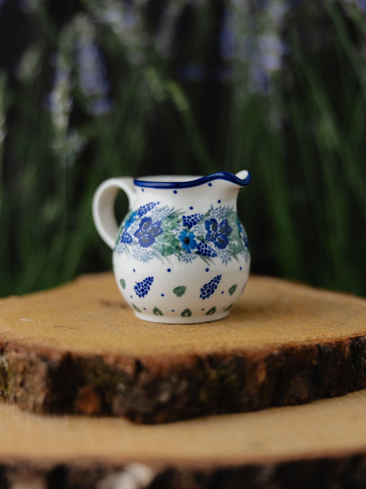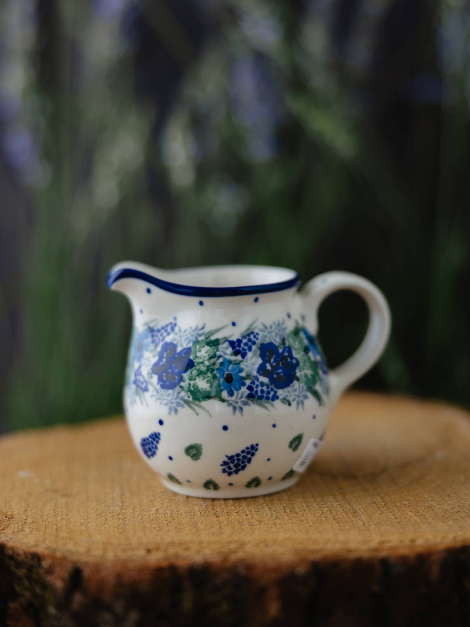 Ceramiczny dzbanuszek na mleko o zaokrąglonej formie, ozdobiony kwiatowym, kobaltowo-zielonym wzorem wianka.