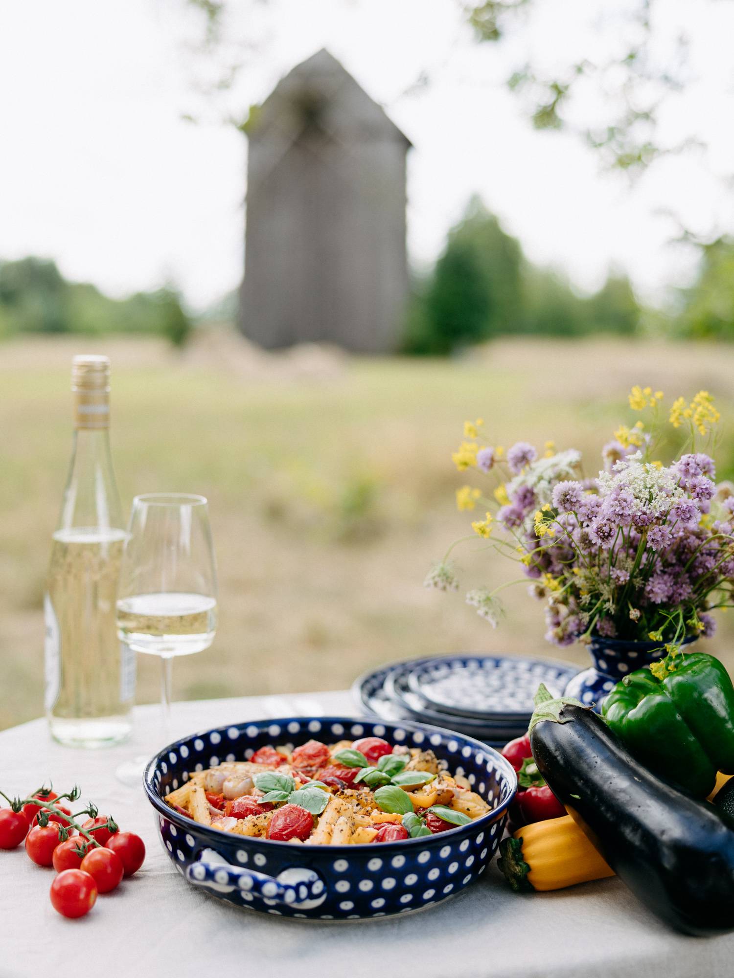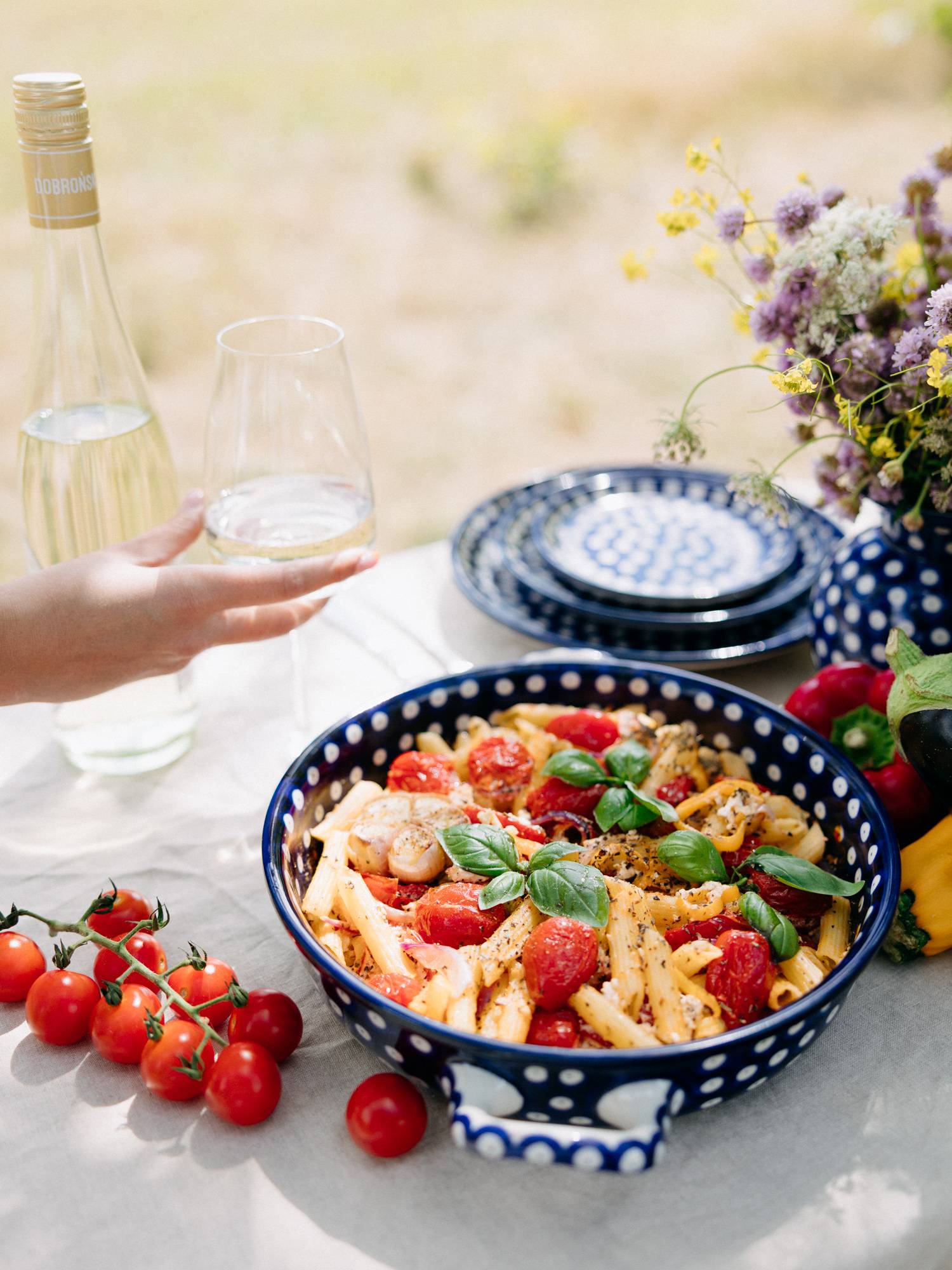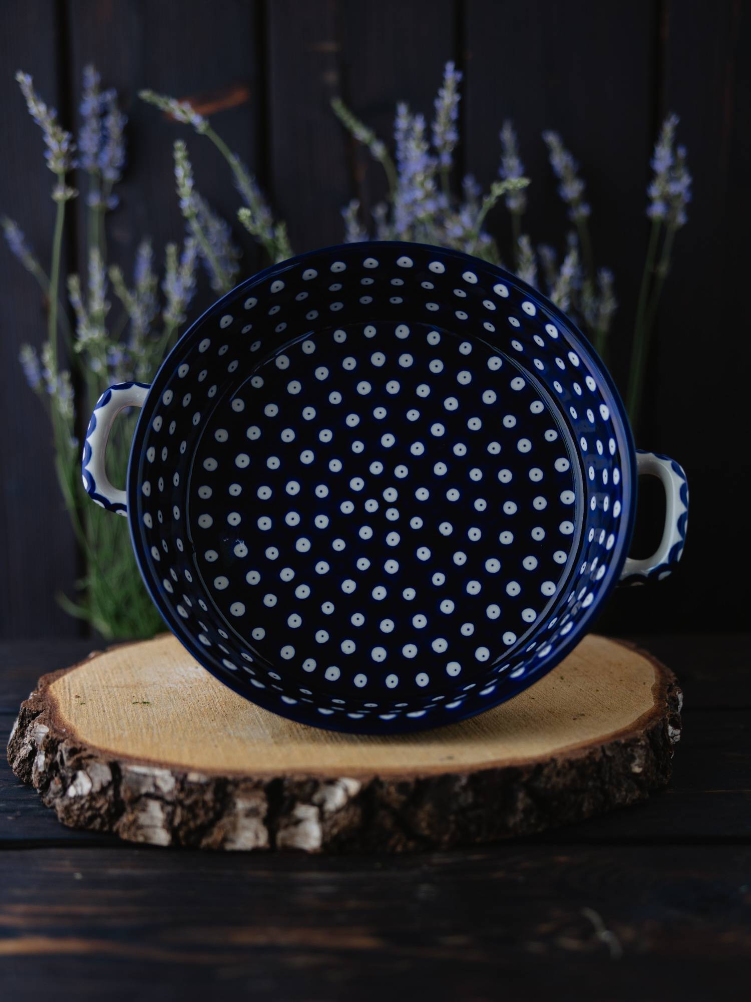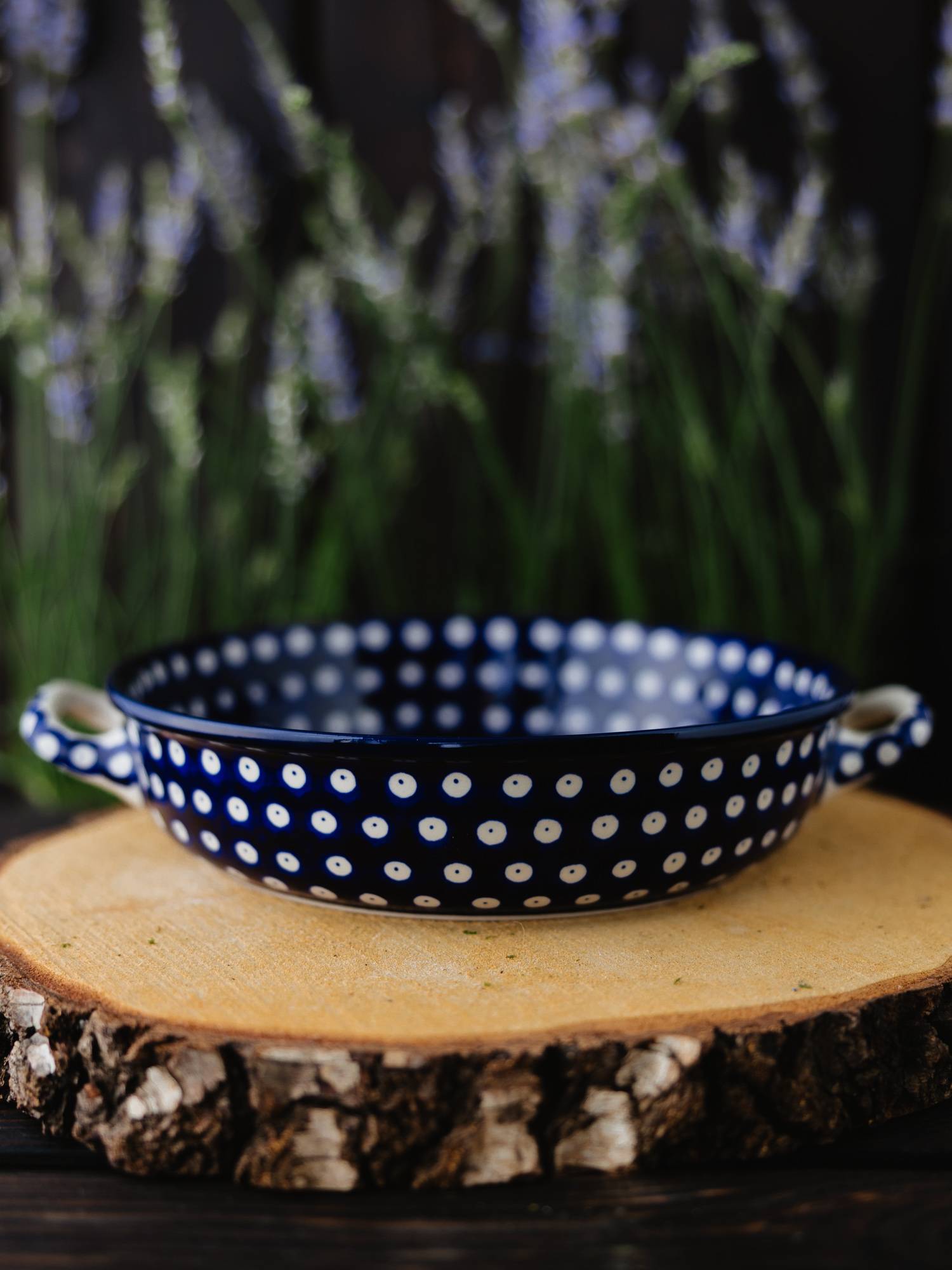 Okrągłe naczynie do zapiekania potraw. Jasna ceramika została ozdobiona ręcznie, kobaltowym wzorem groszków. Zapiekanka posiada dwa wygodne, delikatnie wywinięte uchwyty po bokach. Brzegi naczynia są lekko uniesione i tworzą prostą, równą linię. Szerokość naczynia zestawiono z niskimi ściankami, co pozwala na dokładne zapieczenie przyrządzanej potrawy. Zapiekanka została wykonana w „Ceramice Artystycznej” w Bolesławcu.