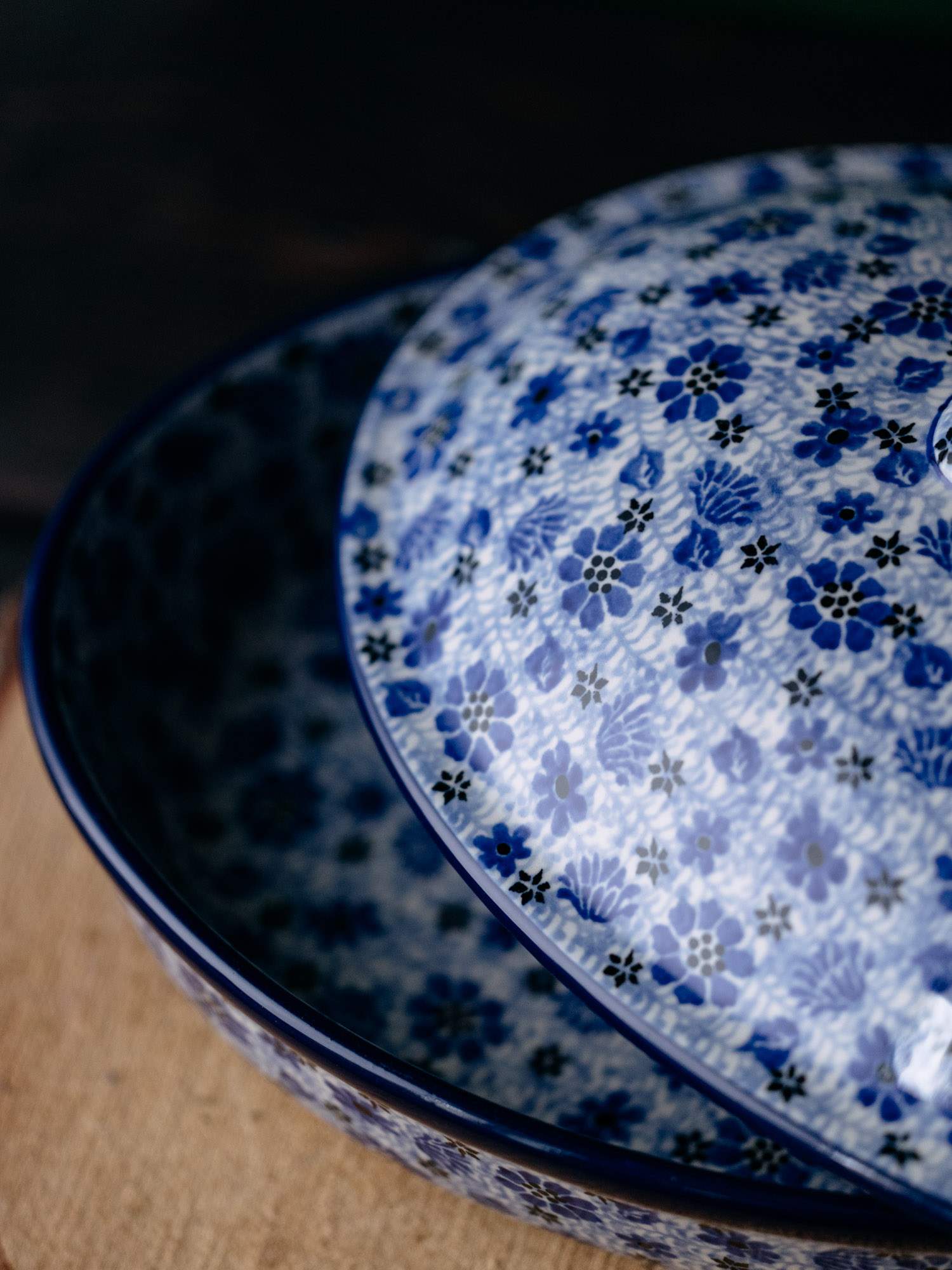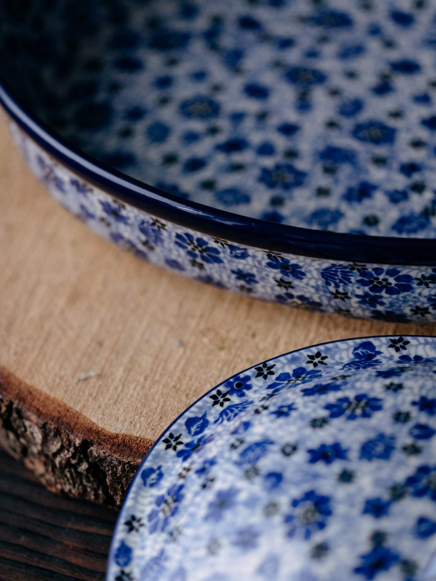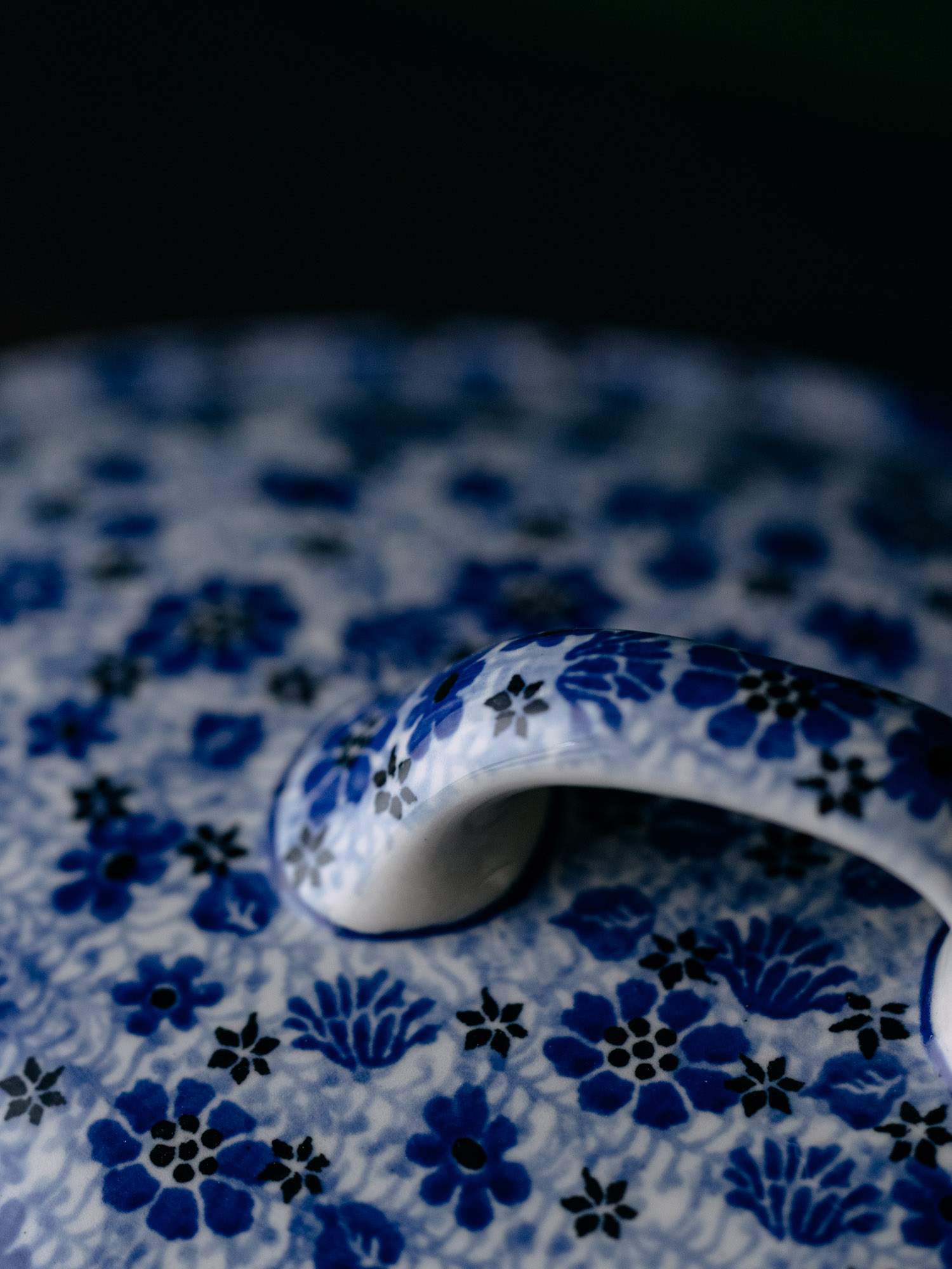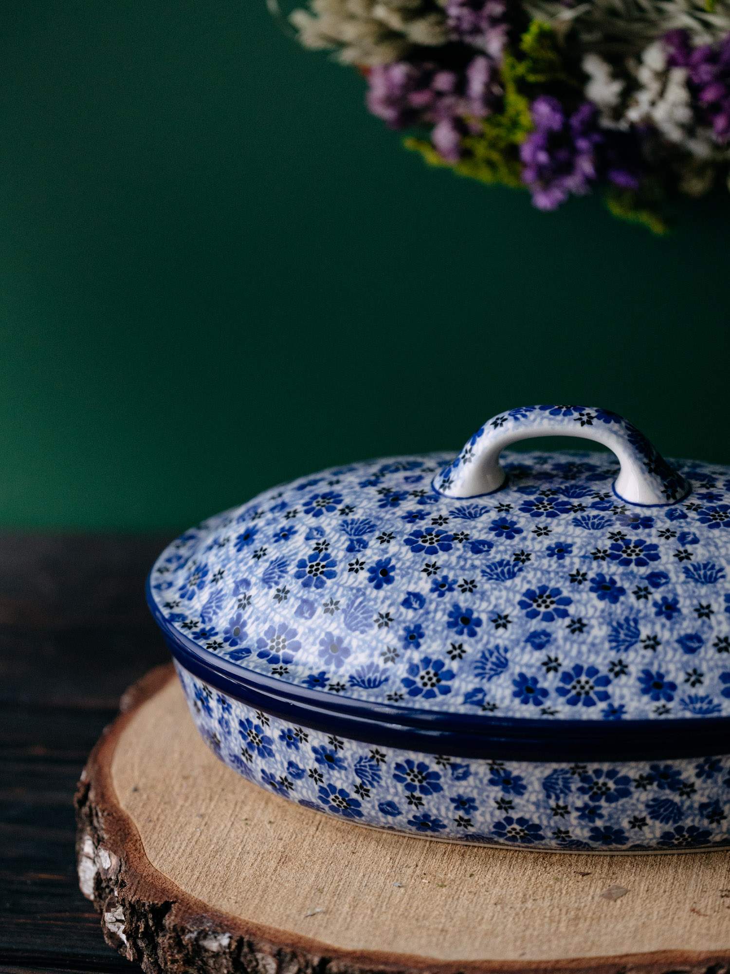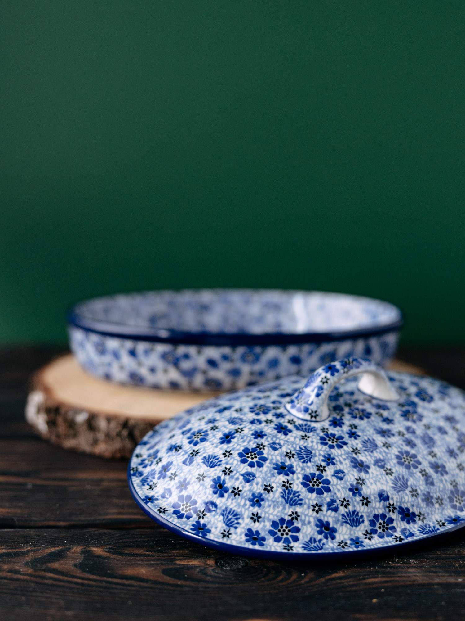 Owalne naczynie do zapiekania potraw w zestawie z pokrywką. Jasna ceramika została ozdobiona ręcznie, niebiesko-kobaltowym wzorem łąki. Pokrywka w kształcie łagodnej kopuły posiada wygodne, duże ucho na szczycie. Szerokość naczynia zestawiono z niskimi ściankami, co pozwala na dokładne zapieczenie przyrządzanej potrawy. Zapiekanka została wykonana w „Ceramice Artystycznej” w Bolesławcu.