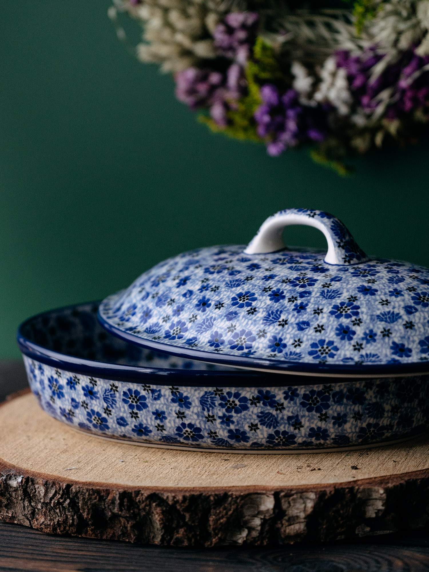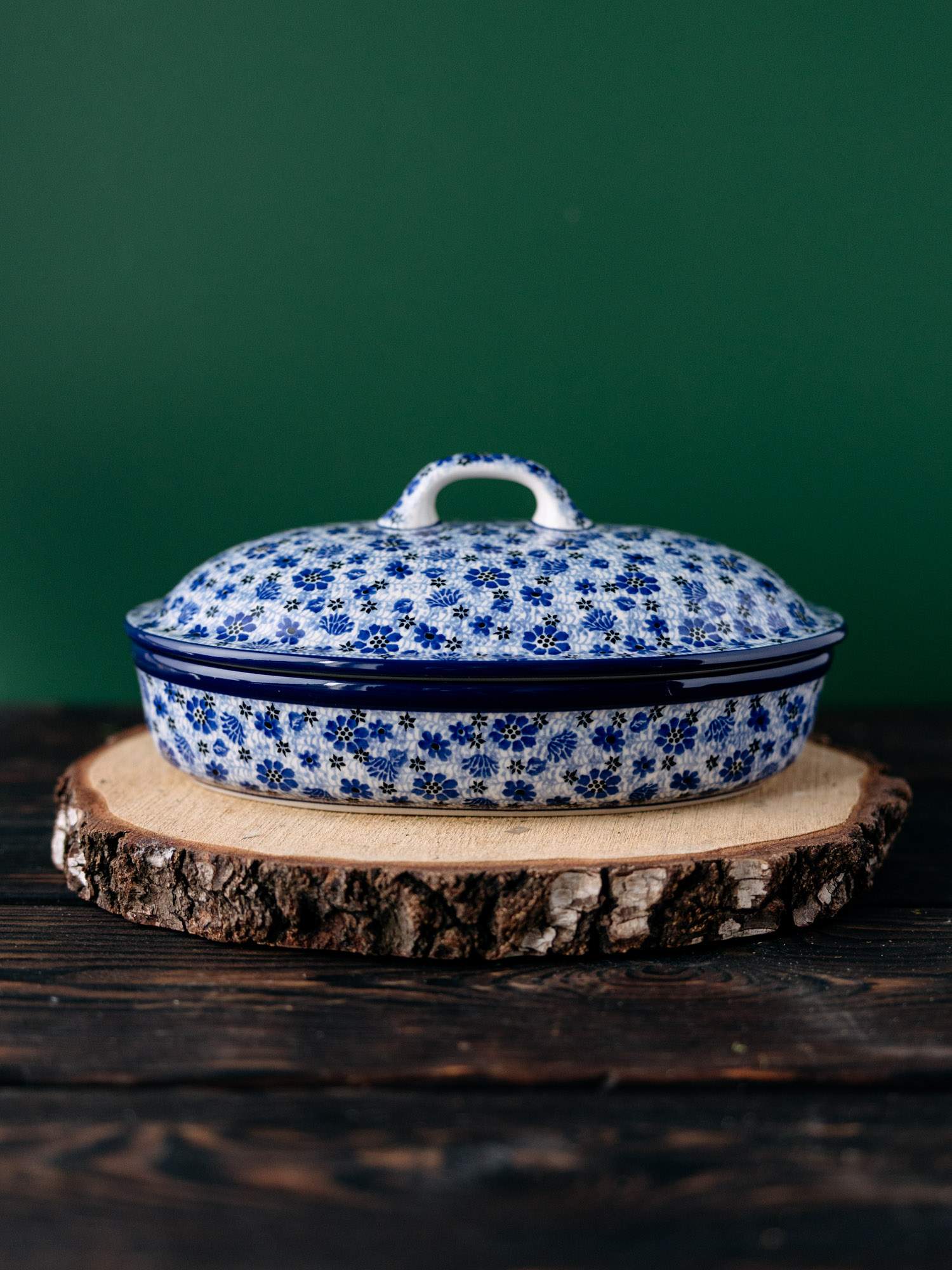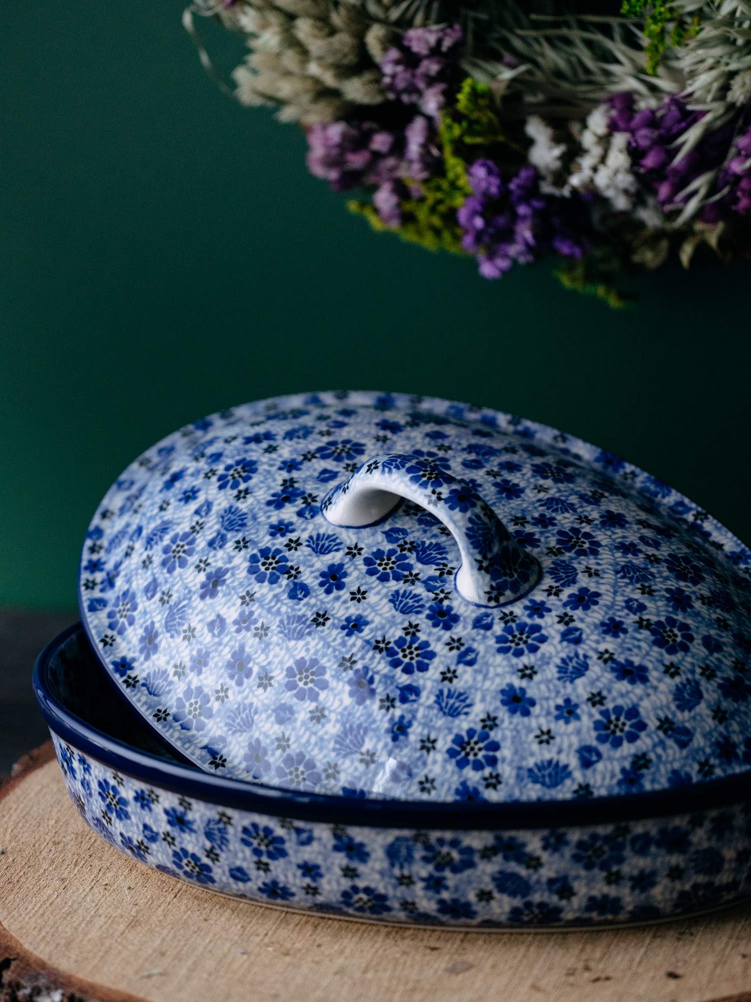 Owalne naczynie do zapiekania potraw w zestawie z pokrywką, gęsto ozdobione niebiesko-kobaltowym wzorem kwiatowej łąki.