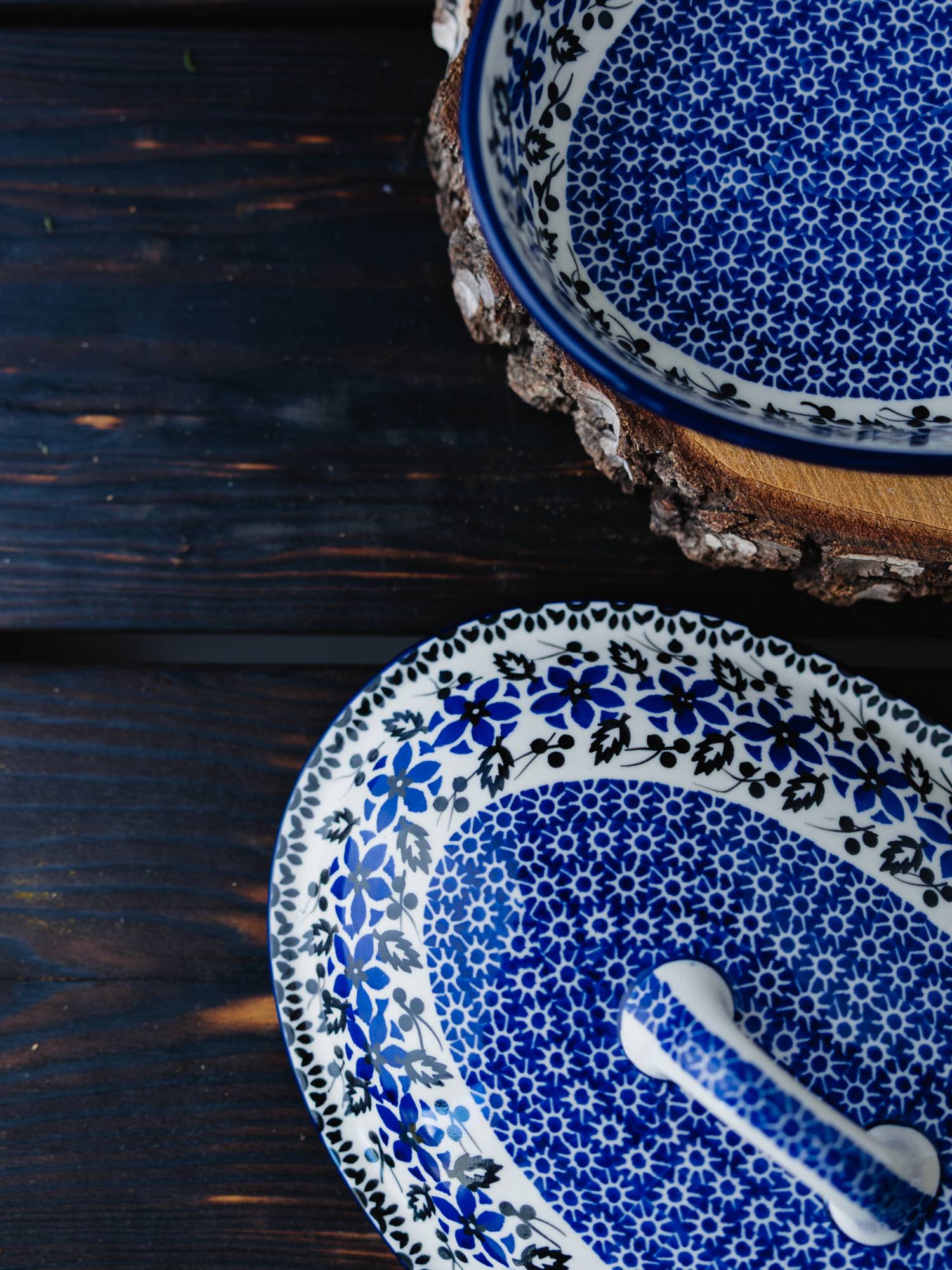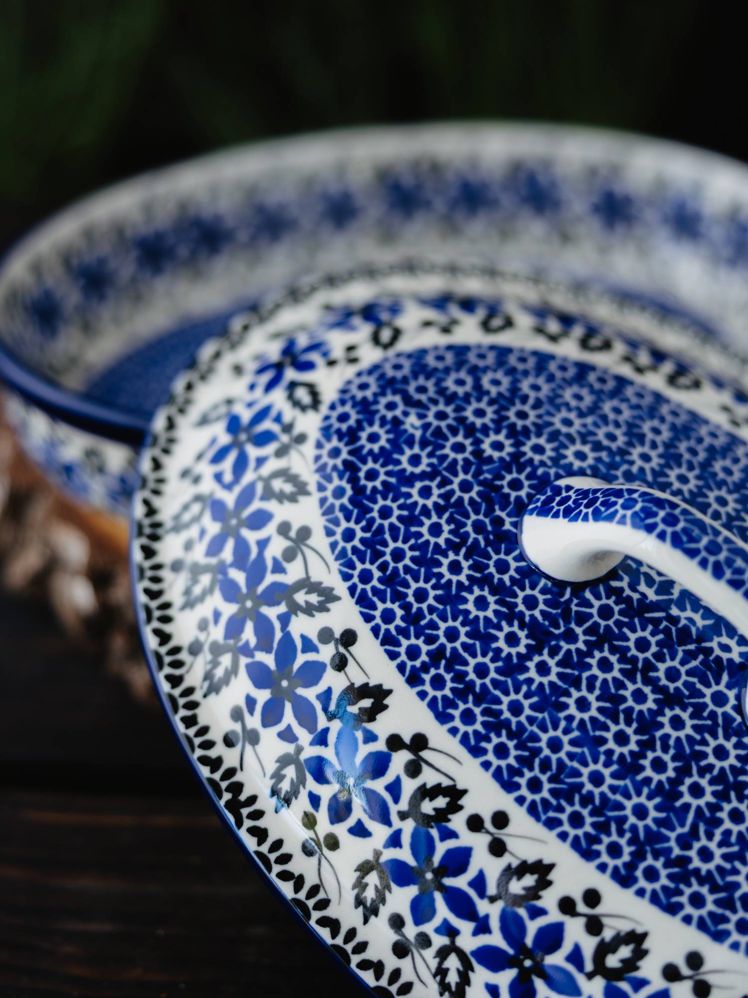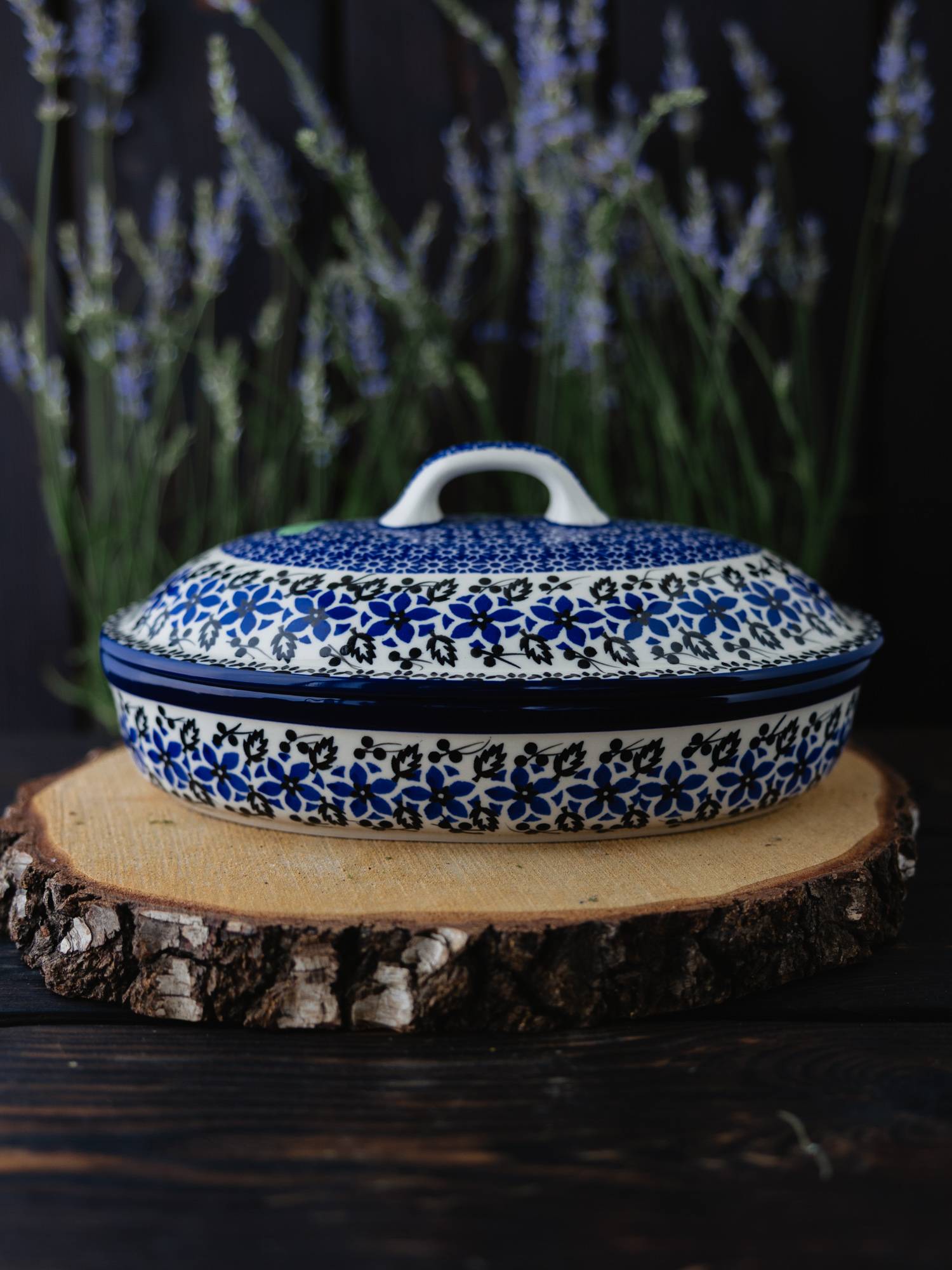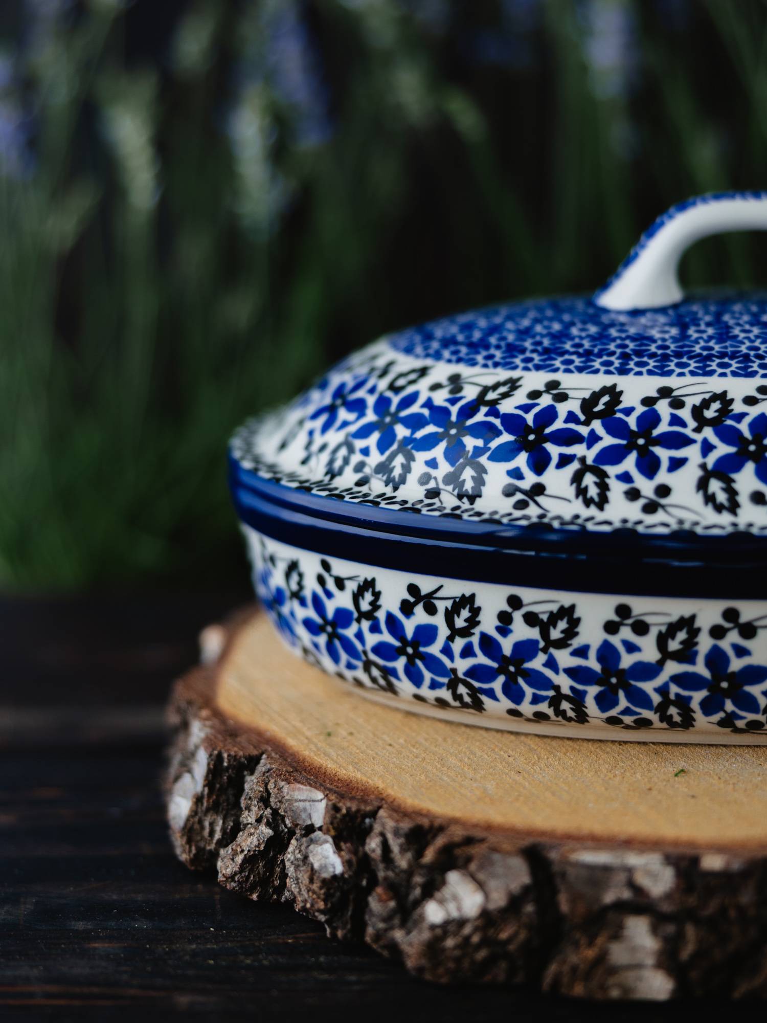 Owalne naczynie do zapiekania potraw w zestawie z pokrywką. Jasna ceramika została ozdobiona ręcznie, kobaltowo-czarnym wzorem polnych kwiatów. Pokrywka w kształcie łagodnej kopuły posiada wygodne, duże ucho na szczycie. Szerokość naczynia zestawiono z niskimi ściankami, co pozwala na dokładne zapieczenie przyrządzanej potrawy. Zapiekanka została wykonana w „Ceramice Artystycznej” w Bolesławcu.